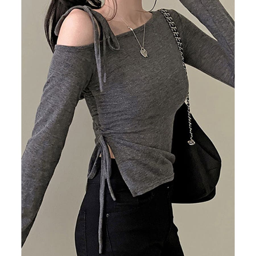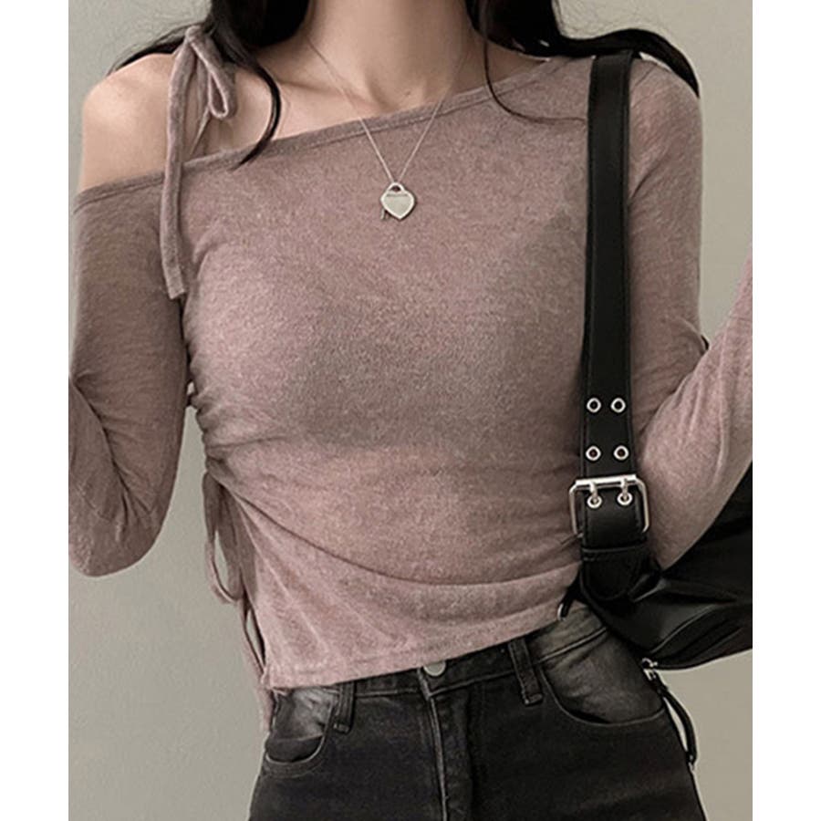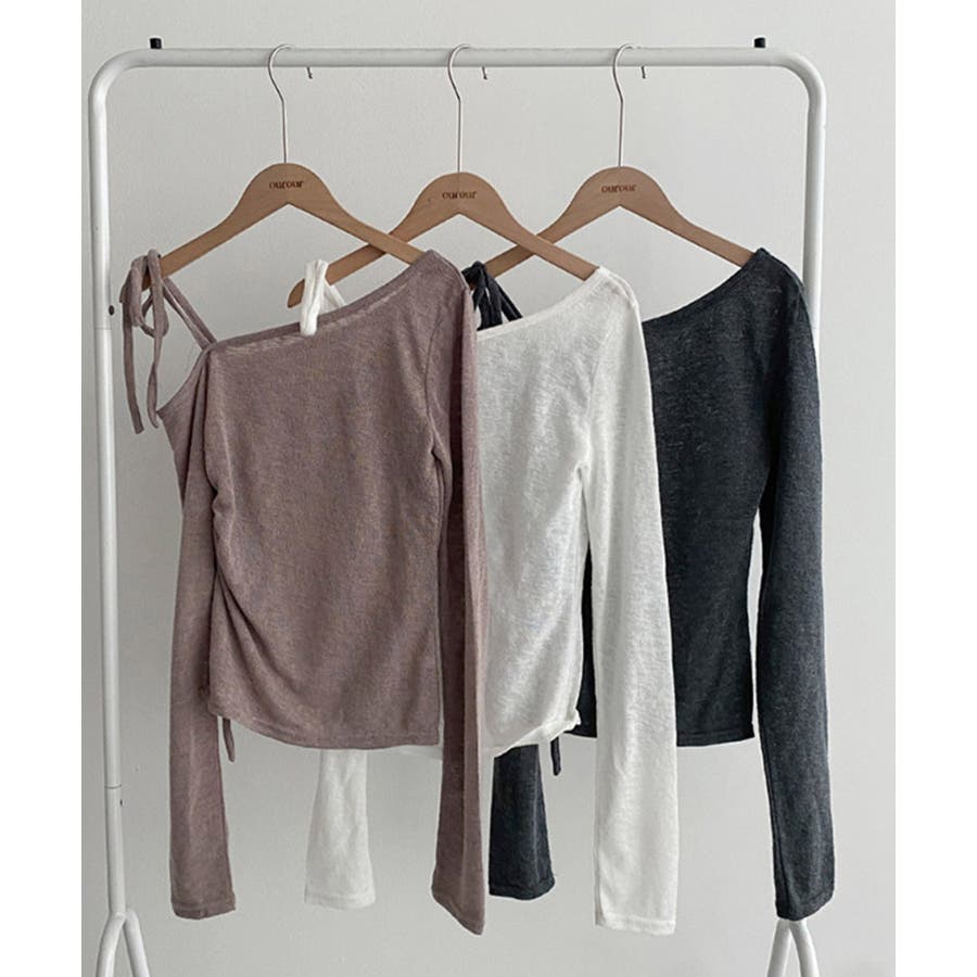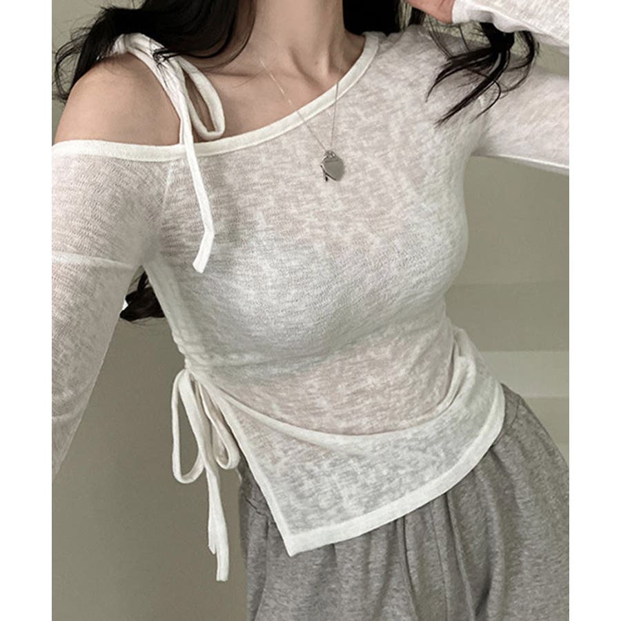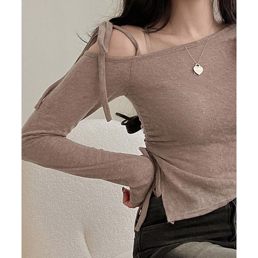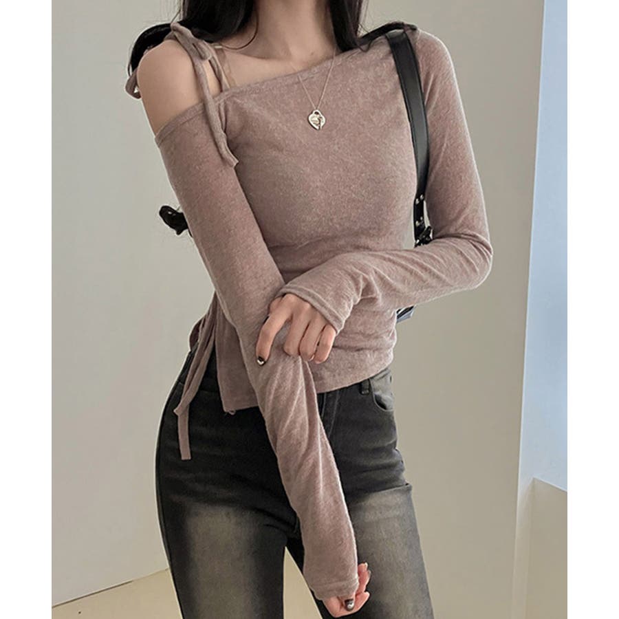 ■POINT ―――――――・肩見せデザイン:ヘルシーな肌見せが、程よい抜け感を演出。 ・シャーリング仕様:ボディラインにフィットするシャーリングで、美しいシルエットを強調。 ・リボンディテール:肩のリボンがアクセントになり、甘さと可愛らしさをプラス。 ・ショート丈デザイン:ハイウエストのボトムスやスカートと相性抜群で、スタイルアップ効果も◎・軽やかな素材感:柔らかく動きやすい素材で、春夏シーズンにぴったり。