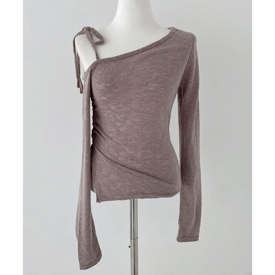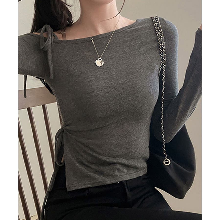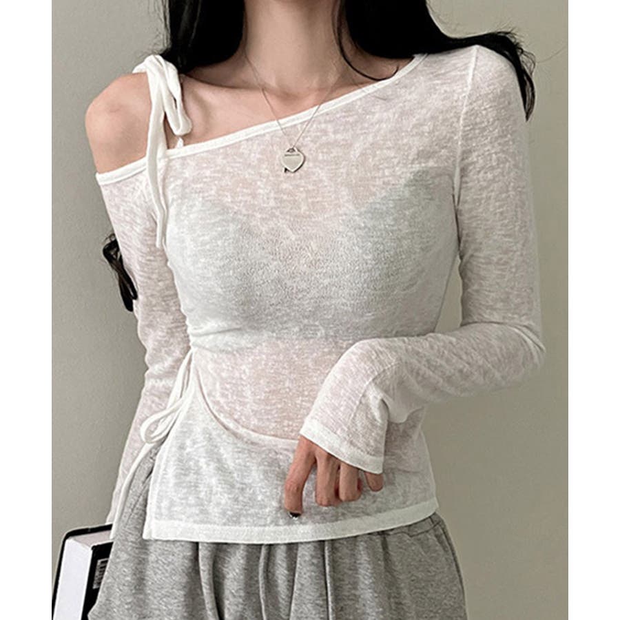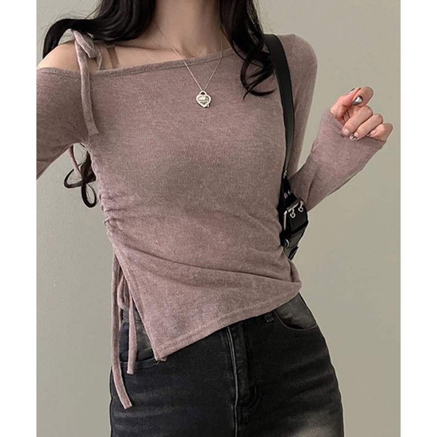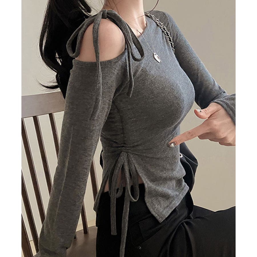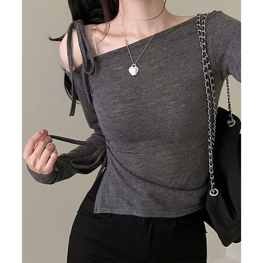 ■POINT ―――――――・肩見せデザイン:ヘルシーな肌見せが、程よい抜け感を演出。 ・シャーリング仕様:ボディラインにフィットするシャーリングで、美しいシルエットを強調。 ・リボンディテール:肩のリボンがアクセントになり、甘さと可愛らしさをプラス。 ・ショート丈デザイン:ハイウエストのボトムスやスカートと相性抜群で、スタイルアップ効果も◎・軽やかな素材感:柔らかく動きやすい素材で、春夏シーズンにぴったり。