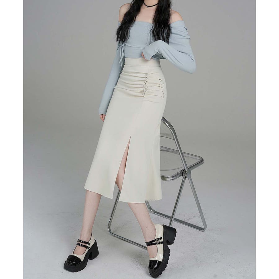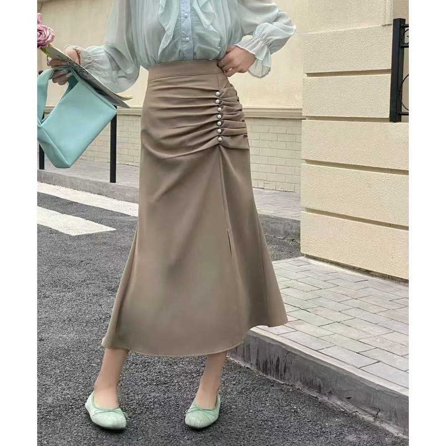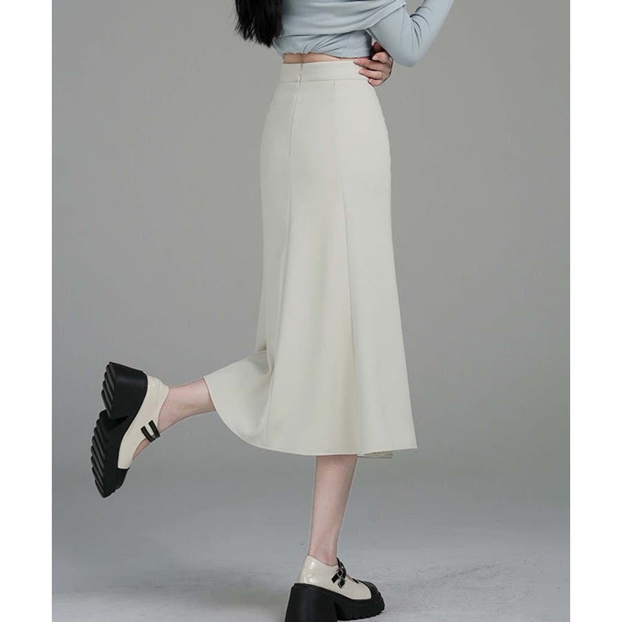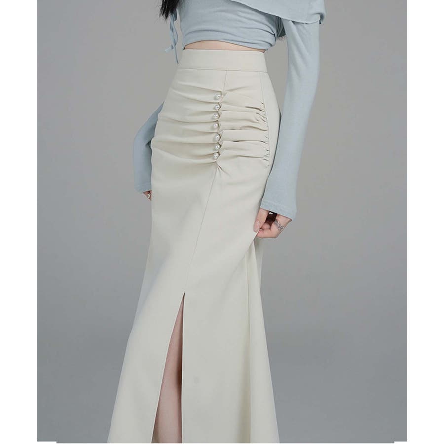 エレガントなパール装飾が、上品さを醸し出す。フロントのスリットからちらりと脚が覗くデザインにセンシュアルな雰囲気漂う。歩くたびに揺れるシルエットが大人の魅力を醸し出す。ベーシックなトップスを合わせるだけで、フェミニンなスタイリングが即完成。