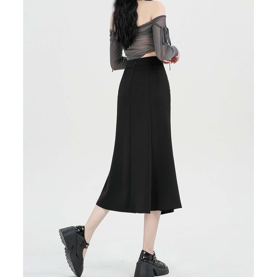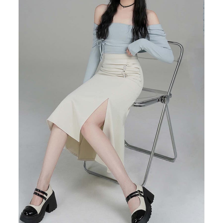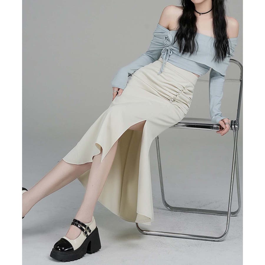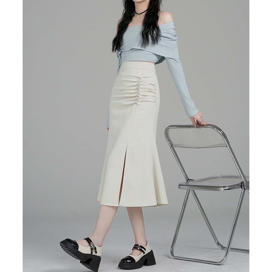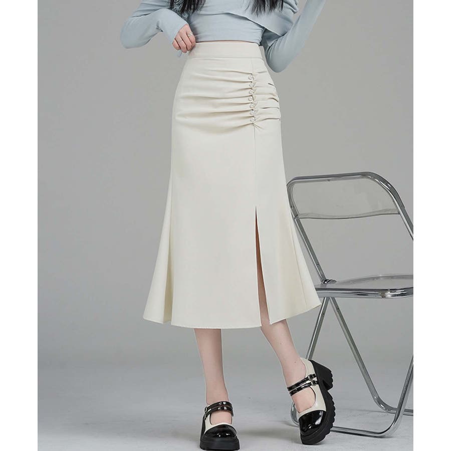 エレガントなパール装飾が、上品さを醸し出す。フロントのスリットからちらりと脚が覗くデザインにセンシュアルな雰囲気漂う。歩くたびに揺れるシルエットが大人の魅力を醸し出す。ベーシックなトップスを合わせるだけで、フェミニンなスタイリングが即完成。
