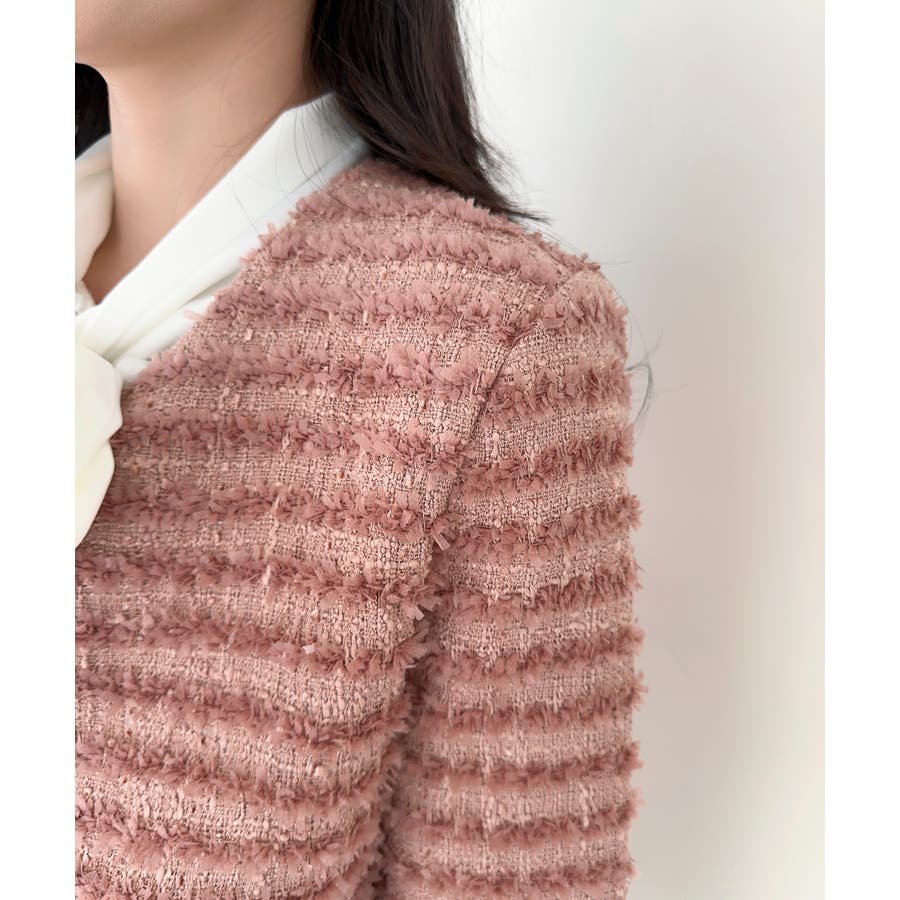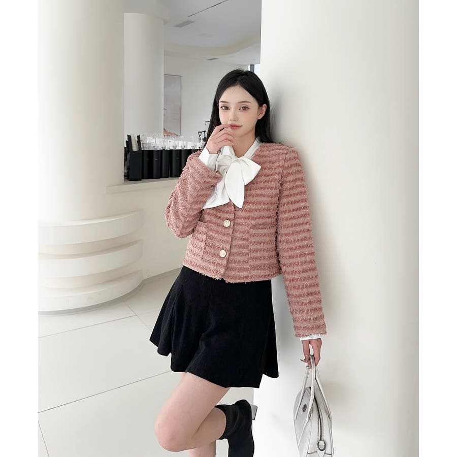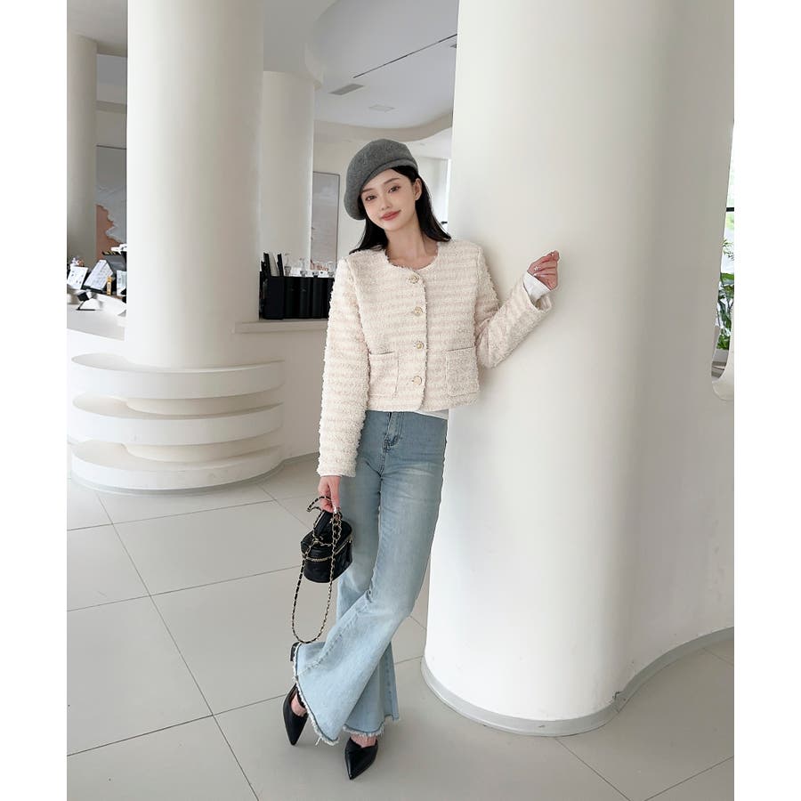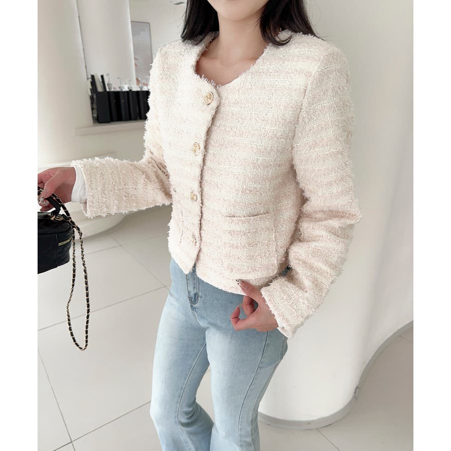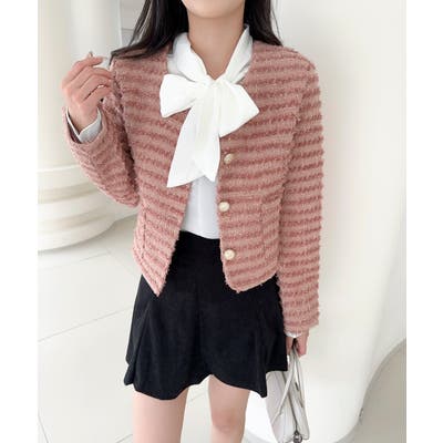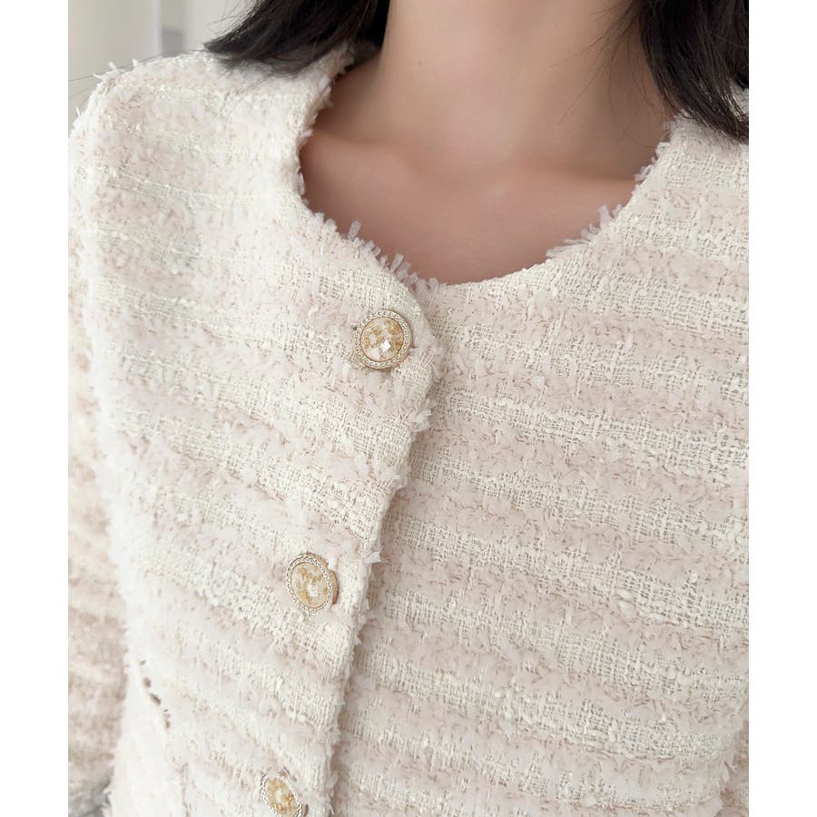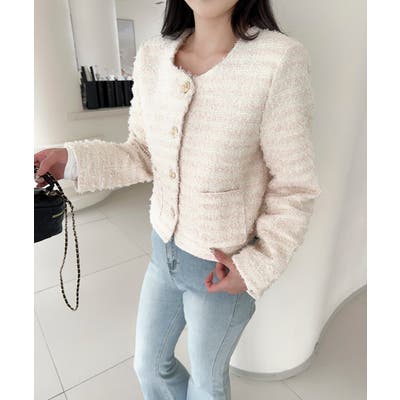 クラシカルなツイード素材に、クロップ丈のデザインがトレンドライクなジャケット。