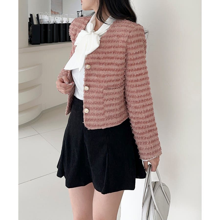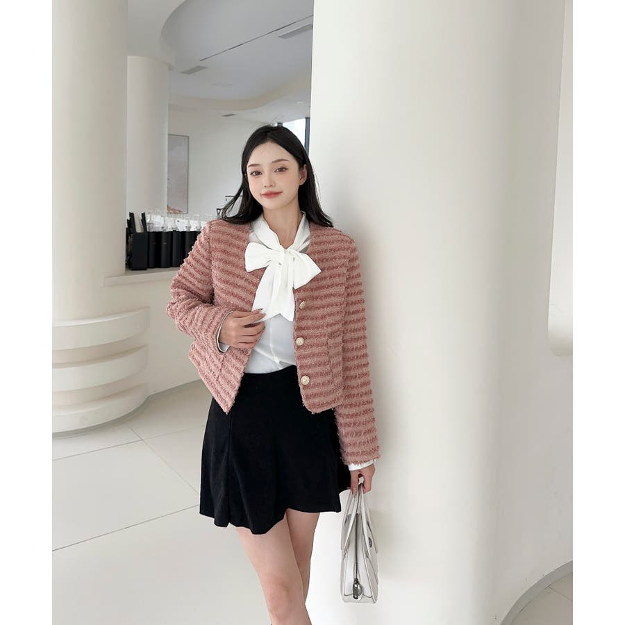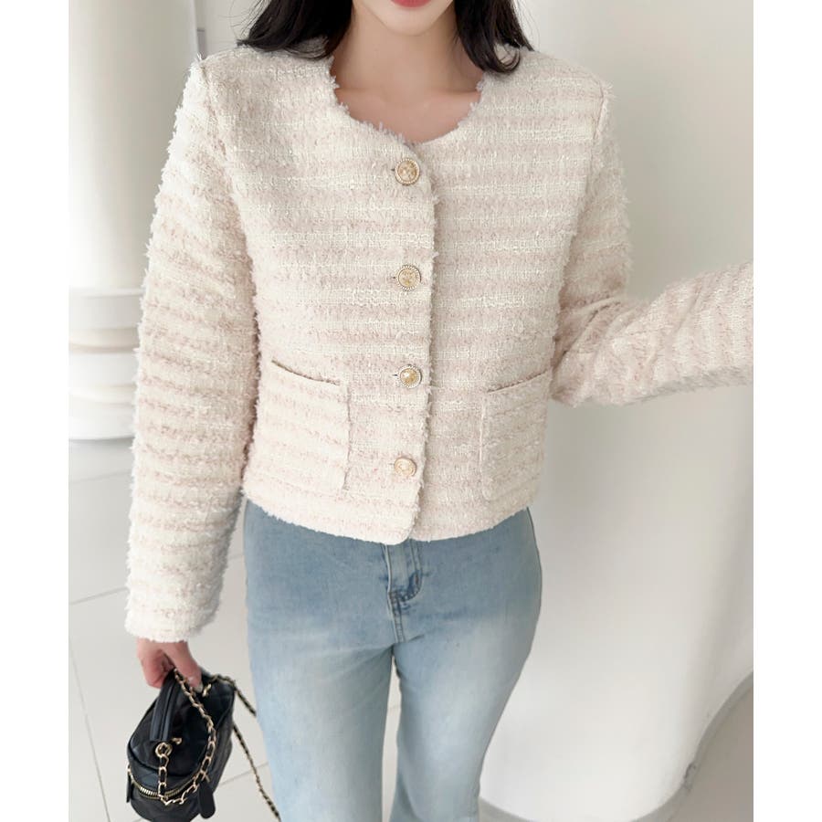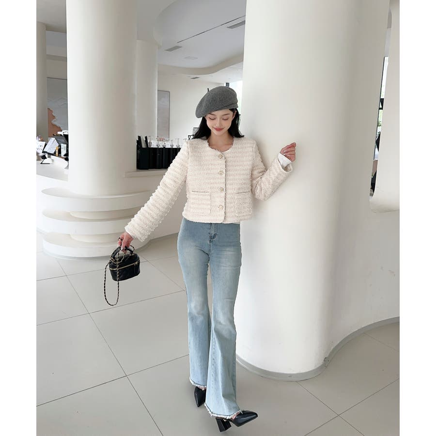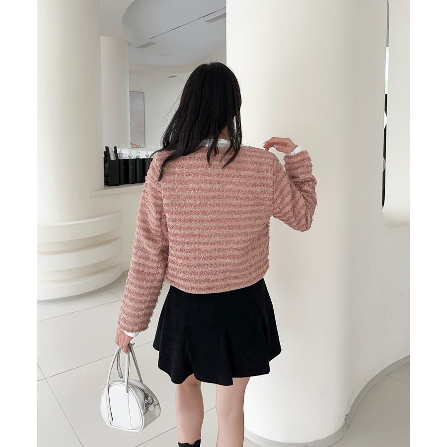 クラシカルなツイード素材に、クロップ丈のデザインがトレンドライクなジャケット。