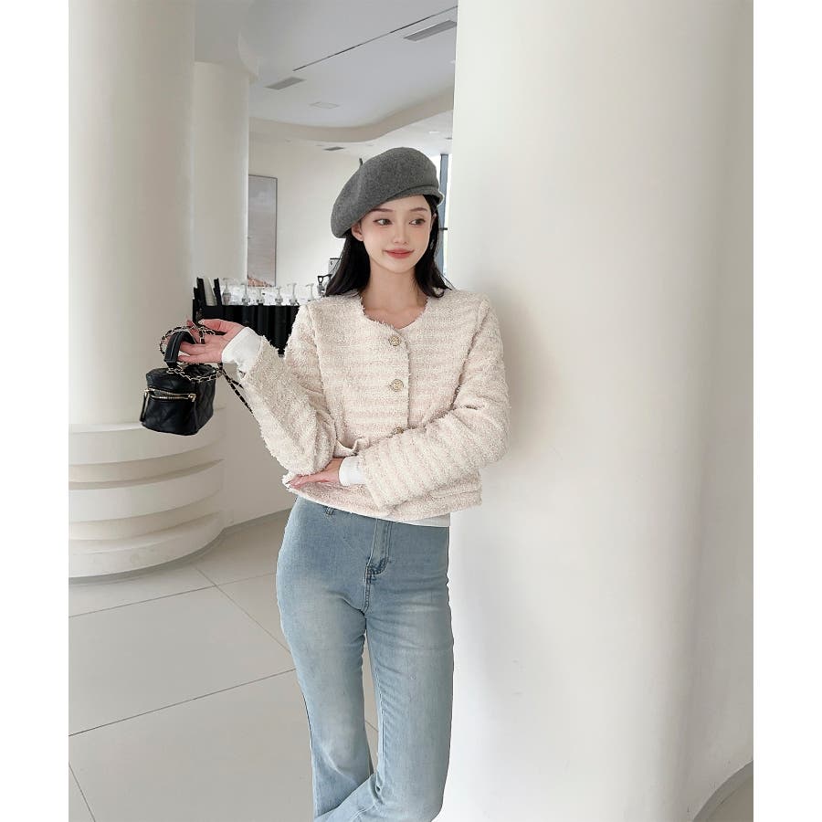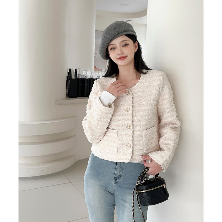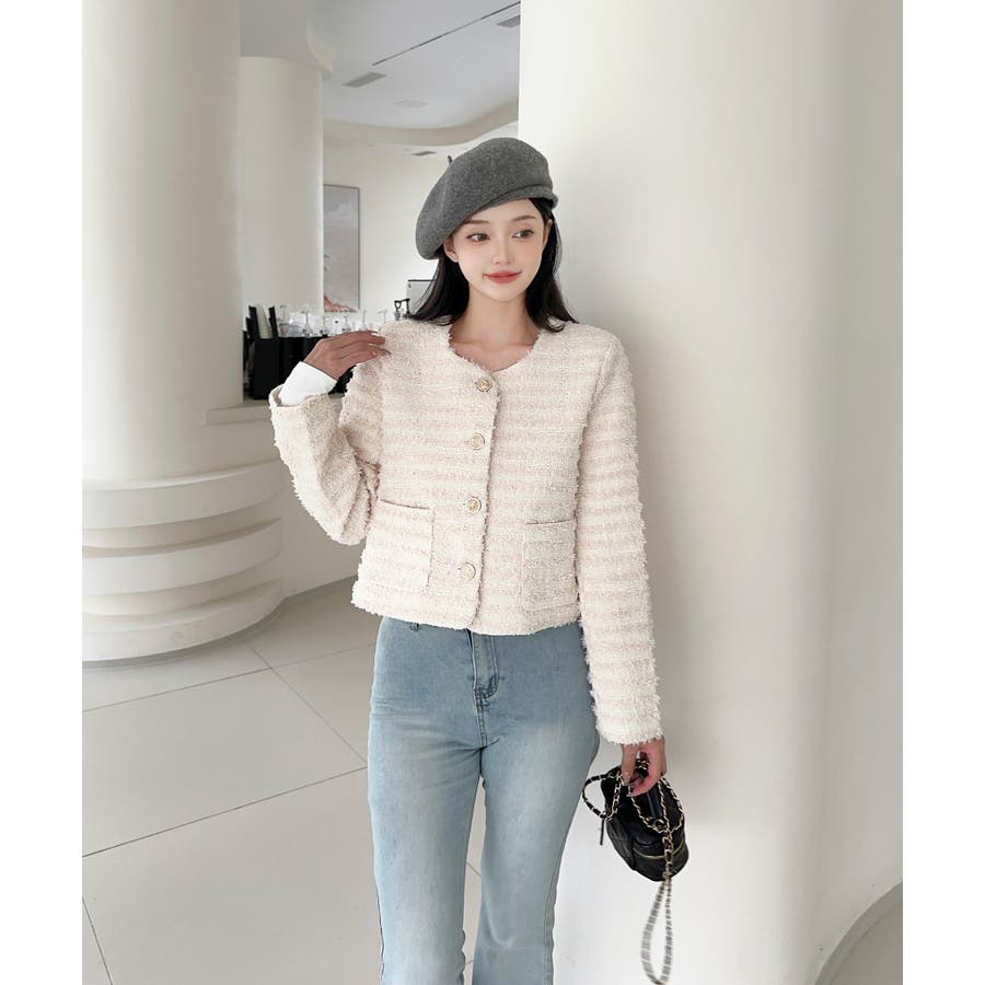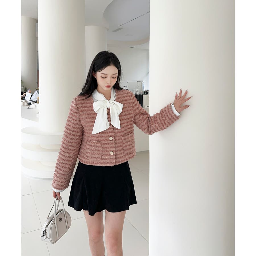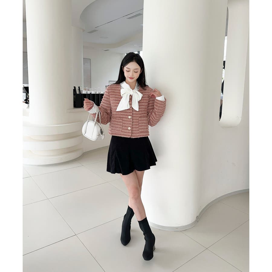 クラシカルなツイード素材に、クロップ丈のデザインがトレンドライクなジャケット。