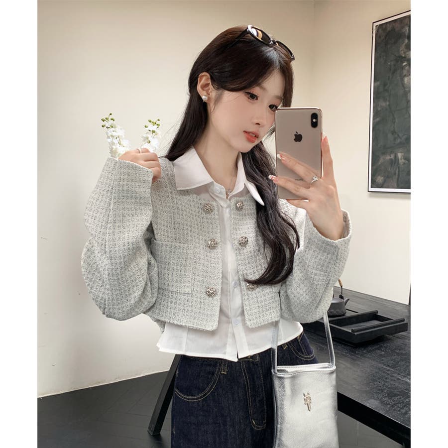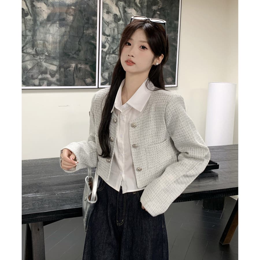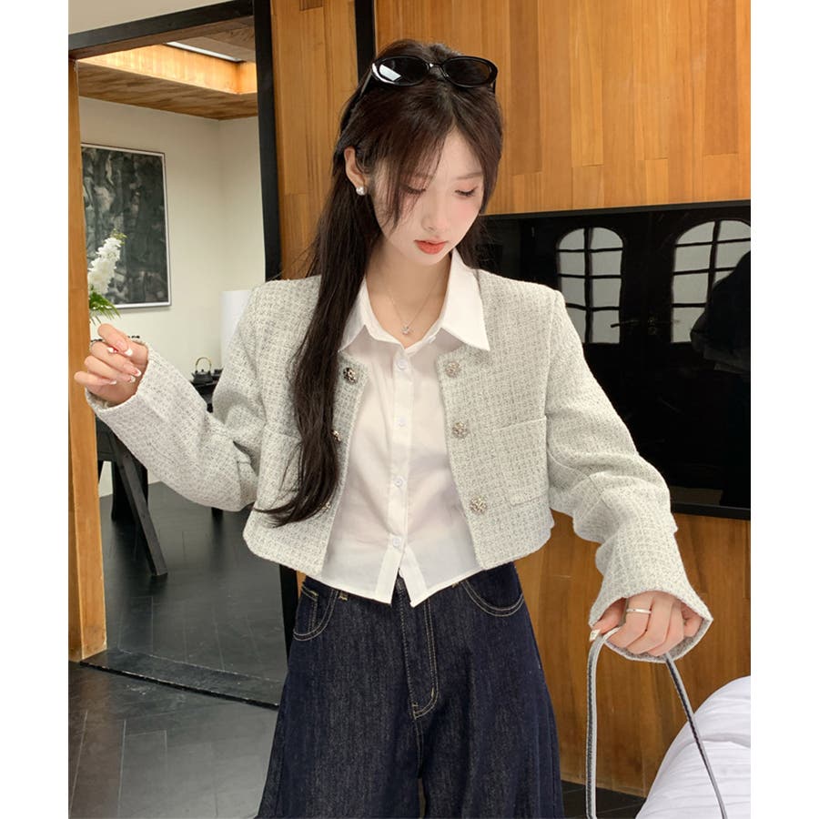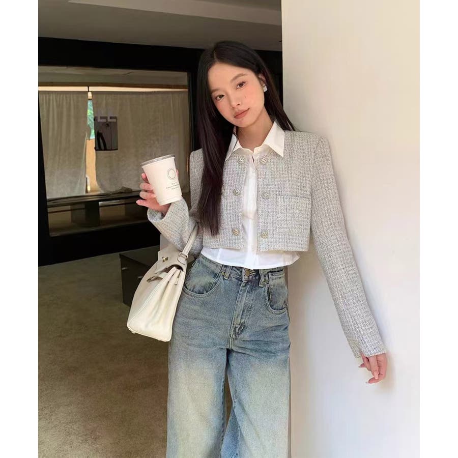 【Jasmine】千鳥柄ノンカラージャケット+グロップドシャツベスト