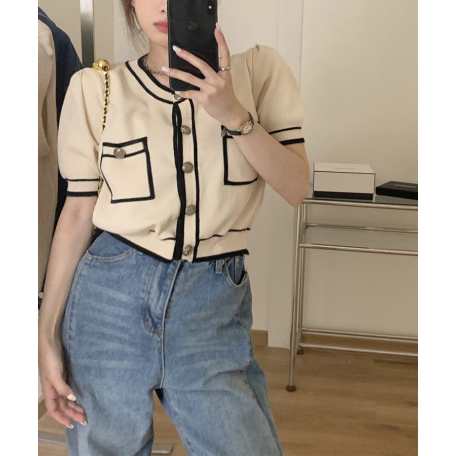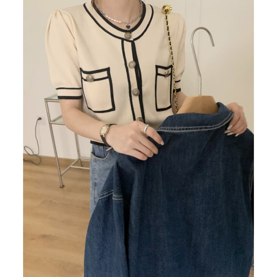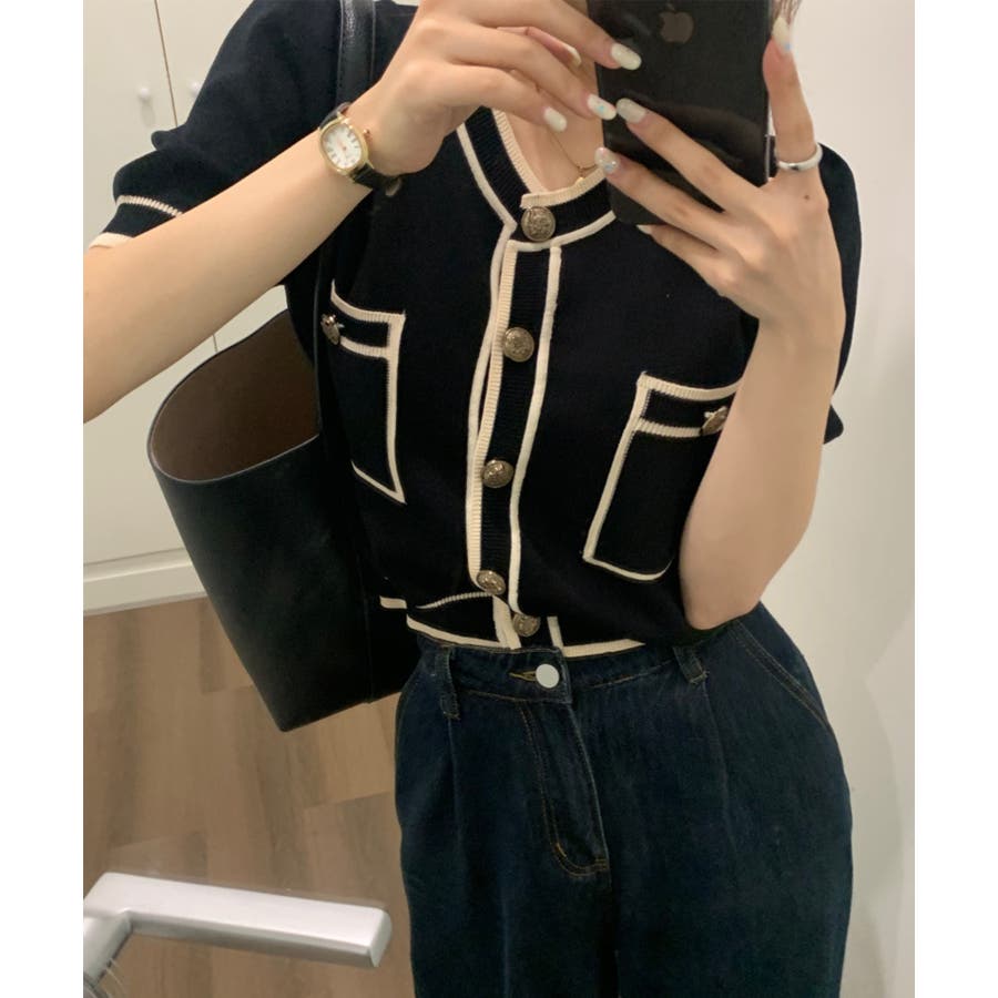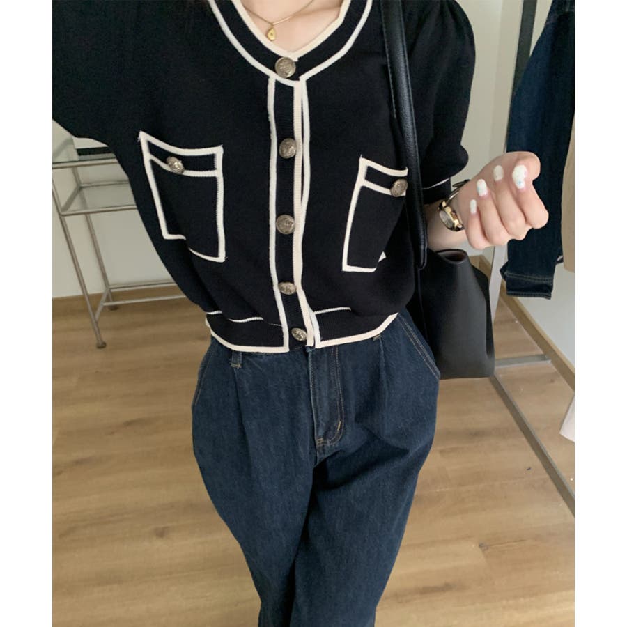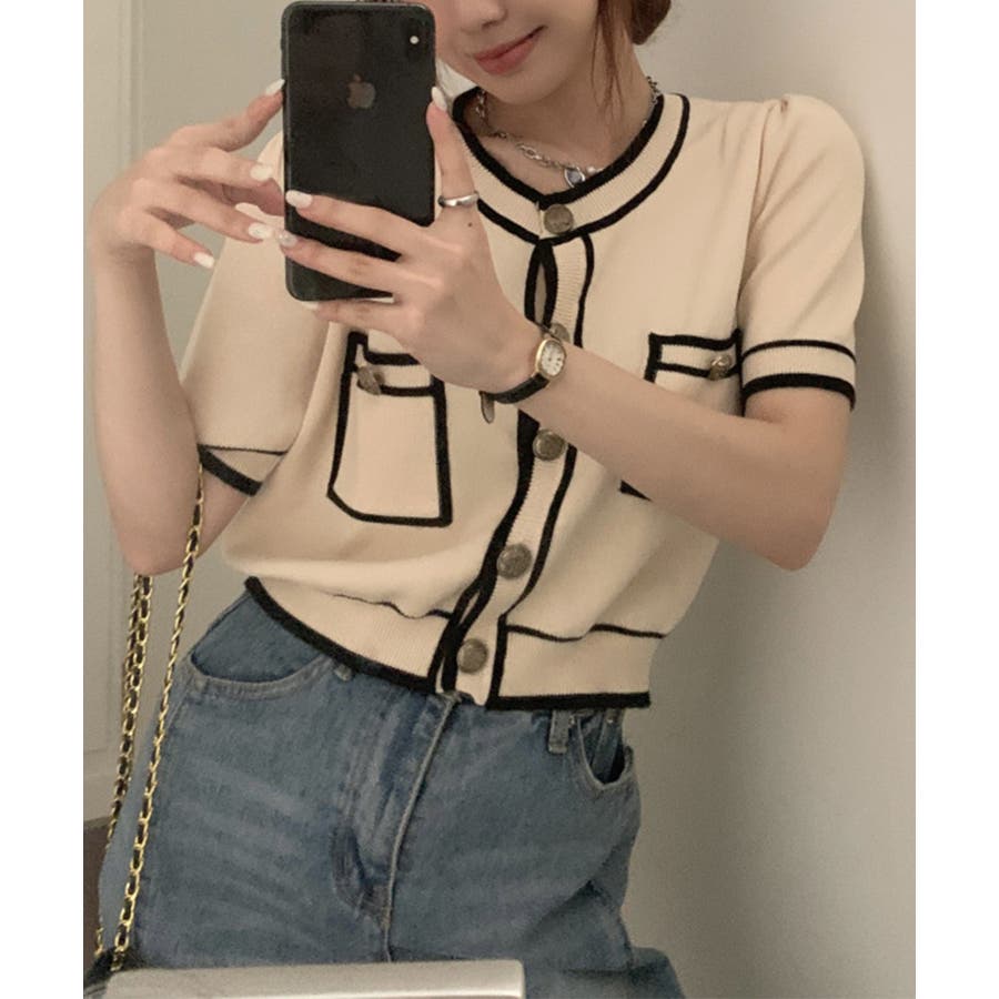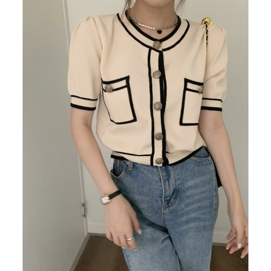 アウトリンキングのデザインが効いたカーディガン。配色と金属ボタンがそれぞれ異なるので、様々な雰囲気を楽しめます。スッキリとベーシックなラウンドネックが優しい印象に演出してくれて女性らしく着用可能です。着膨れせず、ゆとりのあるサイズ感がかわいいカーディガンです。