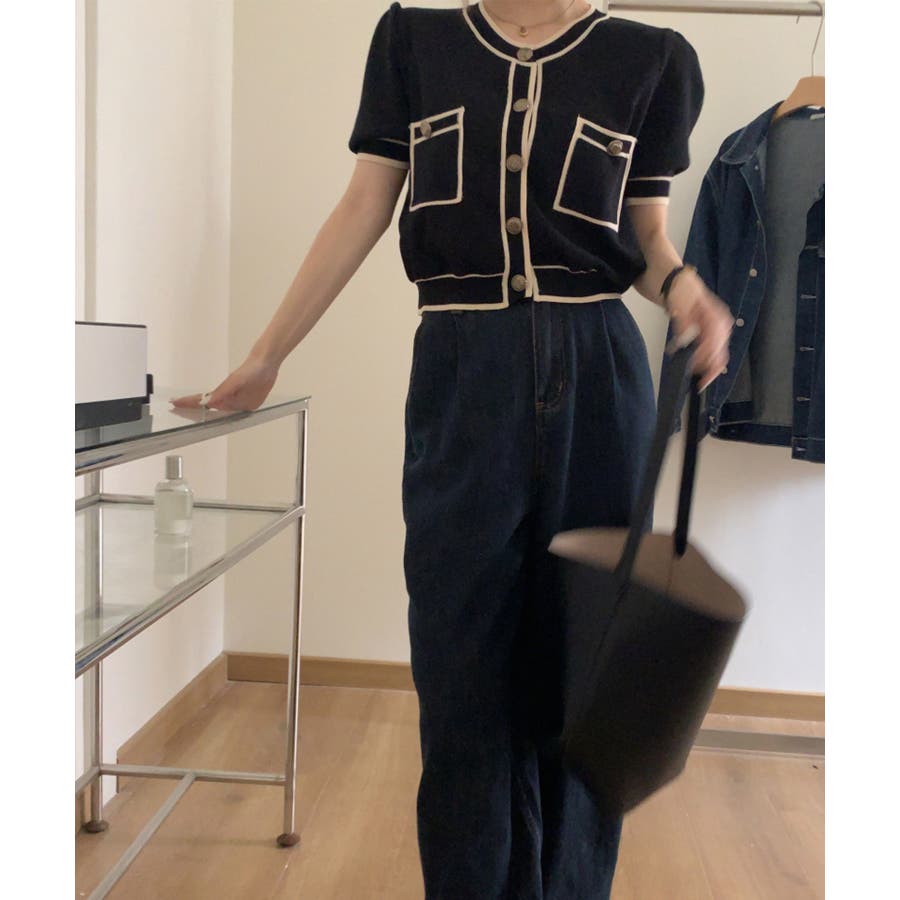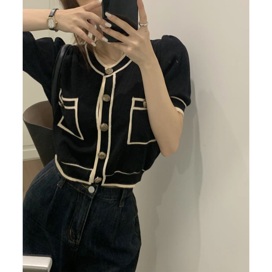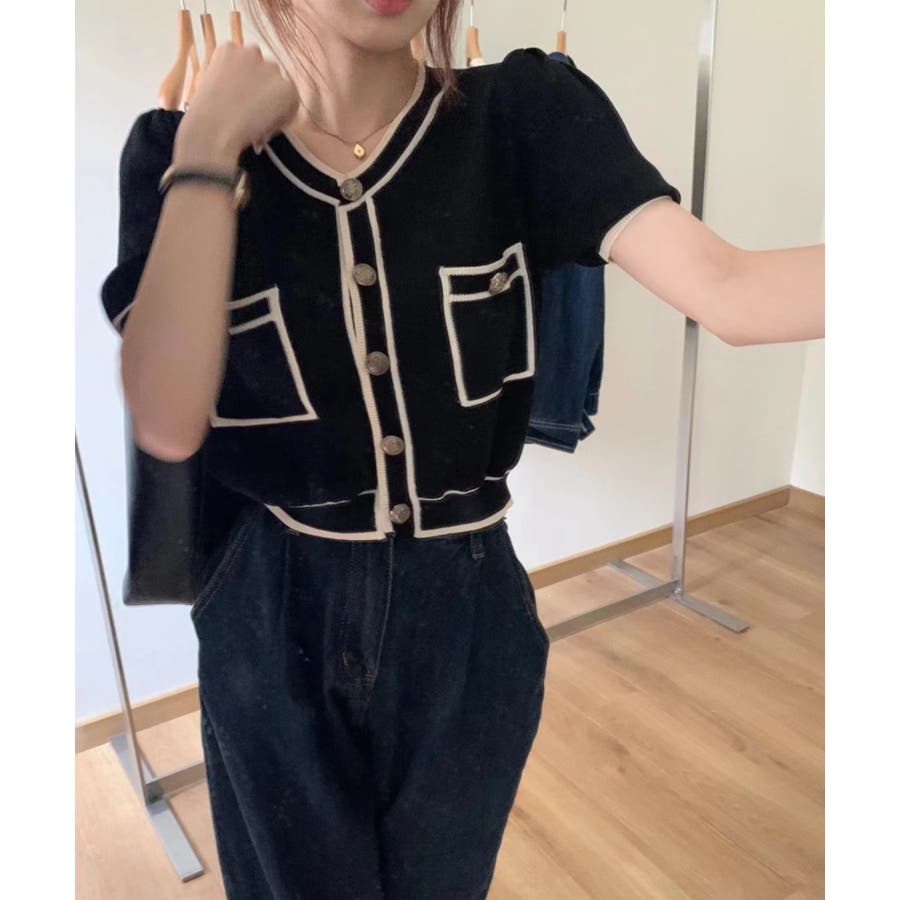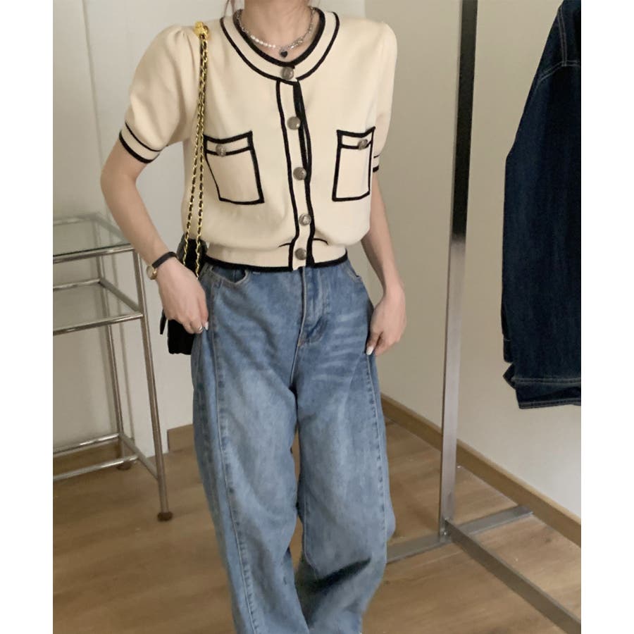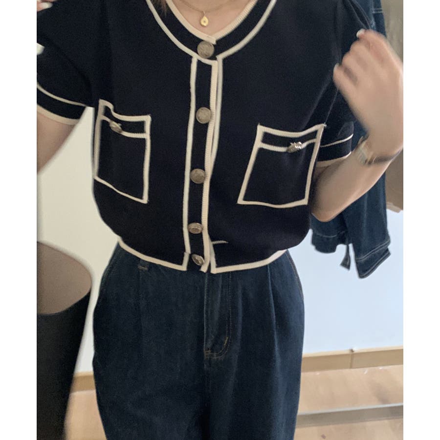 アウトリンキングのデザインが効いたカーディガン。配色と金属ボタンがそれぞれ異なるので、様々な雰囲気を楽しめます。スッキリとベーシックなラウンドネックが優しい印象に演出してくれて女性らしく着用可能です。着膨れせず、ゆとりのあるサイズ感がかわいいカーディガンです。