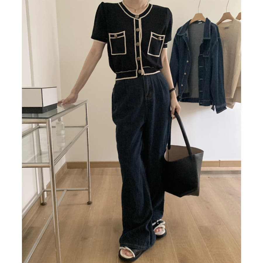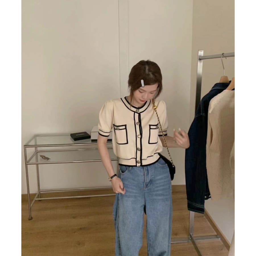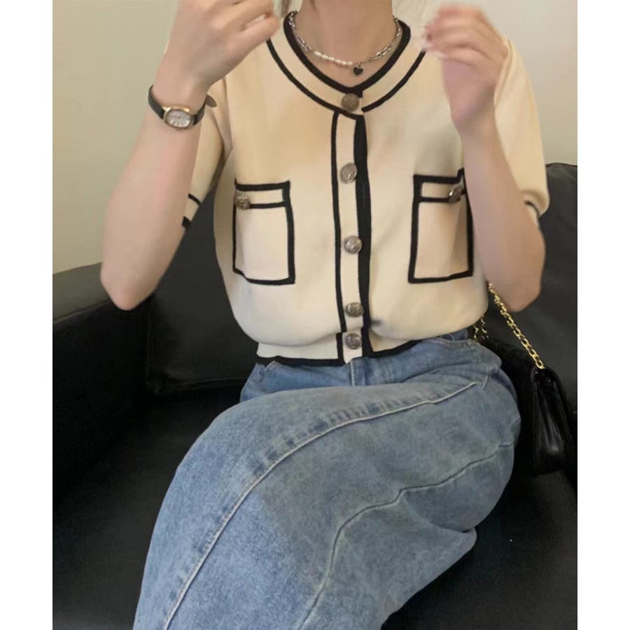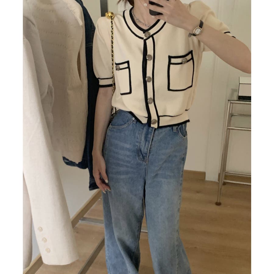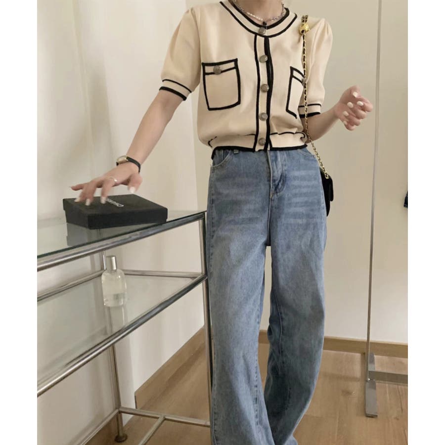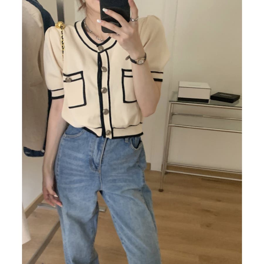 アウトリンキングのデザインが効いたカーディガン。配色と金属ボタンがそれぞれ異なるので、様々な雰囲気を楽しめます。スッキリとベーシックなラウンドネックが優しい印象に演出してくれて女性らしく着用可能です。着膨れせず、ゆとりのあるサイズ感がかわいいカーディガンです。