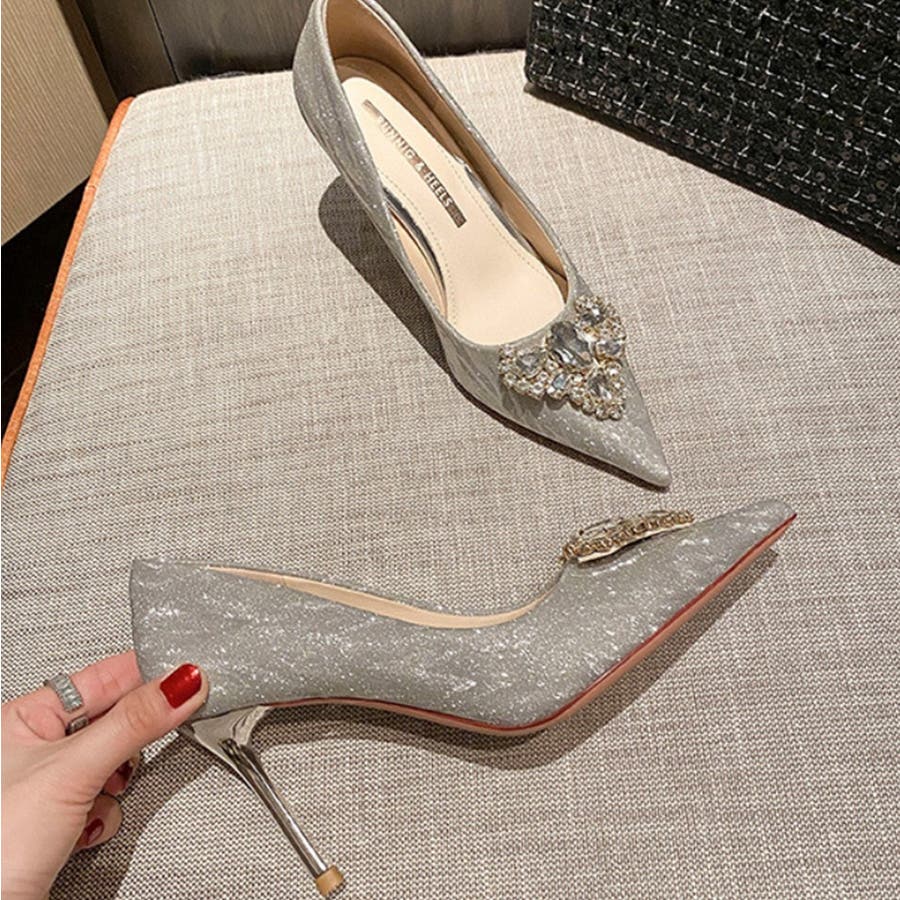 ヒール8cm ビジューハイヒールパンプス 韓国ファッション