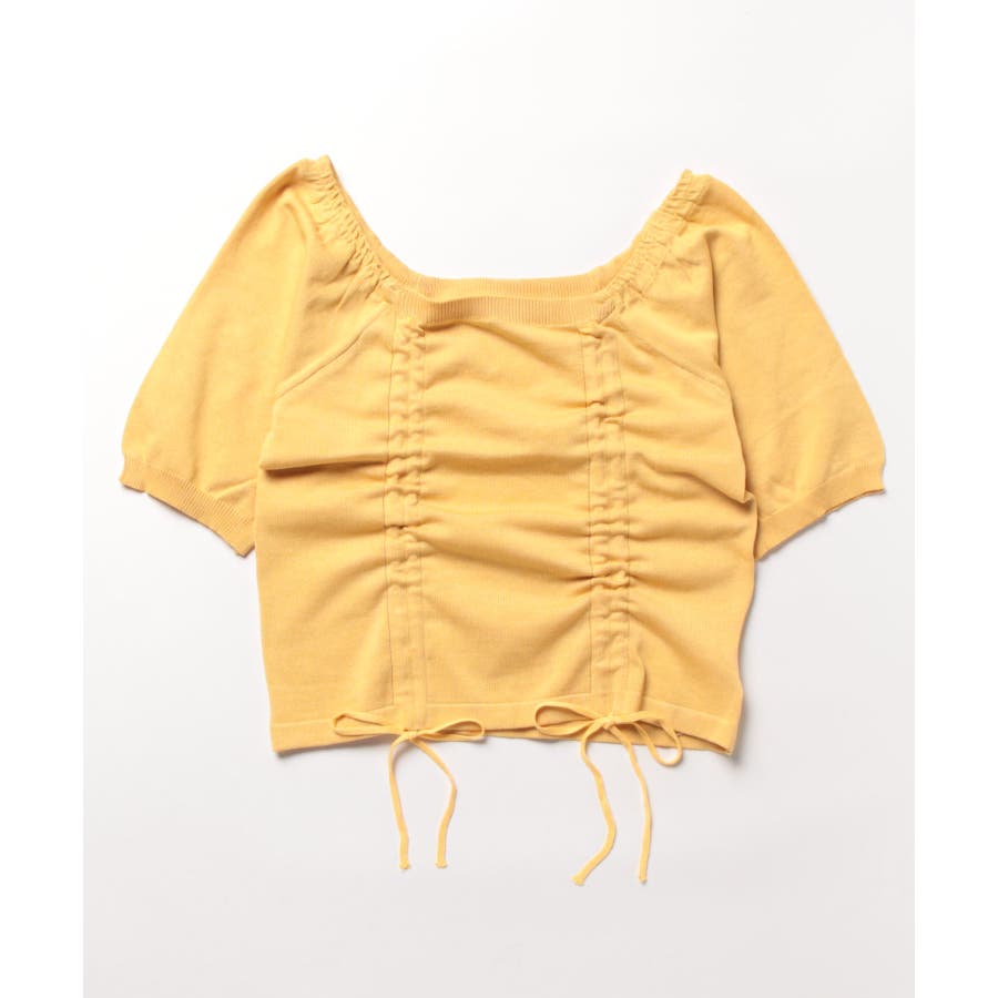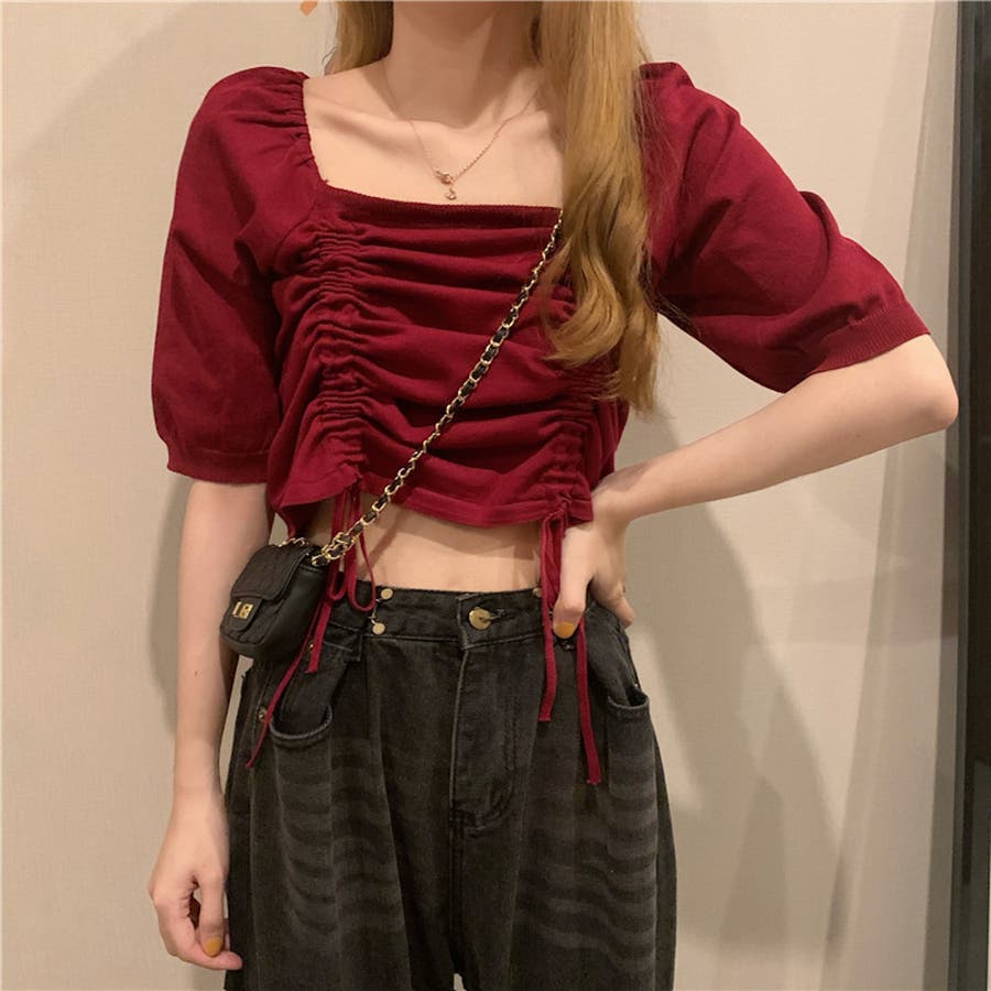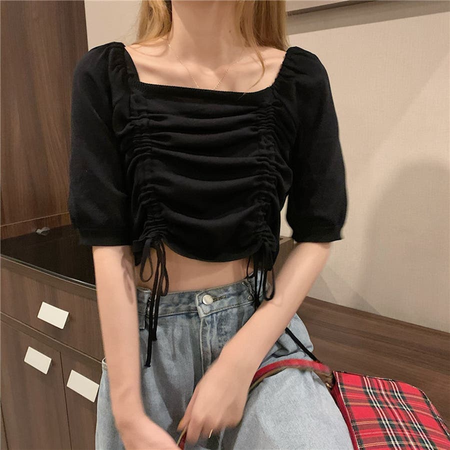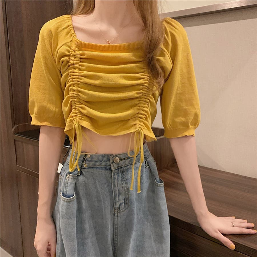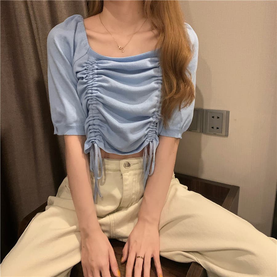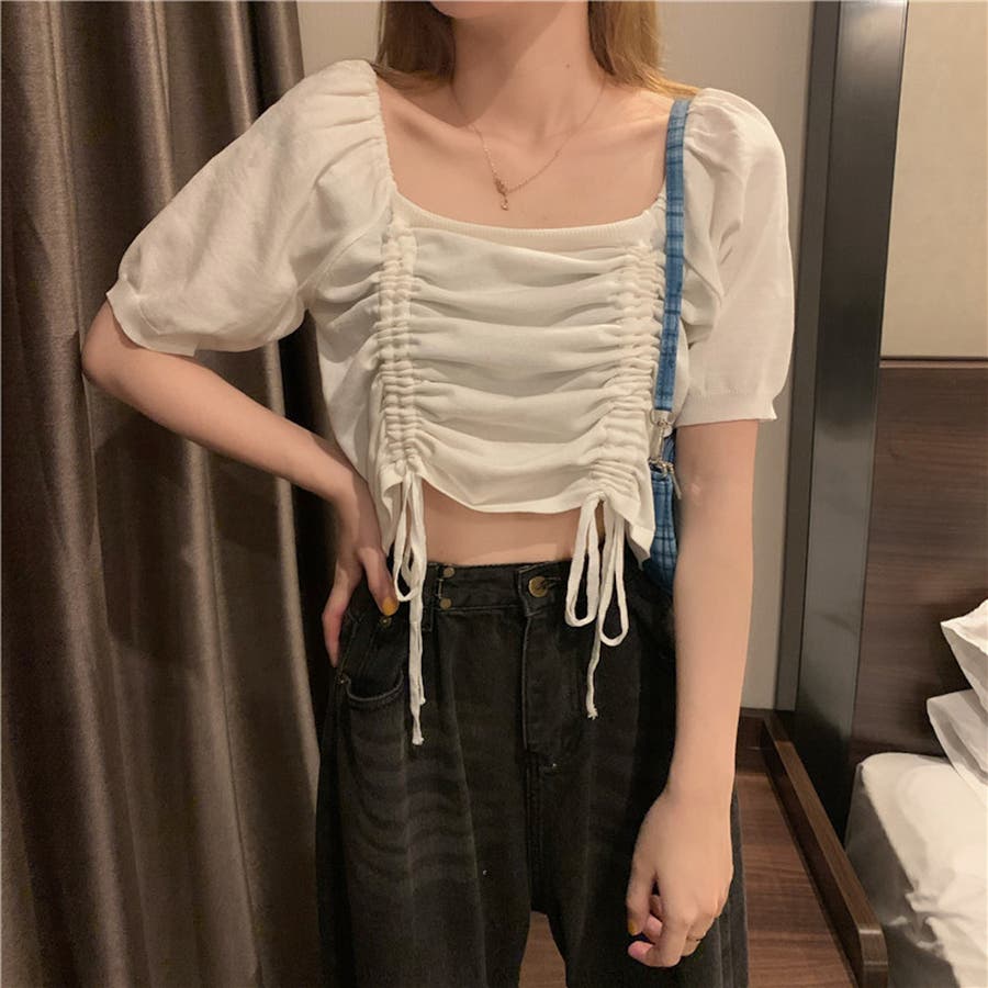 ギャザーストリングスカットソー 韓国ファッション ハイウエスト
