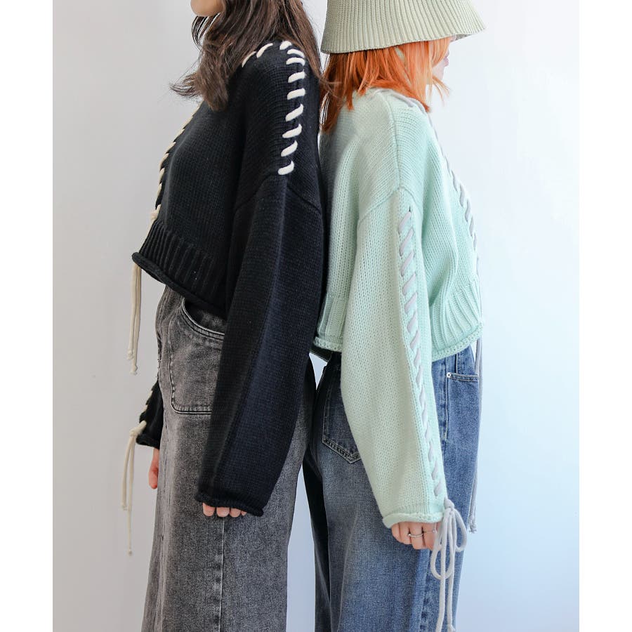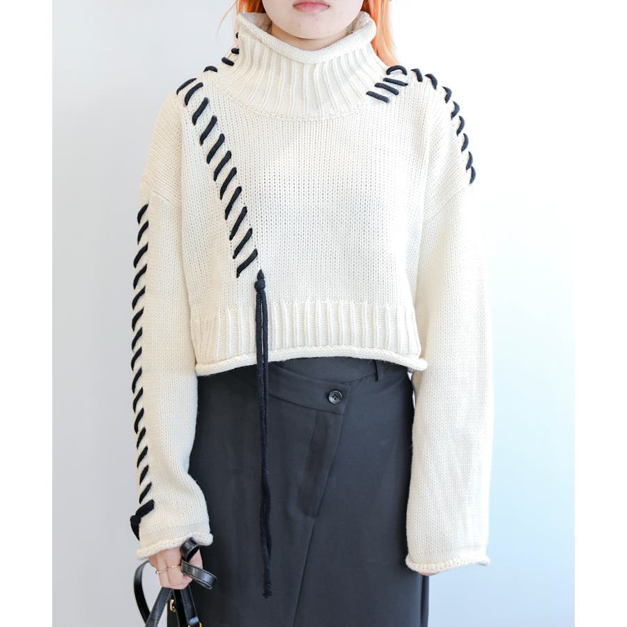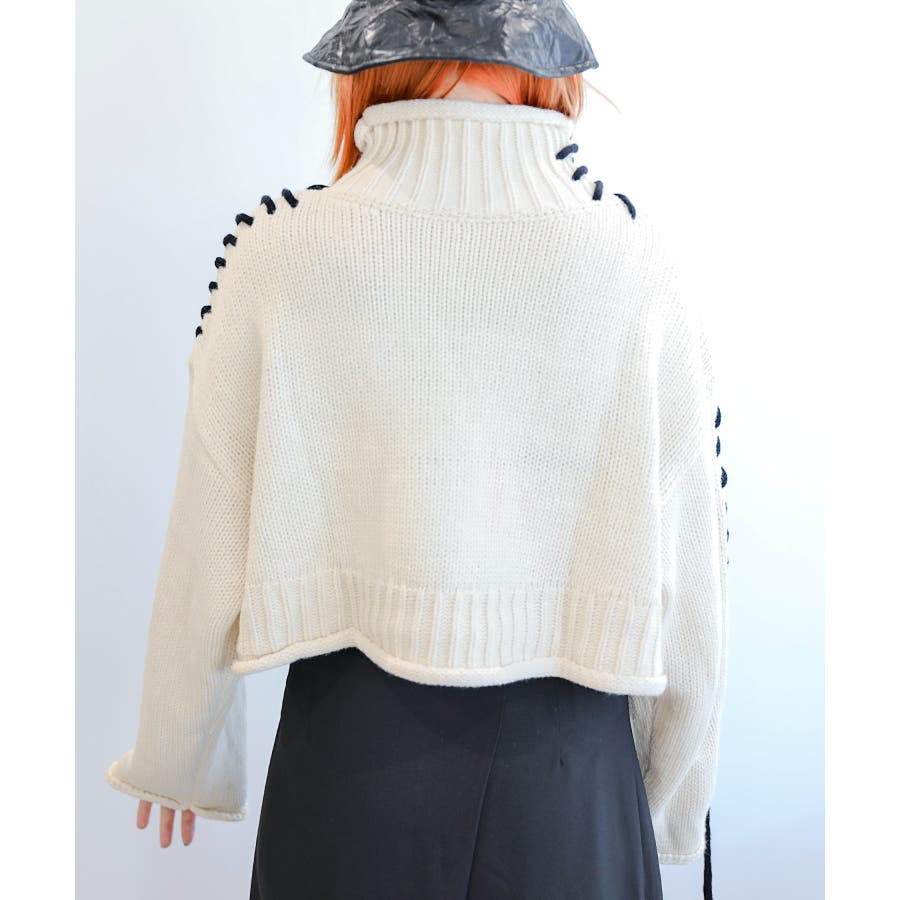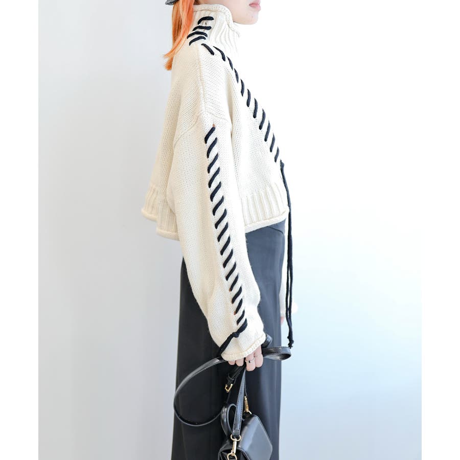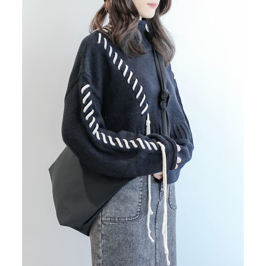 大きめのステッチがおしゃれなニットトップスの登場!!手縫いステッチがアクセントになっていて、紐の揺れ感もかわいいです!丈感はショート丈なので、ボトムスにインせずにスッキリ着ていただけます。ゆったりとしたサイズ感にキレイなボリューム感が出て、コーディネートのワンポイントになります。温かみのあるデザインなので、ボトムスもチノパンやシンプルなスカートなどと合わせるとコーディネートがまとまります。
