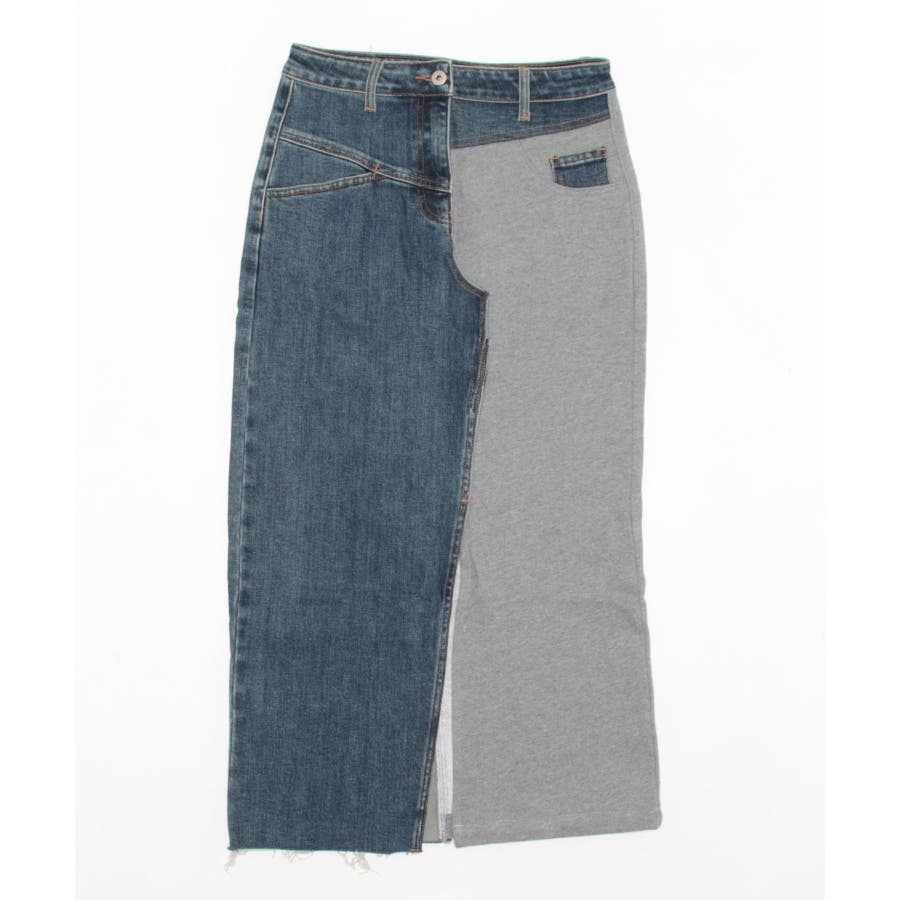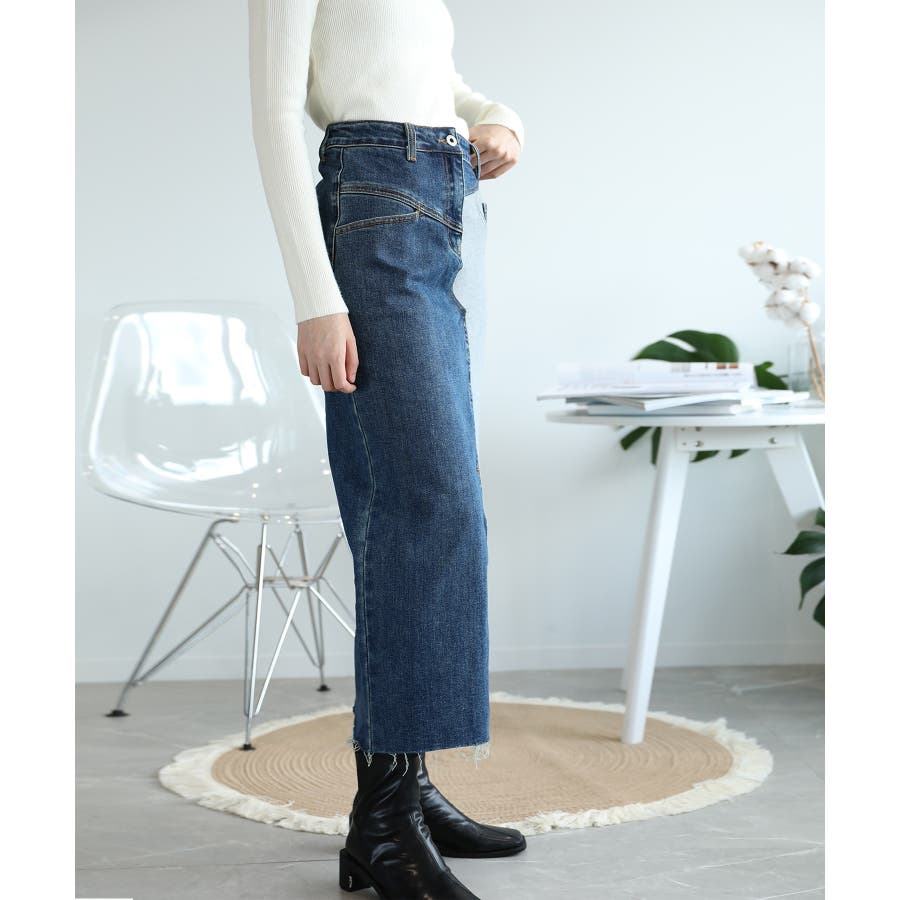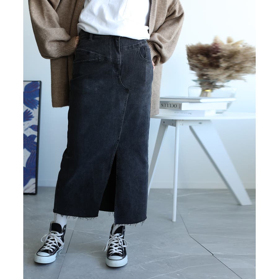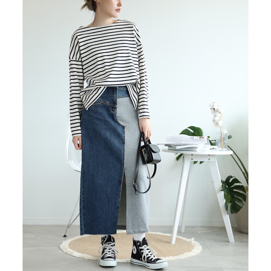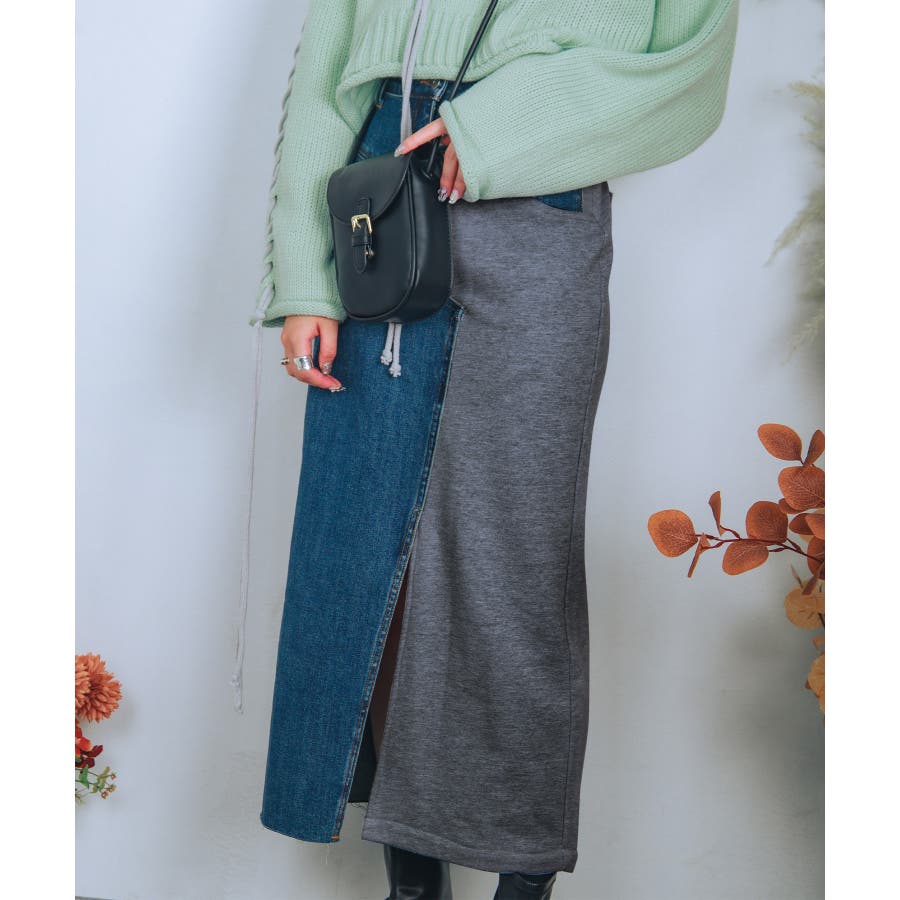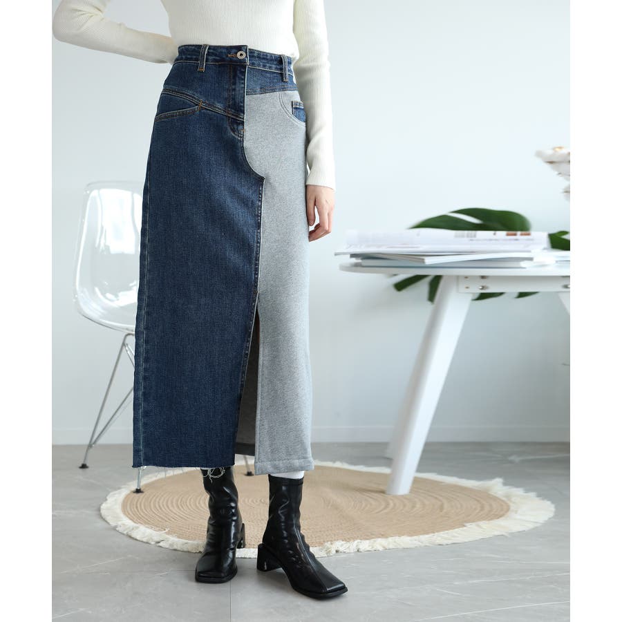 aimohaオリジナルデザイン前スリットアシンメトリー異素材デニムタイトスカート!前にスリットが入っているので歩きやすく、脚をきれいに見せてくれます。丈感も長すぎないので、スニーカーはもちろん、ショートブーツなどと合わせてもかわいいです。ブラックは定番のデニムスタイル!キレイめなシャツからカジュアルなスウェットまで何にでも合わせやすいので1枚持っていて間違いなしです。色も黒で統一してシックなコーディネートにしても、鮮やかな色や柄シャツなどを合わせても◎ブルーデニムは切り替えMIXデザイン!デニムスカートの半分がディテールはそのままスウェット生地になったデザイン!カジュアルな素材なのでトップスはTシャツやシャツを合わせたり、あえてスウェットやデニムのジャケットなどを合わせてスカートの素材とマッチさせてもおしゃれ!※※グレーのみ異素材コンビデザインです。