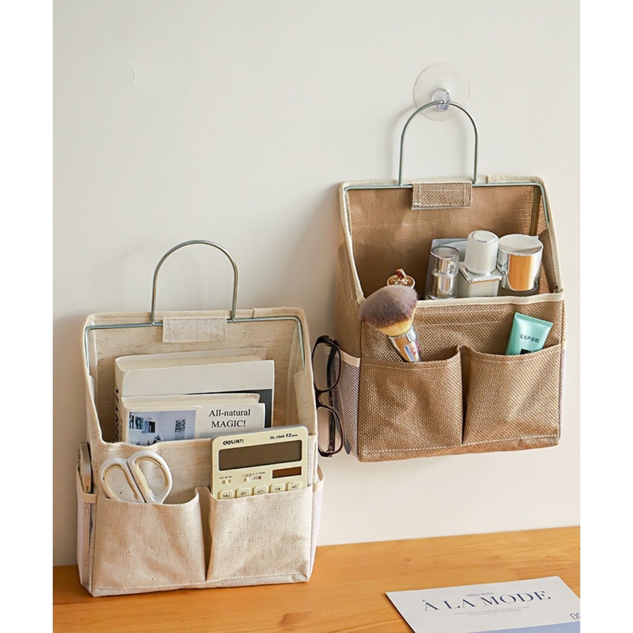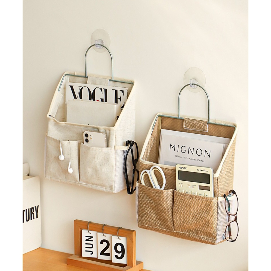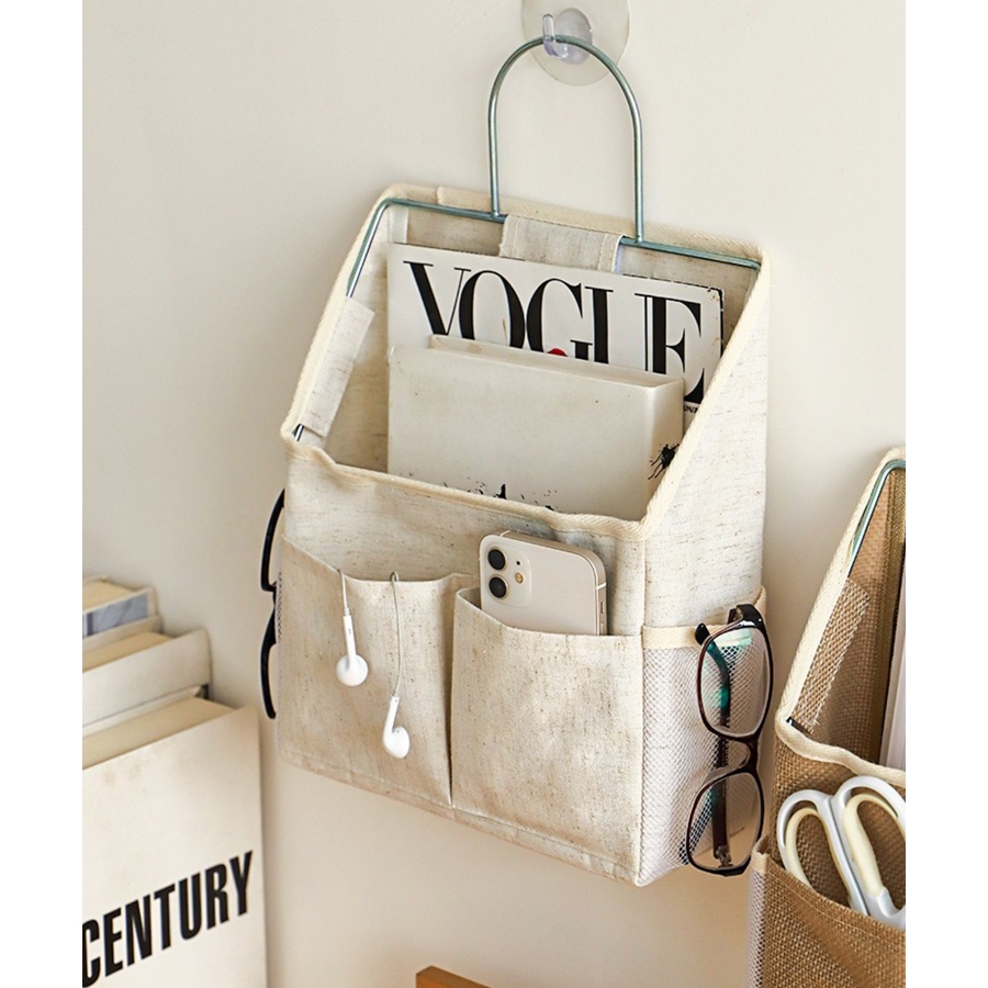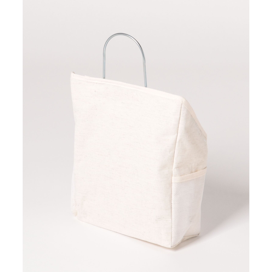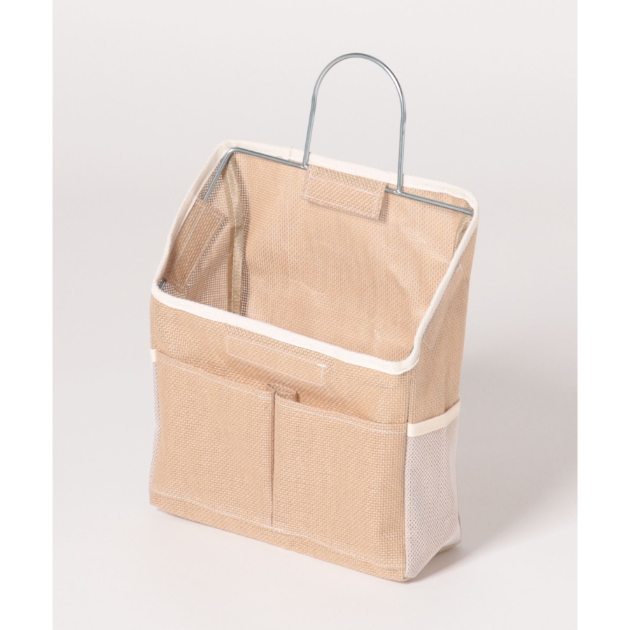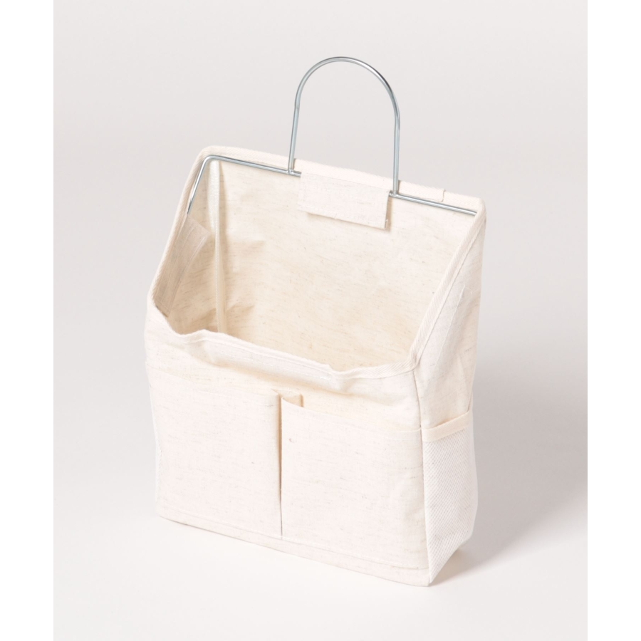 壁やラックなどにかけて使用できる収納グッズです。収納口にワイヤーが入っているので型崩れせず、取り出しやすい◎大きな収納部分に加え、ポケットとサイドにメッシュポケットが付いているのでしっかり収納できます。ワイヤーは強力なマジックテープで固定されているので取り外しができ、本体は撥水加工が施されているのでお手入れも簡単です。デスク周りで使用する時は、大きな収納部分には本やメモ帳などを収納して、外側のポケットには文具を収納するとデスクまわりをスッキリでき、取り出しやすいので便利!クローゼットや玄関などで使用する場合、服用ブラシや消臭スプレーなどケア用品を入れておくと、お洋服のケアが楽になりオススメです。また、キッチンではキッチンペーパーなどのストック用でもお使いいただけ、調理用品をポケットに収納すれば取り出しやすいです。様々な場所で活用できるので1つあると便利です!