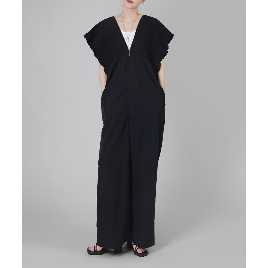 大胆なシャーリングデザインが目を惹く着映え間違いなしのドレッシーなサロペット気になる肩回りをカバーしつつ、ざっくり開いた抜け感のある深めのVネックデザインがポイント。ストンと落ちるシルエットで体型もカバー◎通気性のいい軽やかな生地感とラフ感のあるリラクシーなシルエットで快適な着心地の一着。バックはレースアップになっていて後ろ姿もかわいいデザイン。オールインワンデザインでコーデに悩まないのも嬉しい♪楽ちんで大人かわいい華奢見えサロペです。