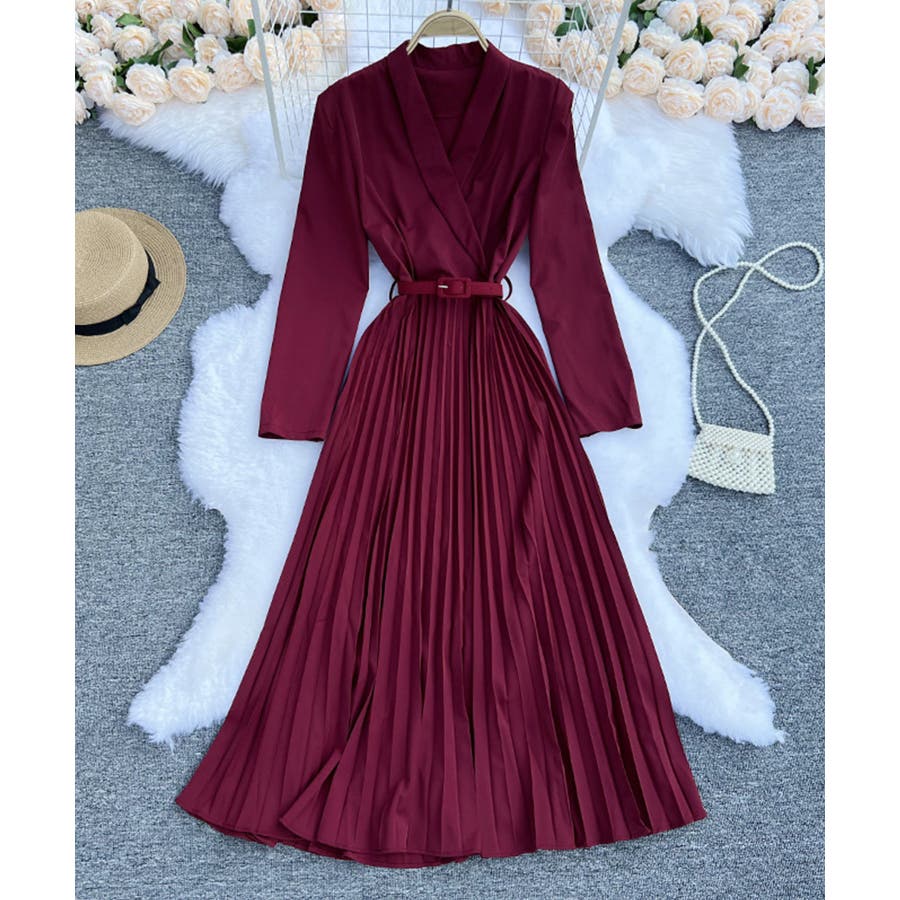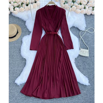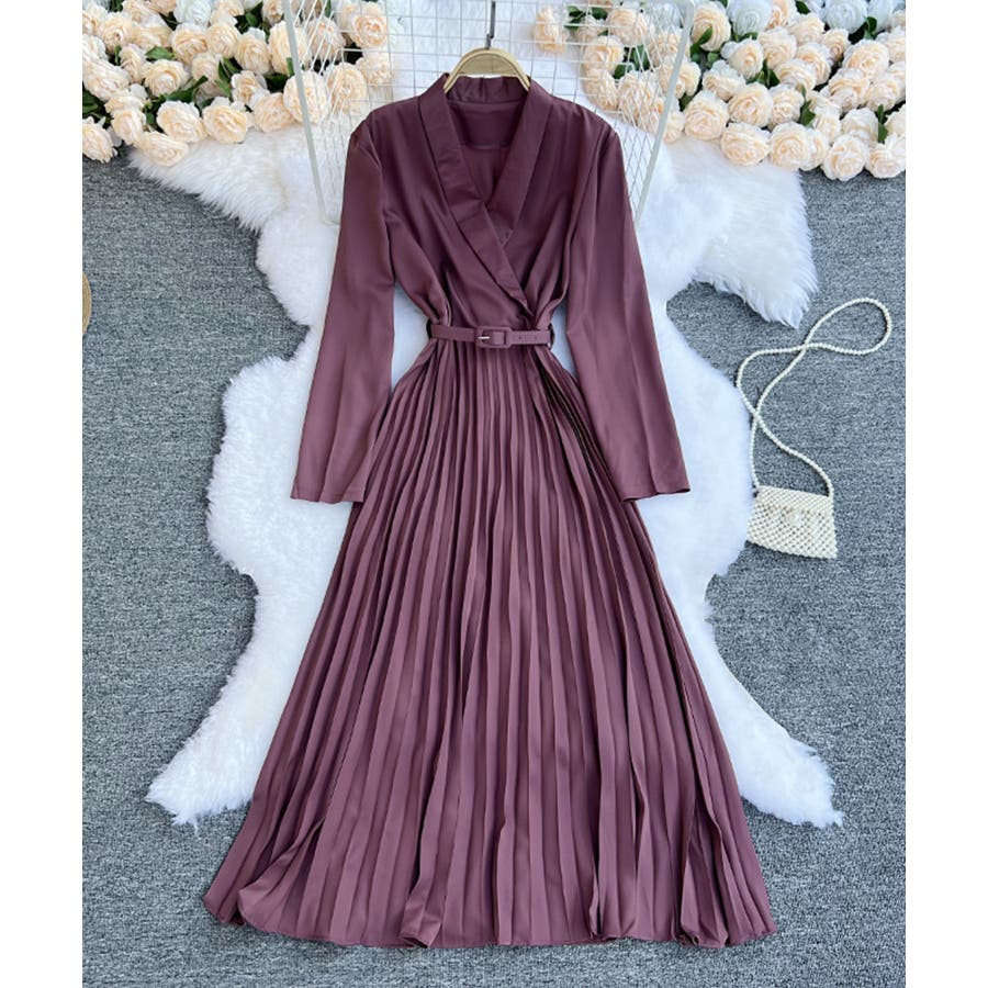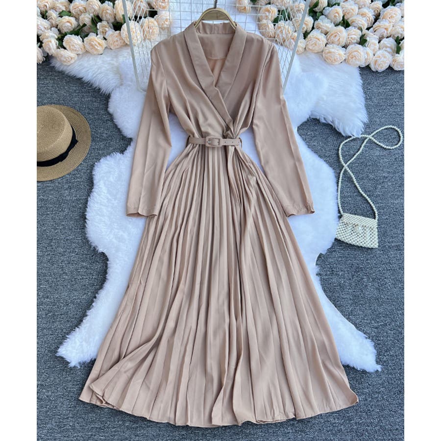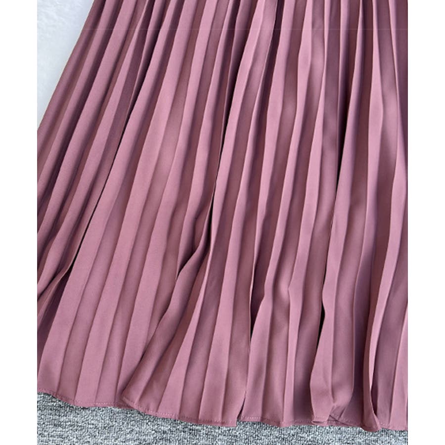 ガウン風プリーツスカートロングワンピース 韓国ファッション ハイウエスト