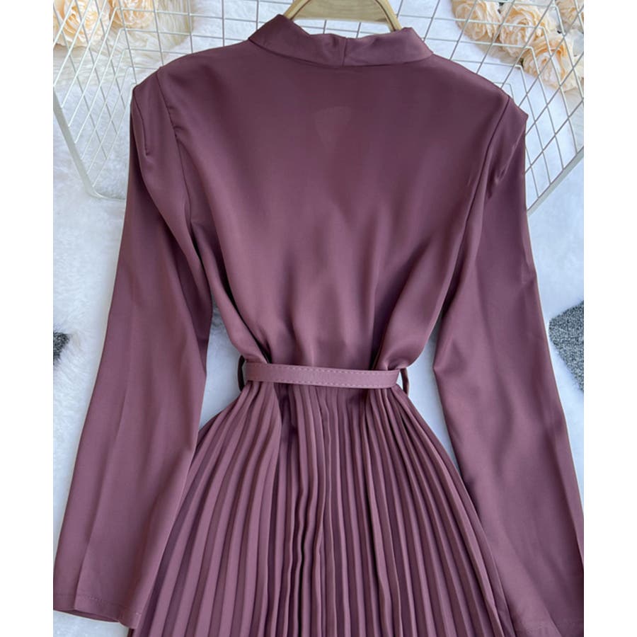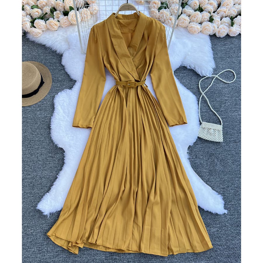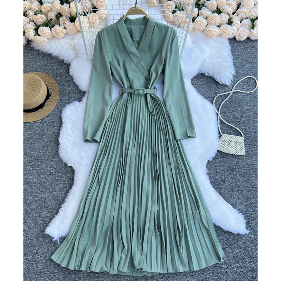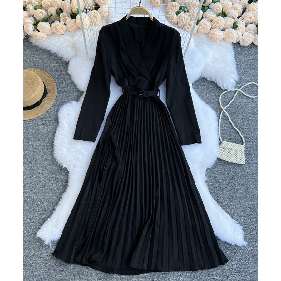 ガウン風プリーツスカートロングワンピース 韓国ファッション ハイウエスト