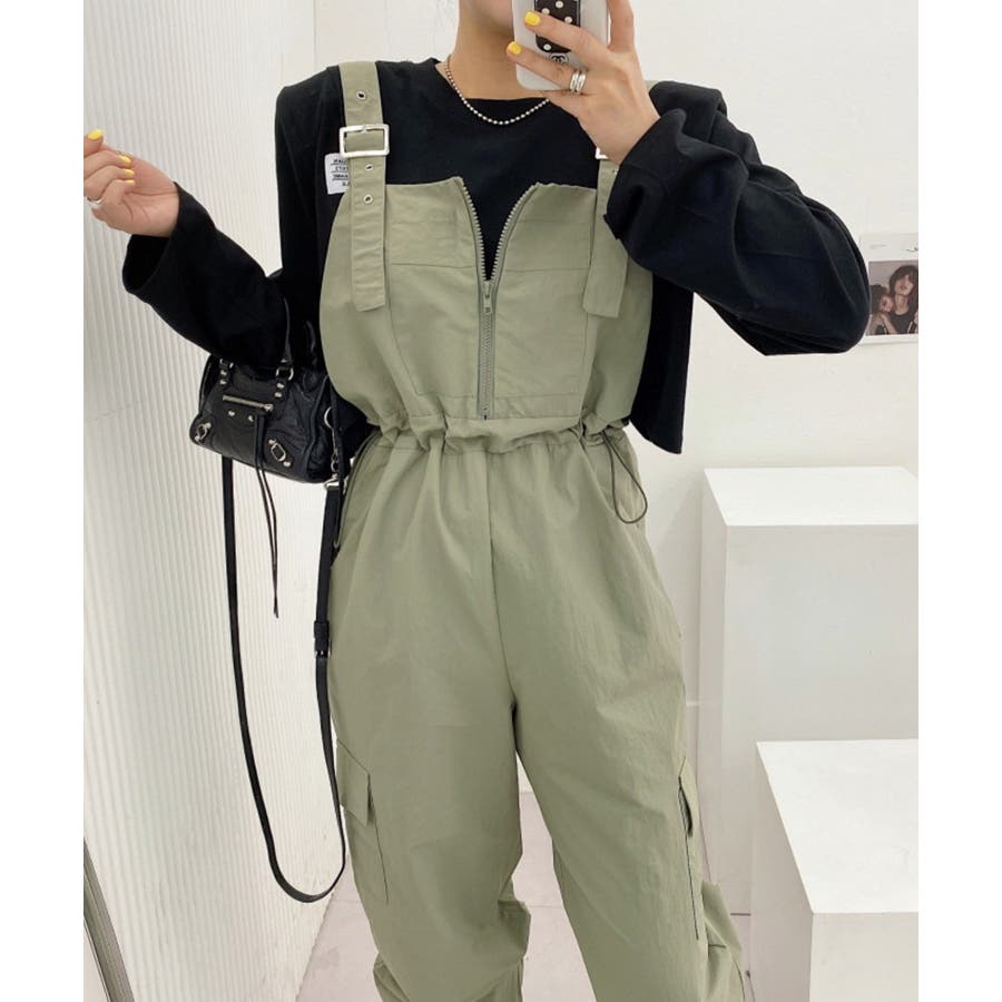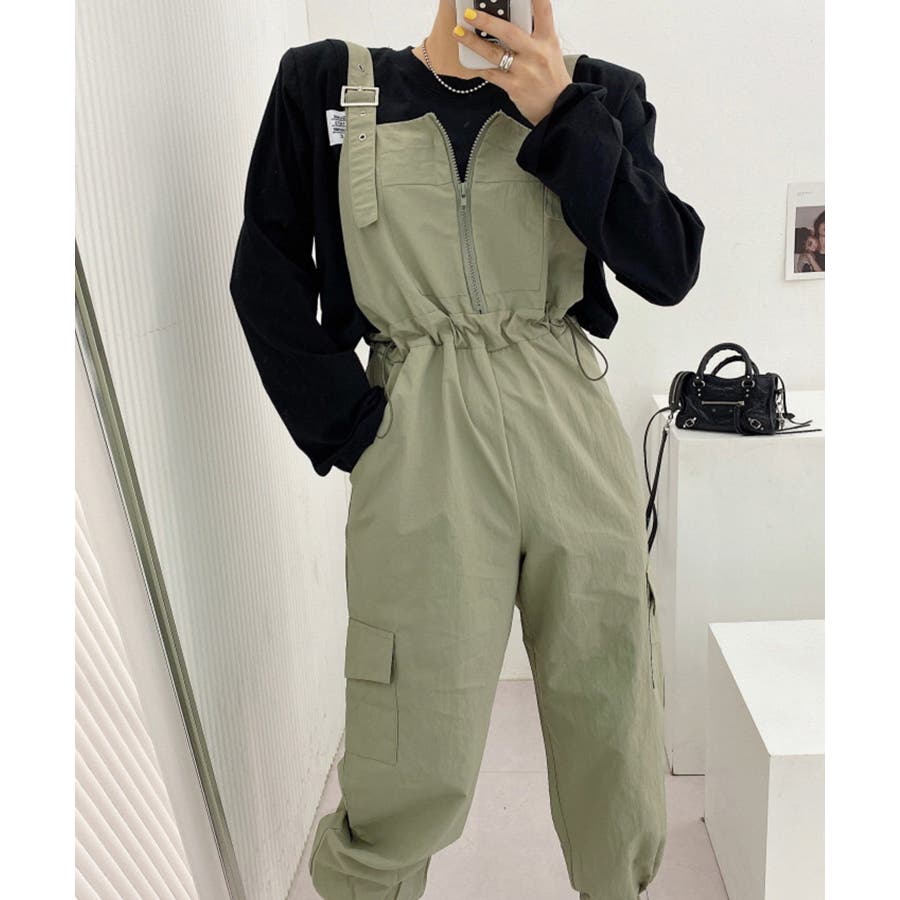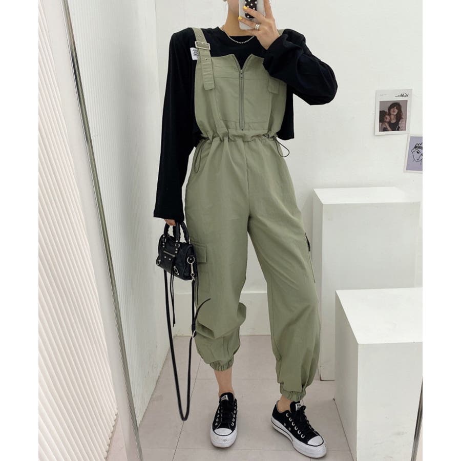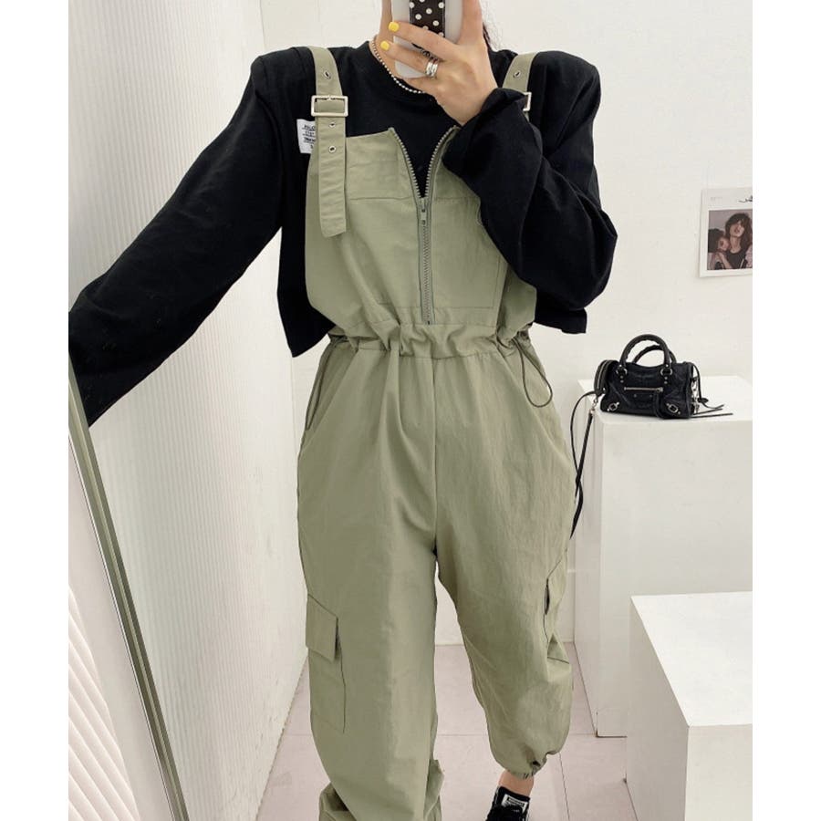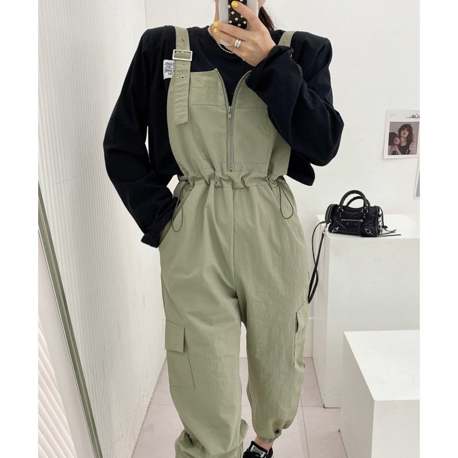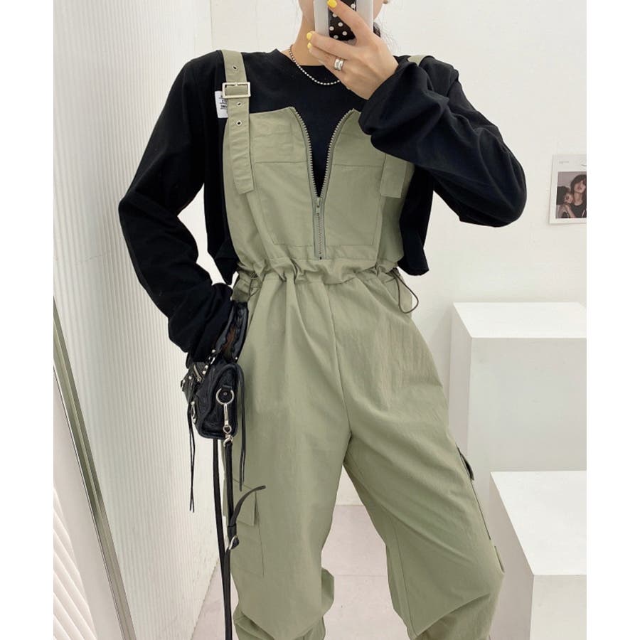 胸元のジッパーがカジュアルでかわいいサロペットです!ウエストは紐で調節可能になっているので履きやすく、カジュアルなシルエットなのでTシャツやスニーカーなどとの相性抜群です!パンツ裾にはゴムが入っているのでブーツなどにも合わせやすく、肩紐で長さの調節もできるのでお好みのスタイルで着ていただけます。