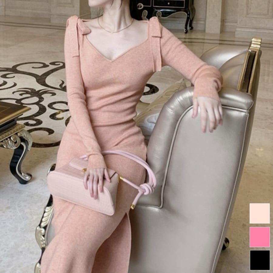 Jasmine 新作 肩リボンハートネックタイトニットロングワンピース