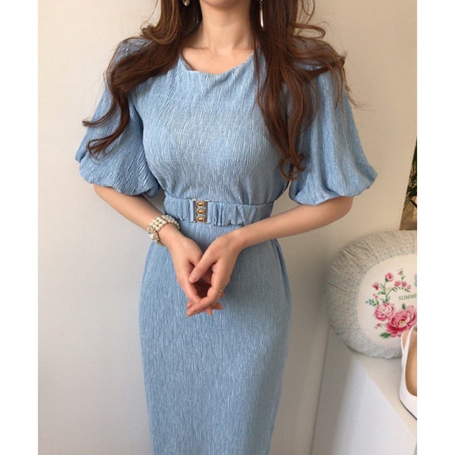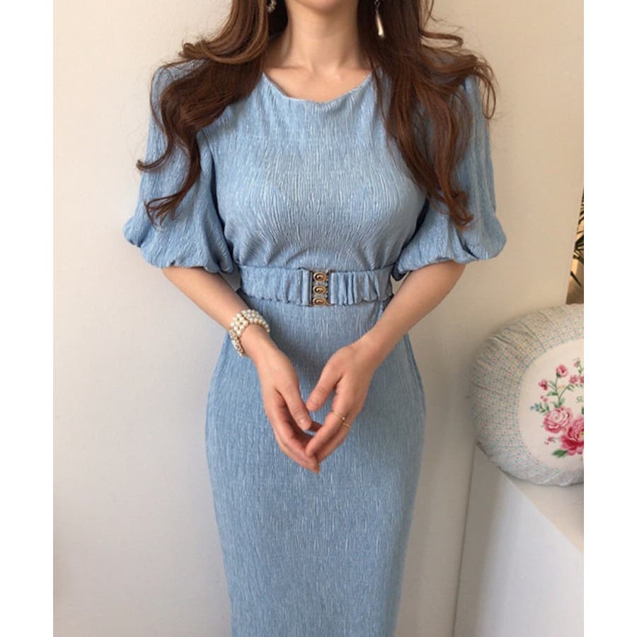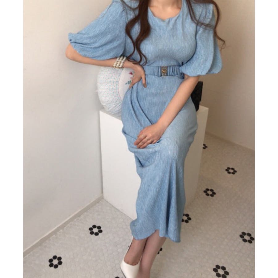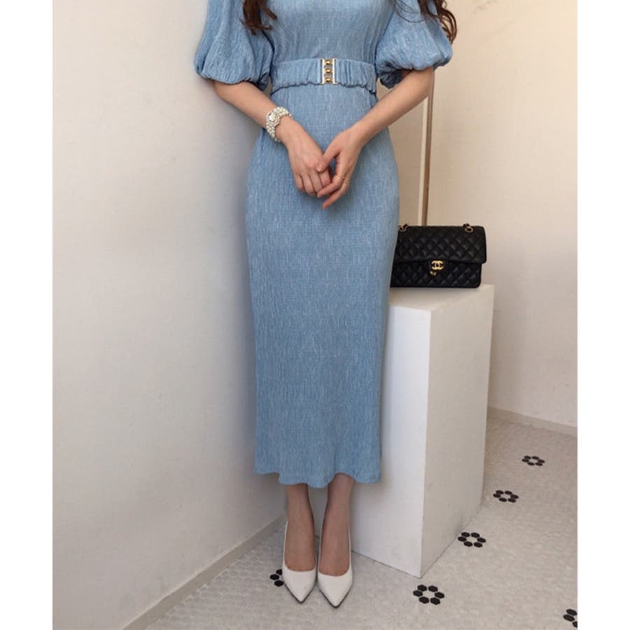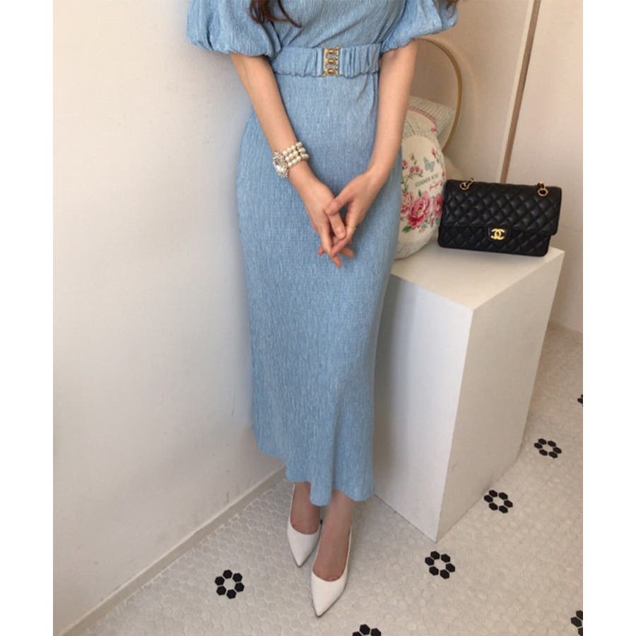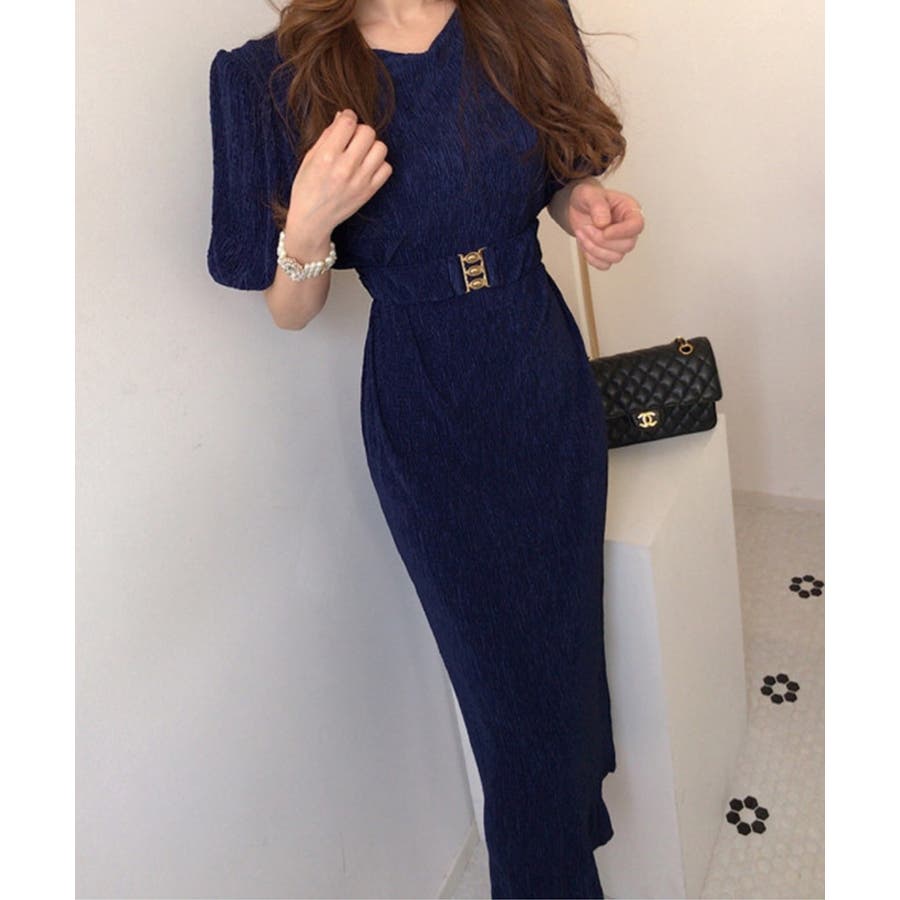 タイトベルト付きロングワンピース 韓国ファッション ワンピース
