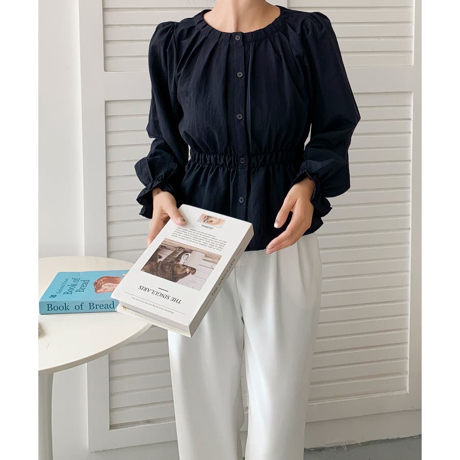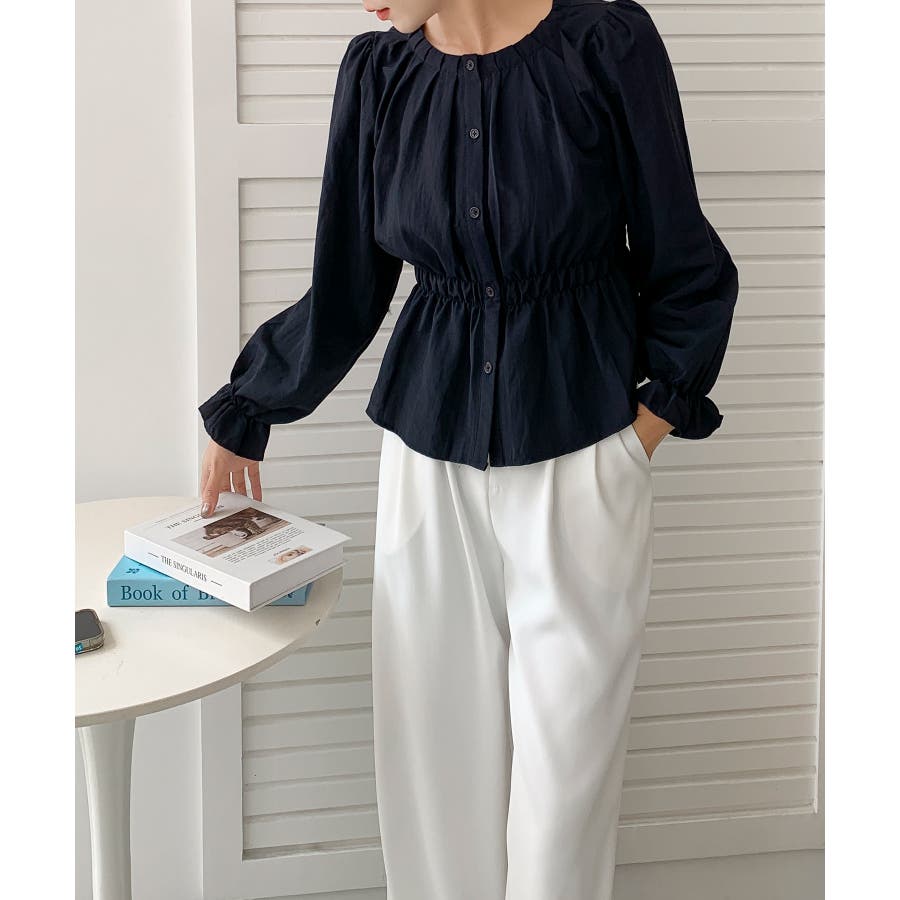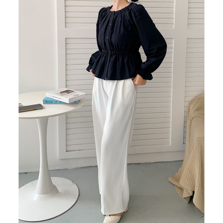 ウエスト部分ギャザーで自然なくびれラインが生まれスタイルよく着こなせます