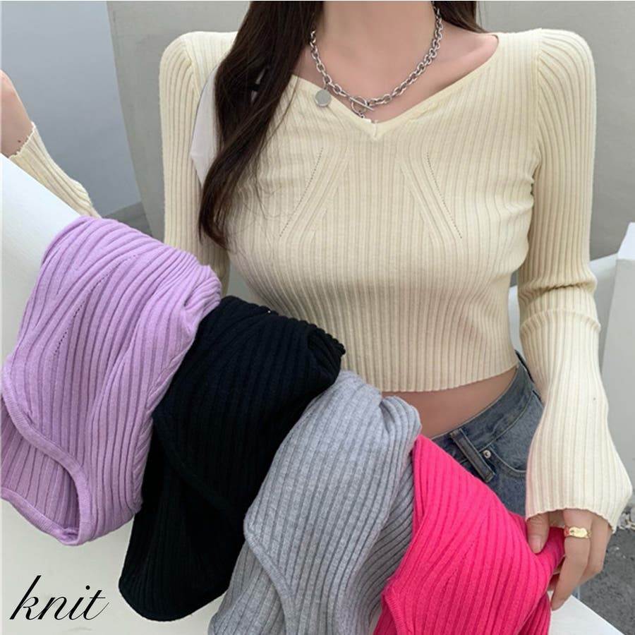 ミニ丈ハートネックリブニットトップス 韓国ファッション ニット