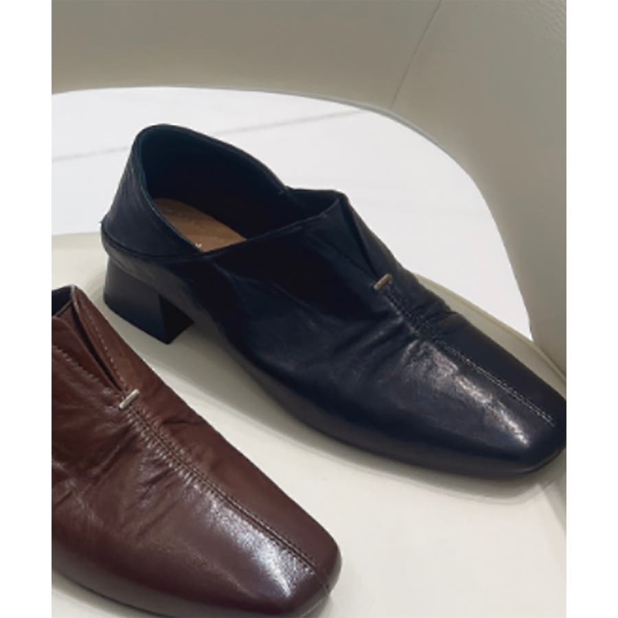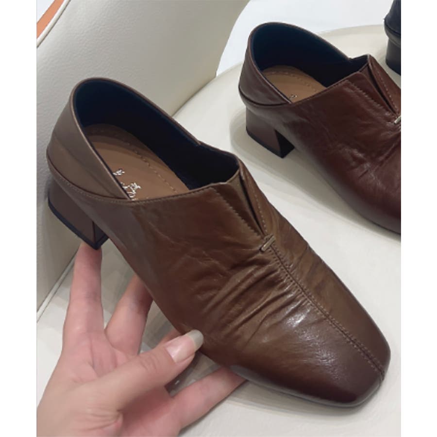 スクエアトゥギャザーシューズ レディース Vカットデザイン ローヒール きれいめ エレガントパンプス 柔らかレザー 歩きやすい 安定感抜群 オフィスカジュアル