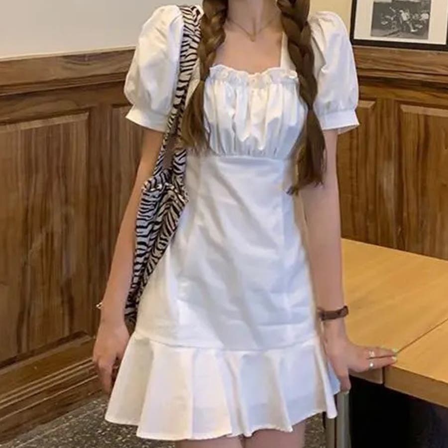 フリルのスクエアネックが顔周りを可愛くみせます。