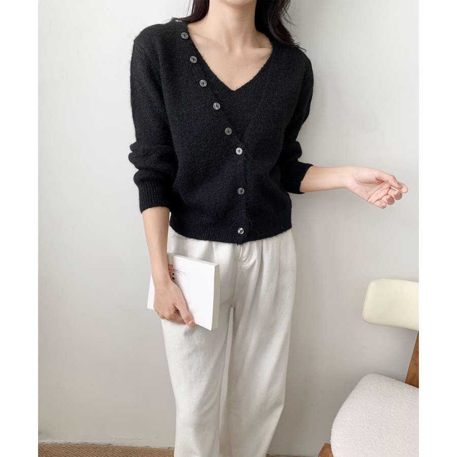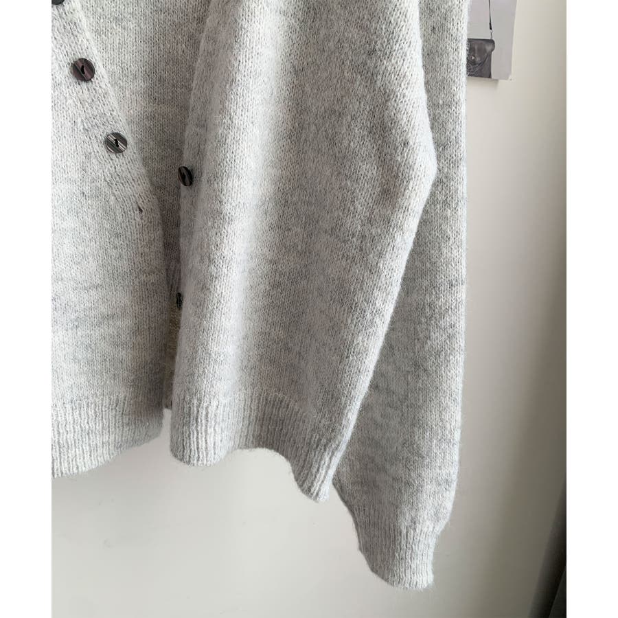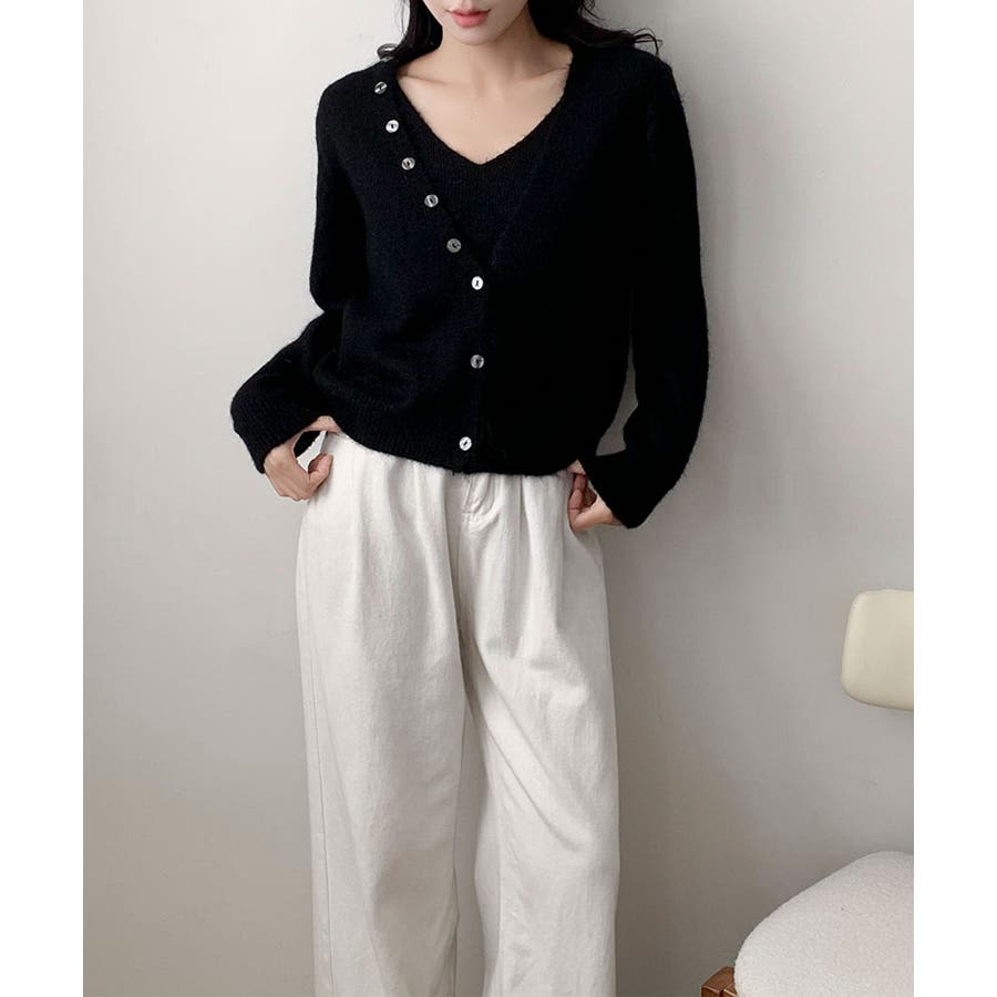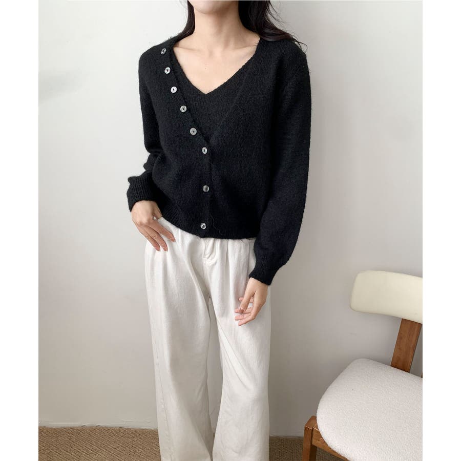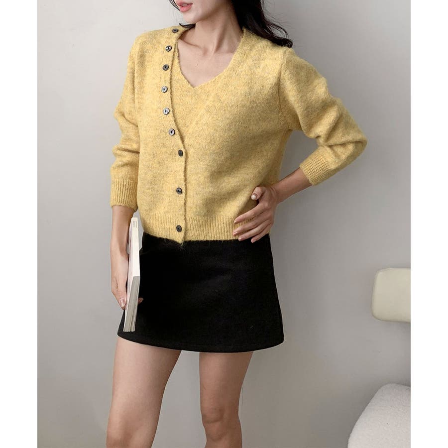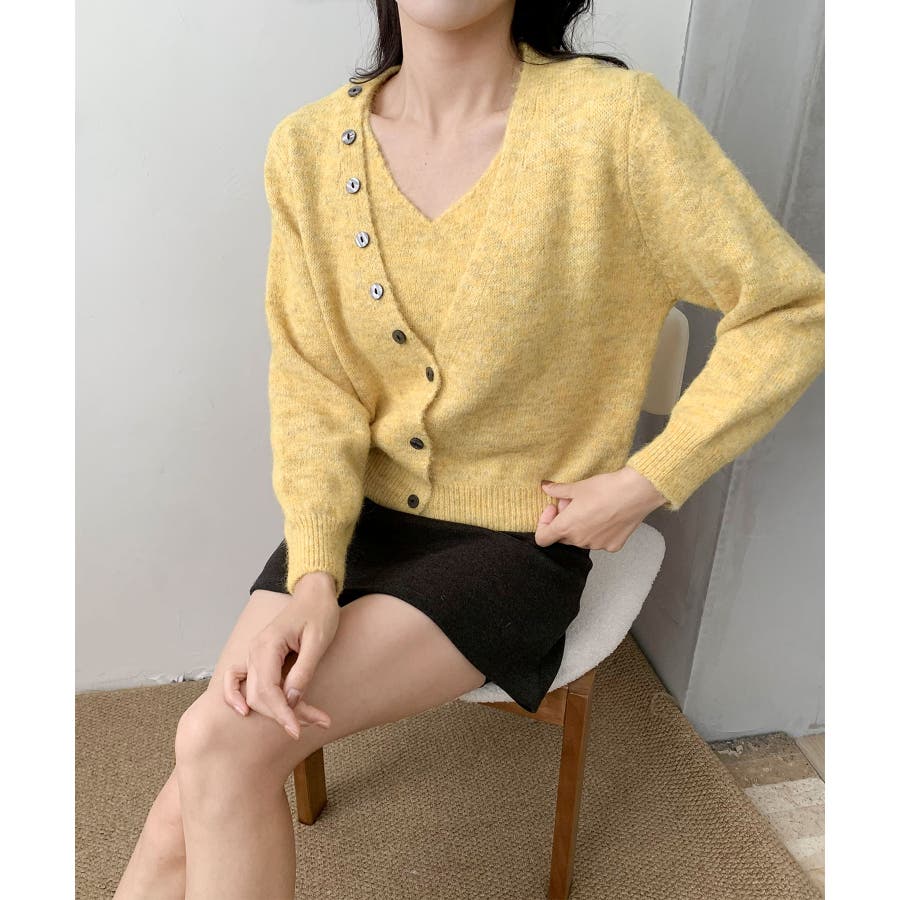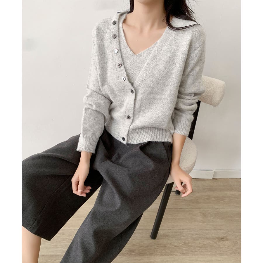 ふんわりとしたニット素材が優しい印象を与え、女性らしいリラックスムードを演出します。