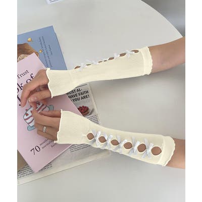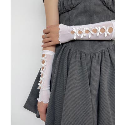 大胆なカットアウトデザインにリボンを組み合わせた、視線を引き寄せるガーリースタイルのアームカバー。装いに華やかさと個性を添えてくれるアイキャッチなアイテムです。腕の側面に施された丸型のホールが抜け感を出し、リボンが可愛らしさを引き立てます。手首から肘までを程よくカバーする長さで、着け心地は軽やか。メロウ加工のフリルエッジが細部にまで甘さを添えています。特別な日のコーデや撮影、小物で魅せるスタイルにぴったり。普段のファッションに少し個性を加えたいときにもおすすめです。