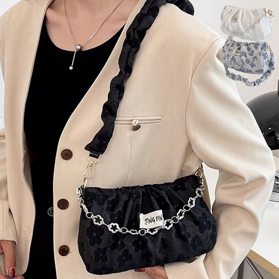 上品なギャザー加工と花柄ディテールが目を引く、チェーン装飾付きのミニハンドバッグ。持ち手部分にはフラワーチェーンと、くしゅっとしたシュシュ風のストラップを採用し、ガーリーかつ高級感のある仕上がりになっています。見た目はコンパクトながら、口元は大きく開き、スマホやミニ財布などの必需品がしっかり収納可能。チェーンストラップが華やかさをプラスし、アクセサリー感覚で持ち歩けるバッグです。ベースはシンプルながら柄や質感に表情があり、コーデの主役になるデザイン。フェミニンなワンピースにはもちろん、カジュアルなトップスとのミックスコーデにもおすすめ。カフェ巡りやお呼ばれ、日常使いにも最適な、存在感抜群のアイテムです。