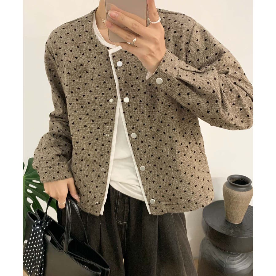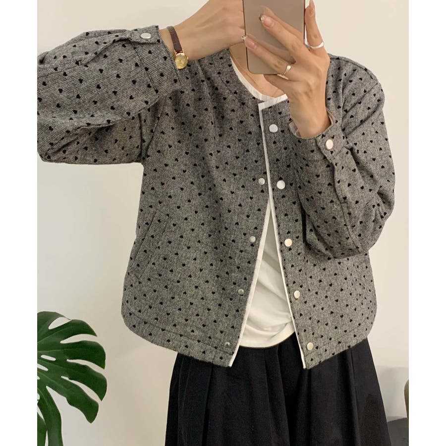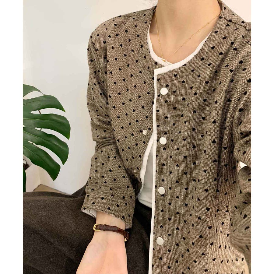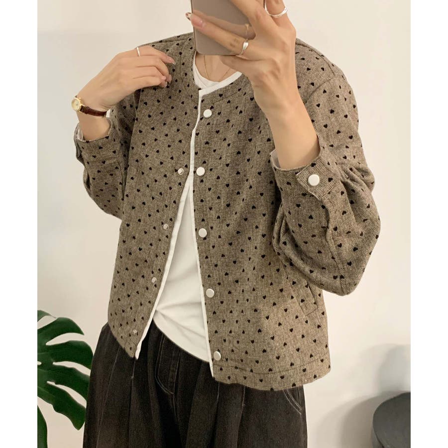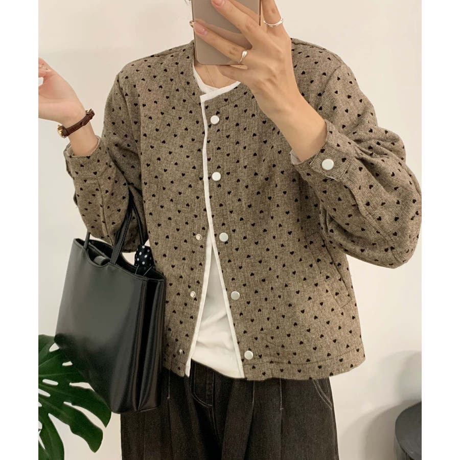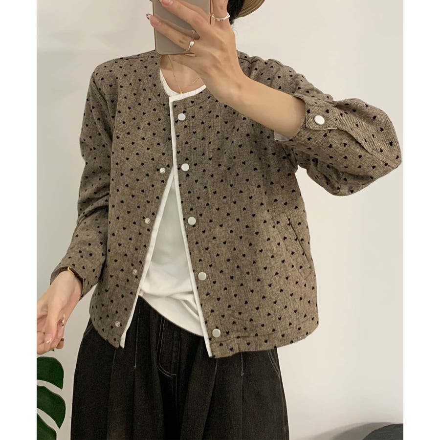 ■デザイン落ち着いた色味とドット柄が調和したコットンジャケット。ノーカラーデザインで、すっきりとした首元が魅力的です。フロントボタン仕様で着脱が簡単。シンプルながらも上品な雰囲気が漂い、カジュアルにもきれいめスタイルにも合わせやすい万能アイテムです。■素材柔らかな綿素材を使用し、肌触りが心地良い一枚。通気性に優れ、長時間着用しても快適さをキープできます。■コーディネートの提案・白いインナーとパンツを合わせて、清潔感のあるカジュアルスタイルを楽しむ。・タイトスカートやフラットシューズと合わせて、エレガントな印象を演出。 ・デニムやスニーカーで、リラックス感のあるデイリーコーデに。