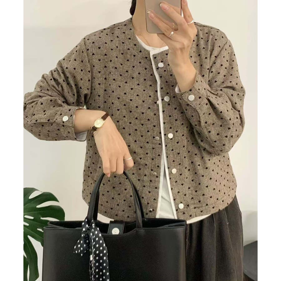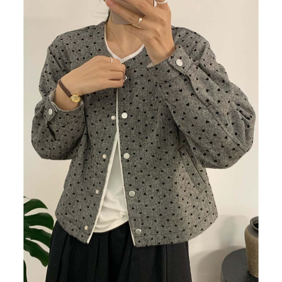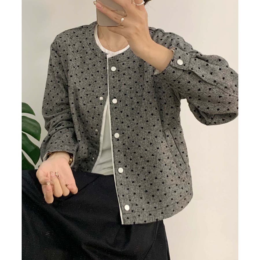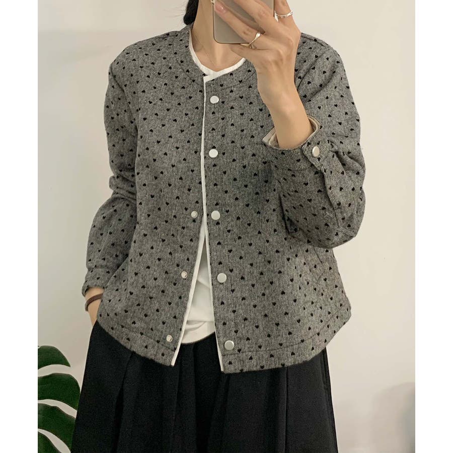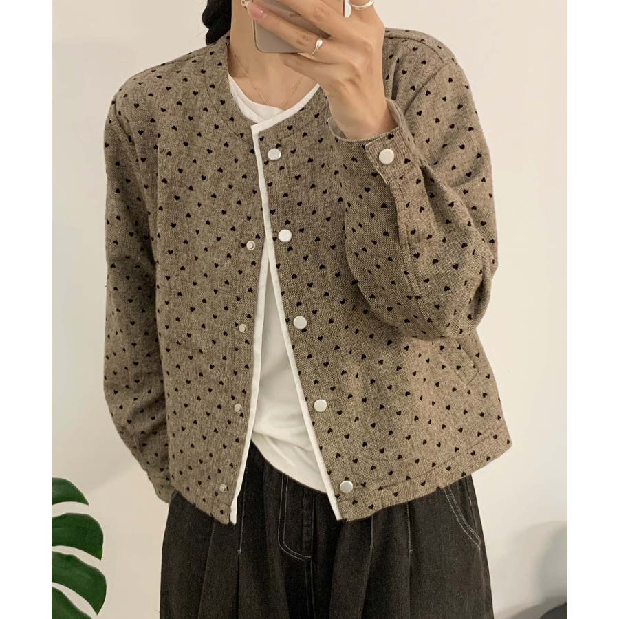 ■デザイン落ち着いた色味とドット柄が調和したコットンジャケット。ノーカラーデザインで、すっきりとした首元が魅力的です。フロントボタン仕様で着脱が簡単。シンプルながらも上品な雰囲気が漂い、カジュアルにもきれいめスタイルにも合わせやすい万能アイテムです。■素材柔らかな綿素材を使用し、肌触りが心地良い一枚。通気性に優れ、長時間着用しても快適さをキープできます。■コーディネートの提案・白いインナーとパンツを合わせて、清潔感のあるカジュアルスタイルを楽しむ。・タイトスカートやフラットシューズと合わせて、エレガントな印象を演出。 ・デニムやスニーカーで、リラックス感のあるデイリーコーデに。