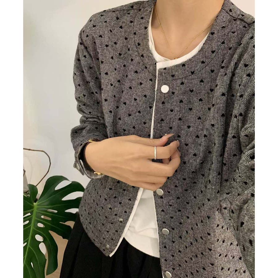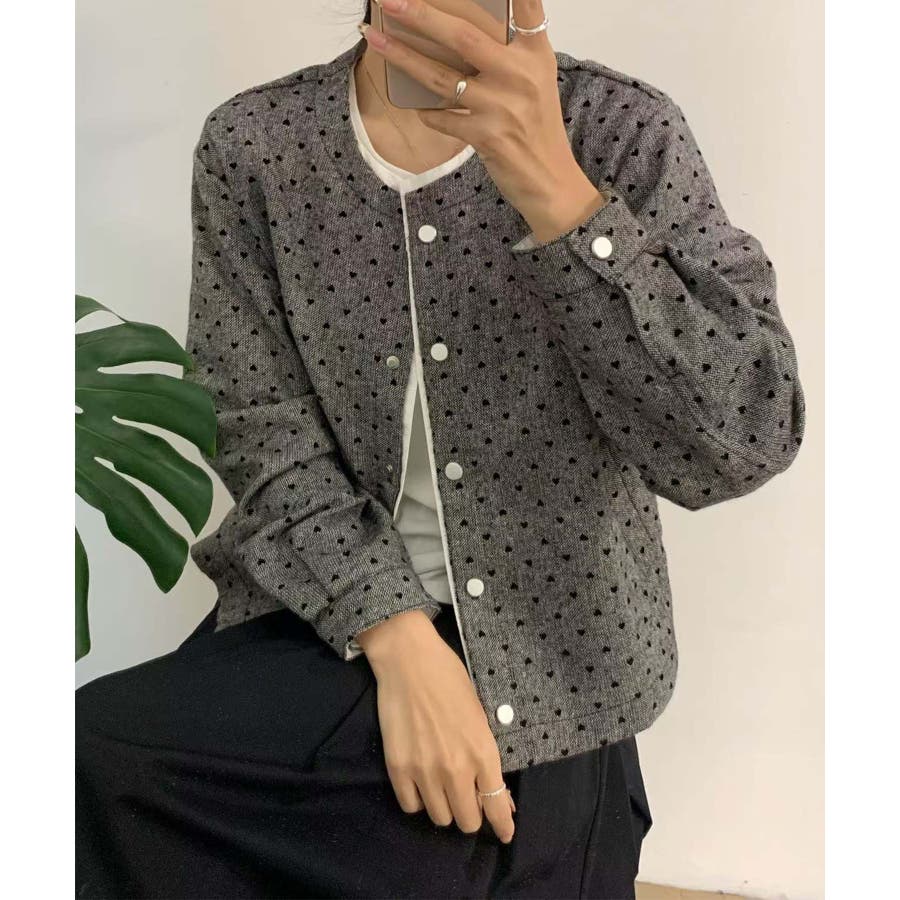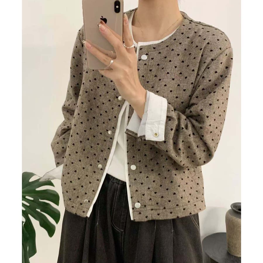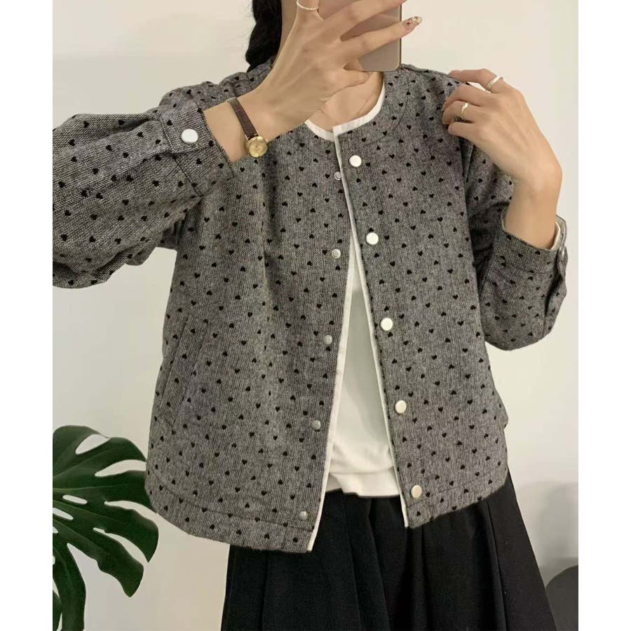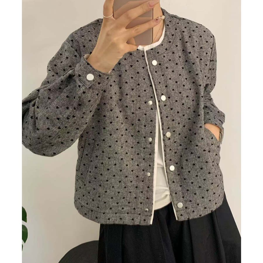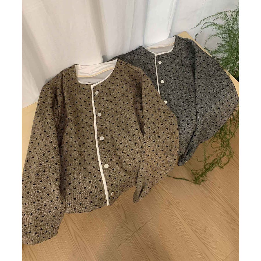 ■デザイン落ち着いた色味とドット柄が調和したコットンジャケット。ノーカラーデザインで、すっきりとした首元が魅力的です。フロントボタン仕様で着脱が簡単。シンプルながらも上品な雰囲気が漂い、カジュアルにもきれいめスタイルにも合わせやすい万能アイテムです。■素材柔らかな綿素材を使用し、肌触りが心地良い一枚。通気性に優れ、長時間着用しても快適さをキープできます。■コーディネートの提案・白いインナーとパンツを合わせて、清潔感のあるカジュアルスタイルを楽しむ。・タイトスカートやフラットシューズと合わせて、エレガントな印象を演出。 ・デニムやスニーカーで、リラックス感のあるデイリーコーデに。