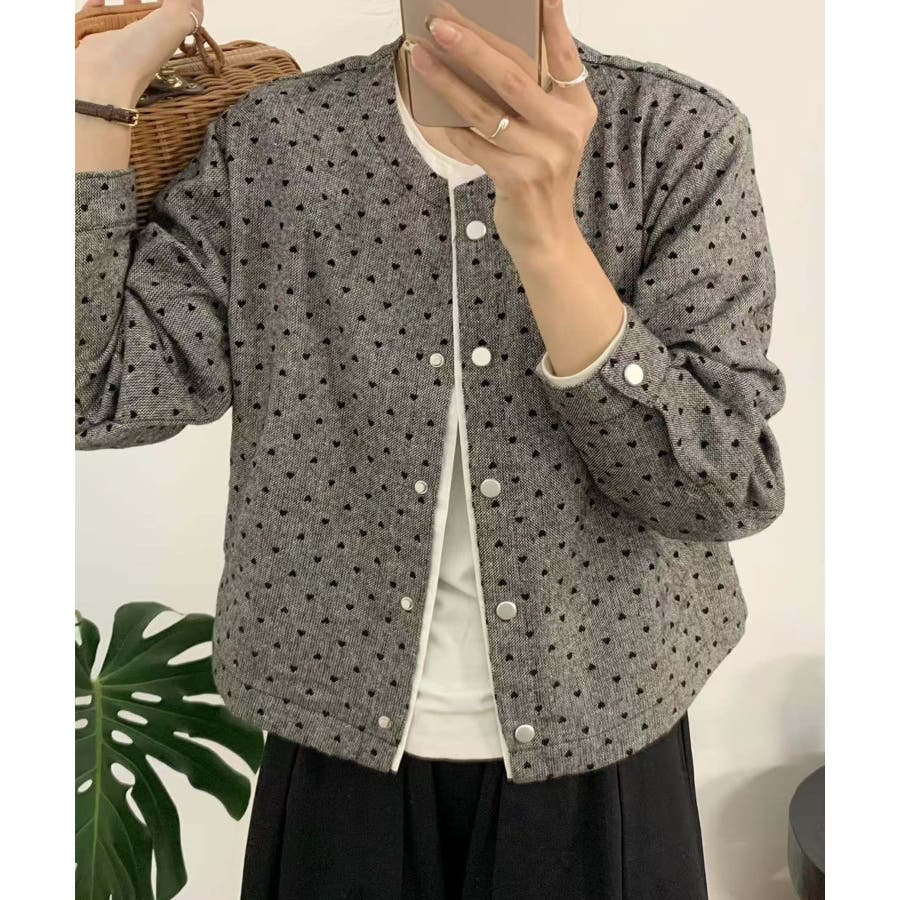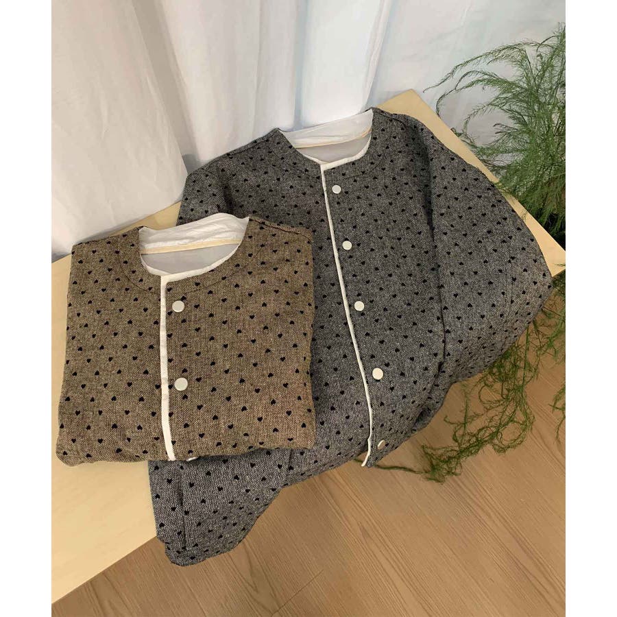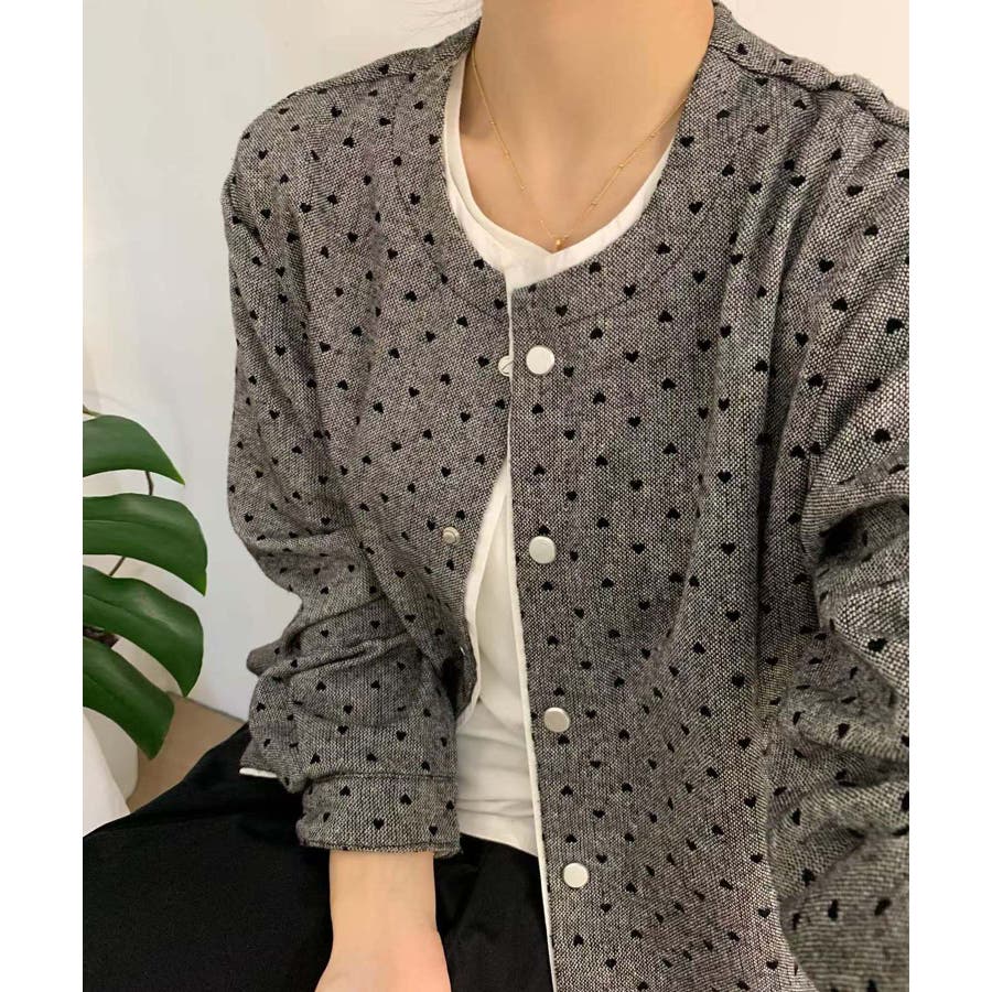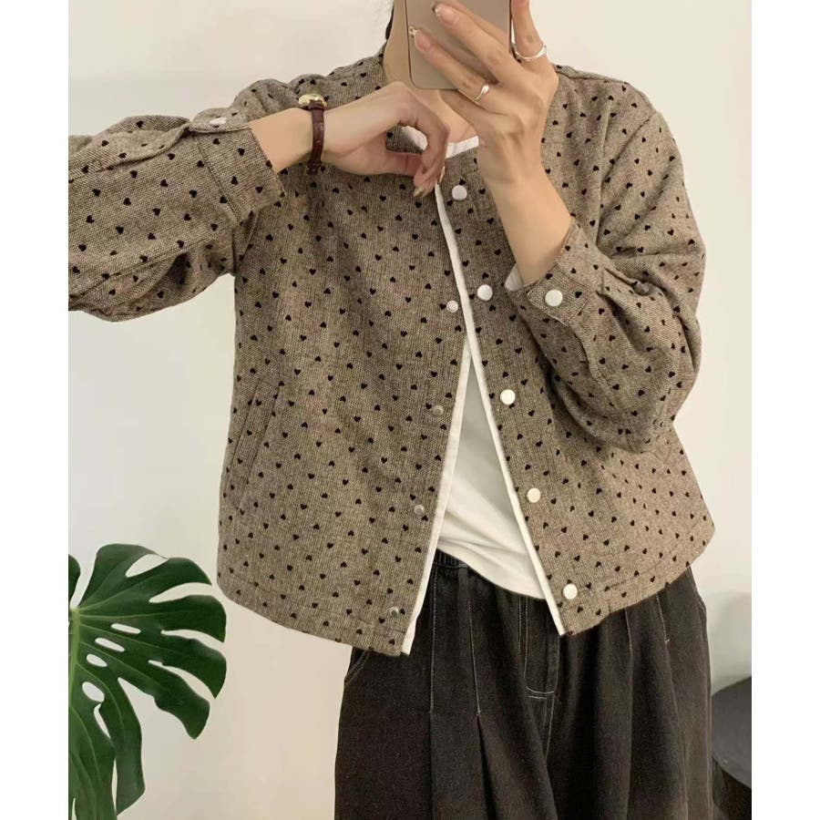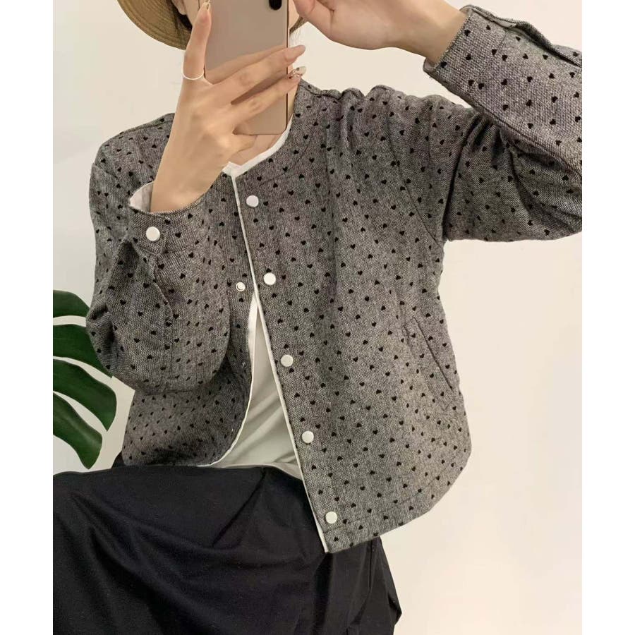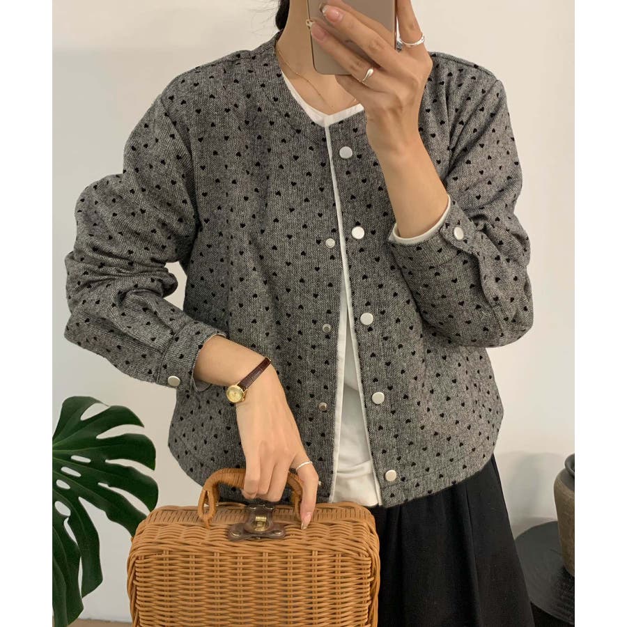 ■デザイン落ち着いた色味とドット柄が調和したコットンジャケット。ノーカラーデザインで、すっきりとした首元が魅力的です。フロントボタン仕様で着脱が簡単。シンプルながらも上品な雰囲気が漂い、カジュアルにもきれいめスタイルにも合わせやすい万能アイテムです。■素材柔らかな綿素材を使用し、肌触りが心地良い一枚。通気性に優れ、長時間着用しても快適さをキープできます。■コーディネートの提案・白いインナーとパンツを合わせて、清潔感のあるカジュアルスタイルを楽しむ。・タイトスカートやフラットシューズと合わせて、エレガントな印象を演出。 ・デニムやスニーカーで、リラックス感のあるデイリーコーデに。