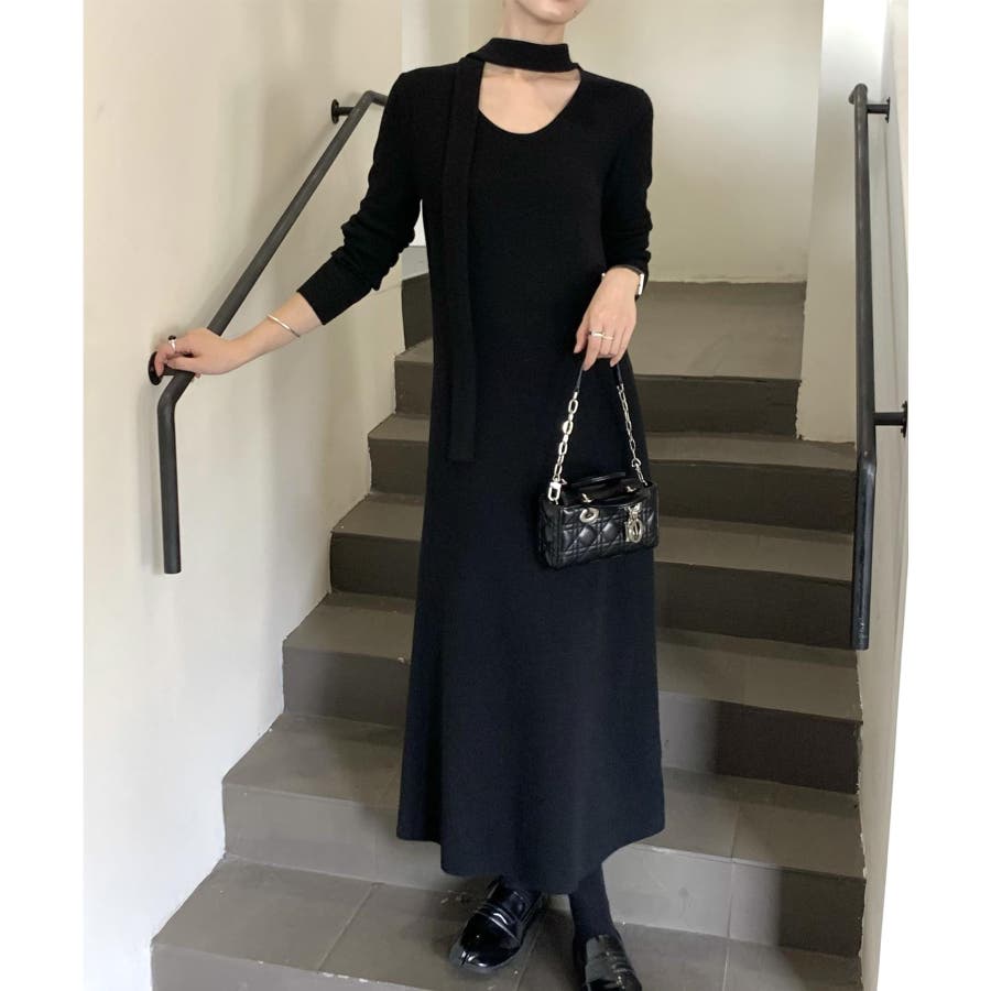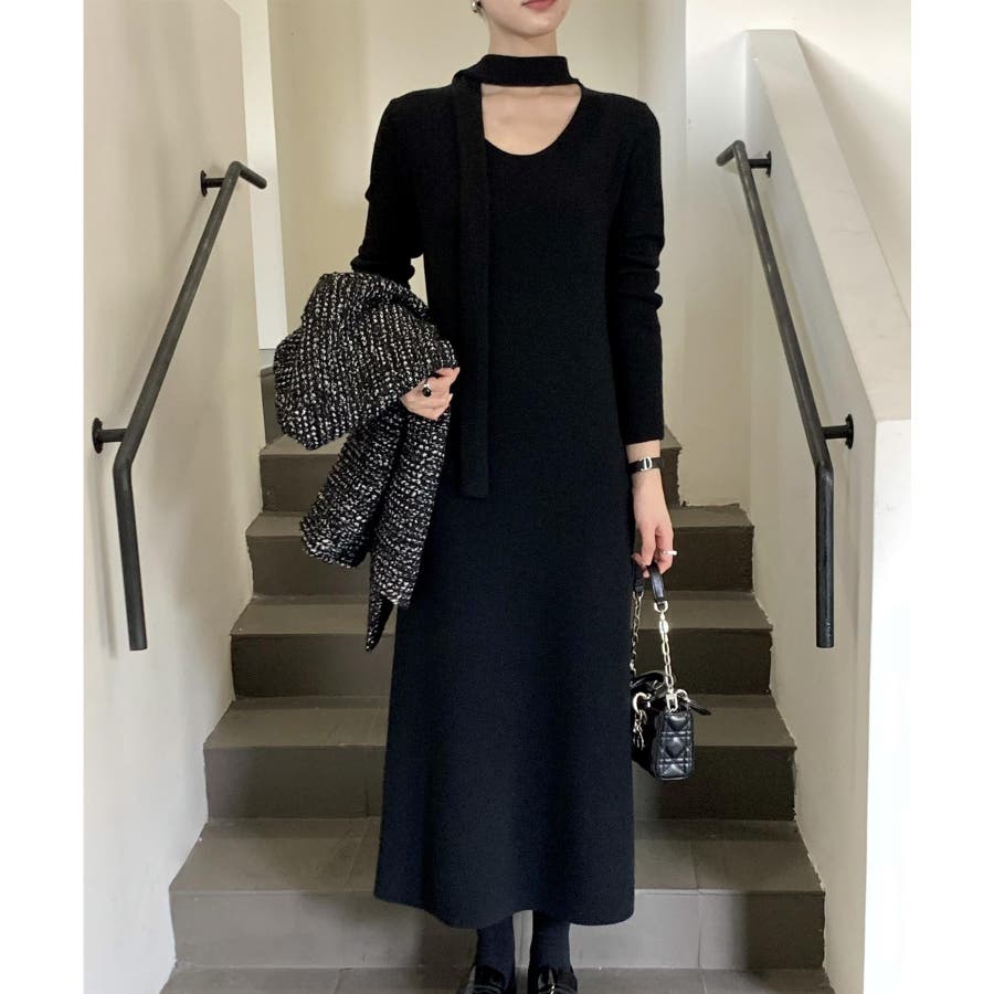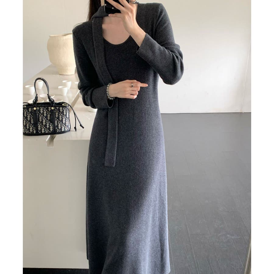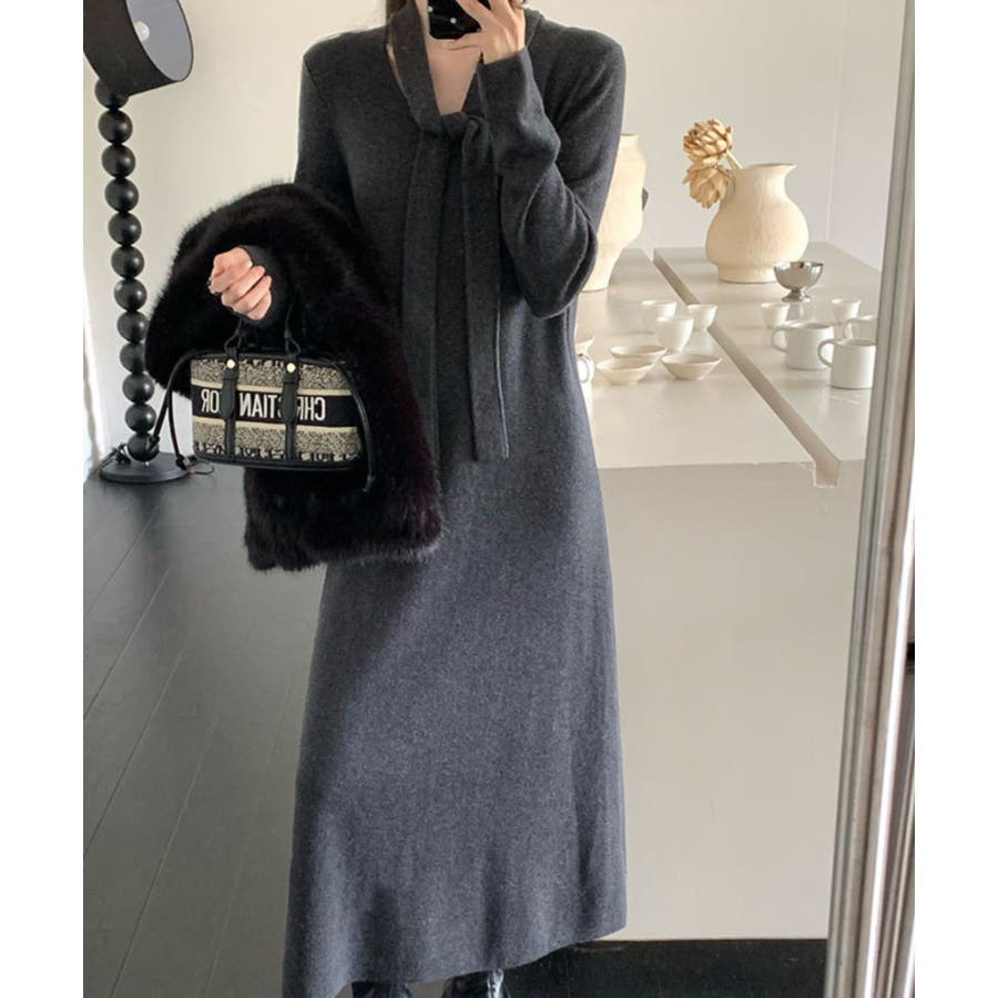 シンプルなデザインにワンポイントにタイをプラスした、上品なニットワンピース。1枚でサマのなる万能アイテム。ボウタイをリボン結びにしても◎結び方次第で様々なスタイルを楽しむことができます。柔らかなニット素材が肌に優しく、秋冬のコーディネートにぴったりの一枚です。デートやお出かけ、オフィスシーンまで幅広く活躍します。
