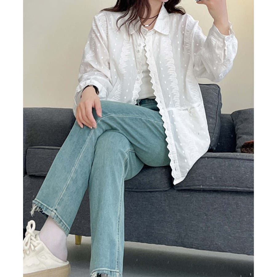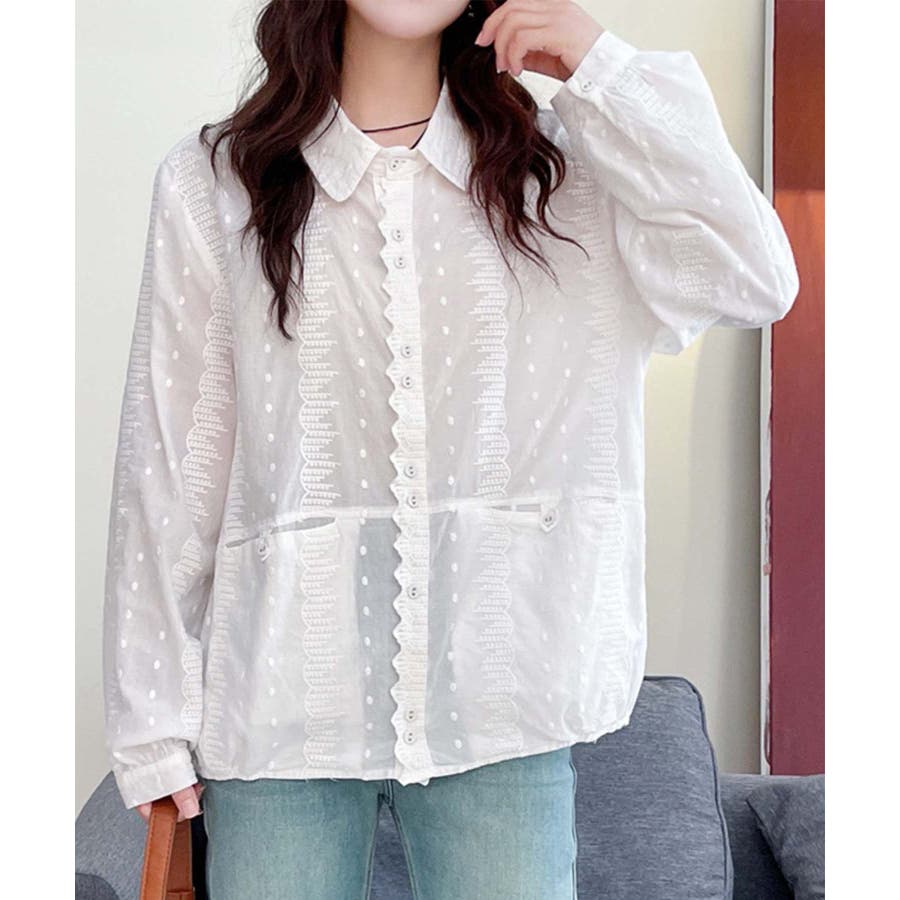 シアー感のある生地にドット柄とフリルのトリムデザインが特徴のシャツブラウスです。軽やかな生地感がシーズンムードを引き立て、前開きのボタン仕様で着脱が簡単。ゆったりとしたシルエットはリラックス感があり、ストレスフリーな着心地。レースディテールが上品さをプラスします。柔らかな綿素材を使用し、通気性が良く肌触りも快適です。長時間の着用でも心地よく、日常使いにぴったりなアイテムです。デニムパンツと合わせて、甘過ぎない大人カジュアルスタイルに。タイトスカートやフレアスカートと組み合わせて、フェミニンな印象を演出。カーディガンやジャケットを羽織り、レイヤードコーデにも対応可能。