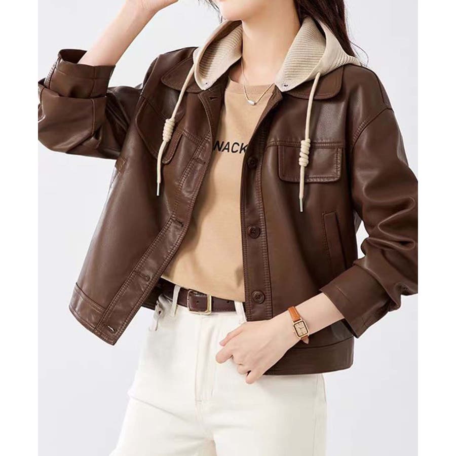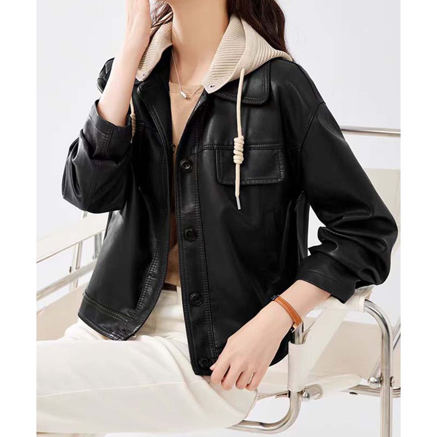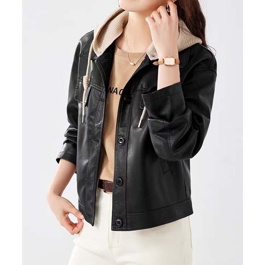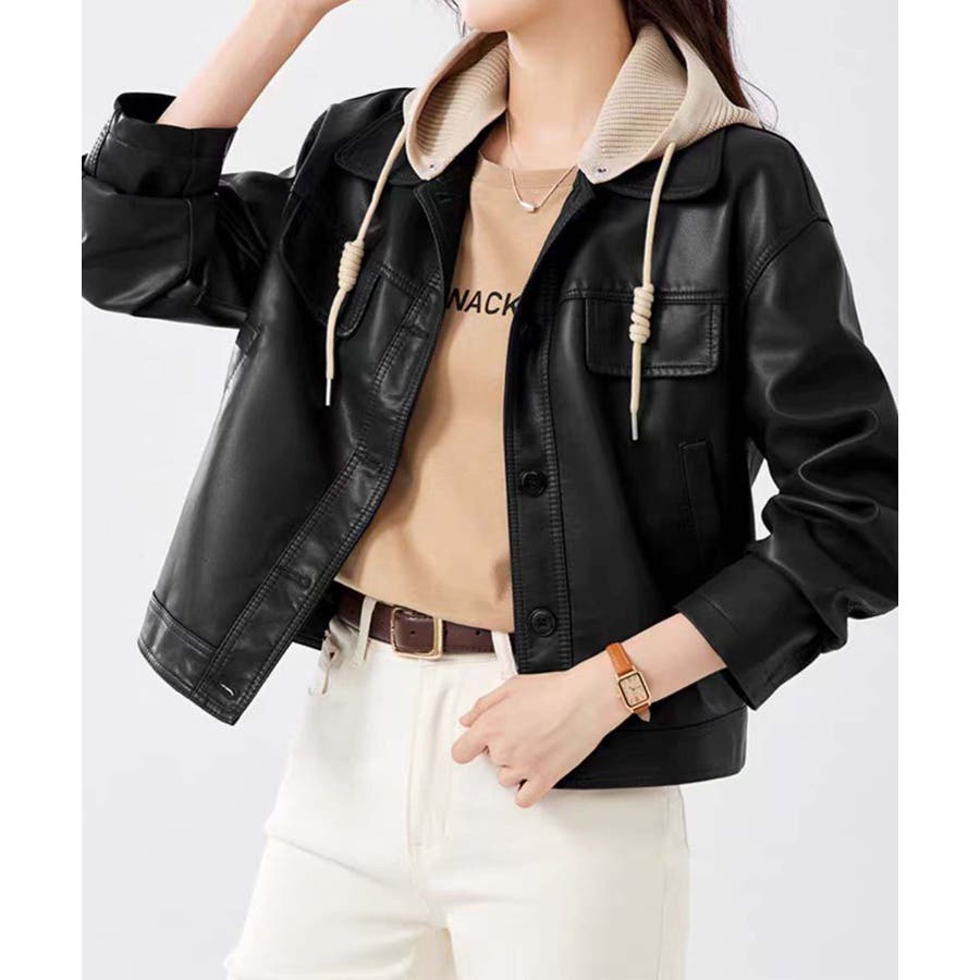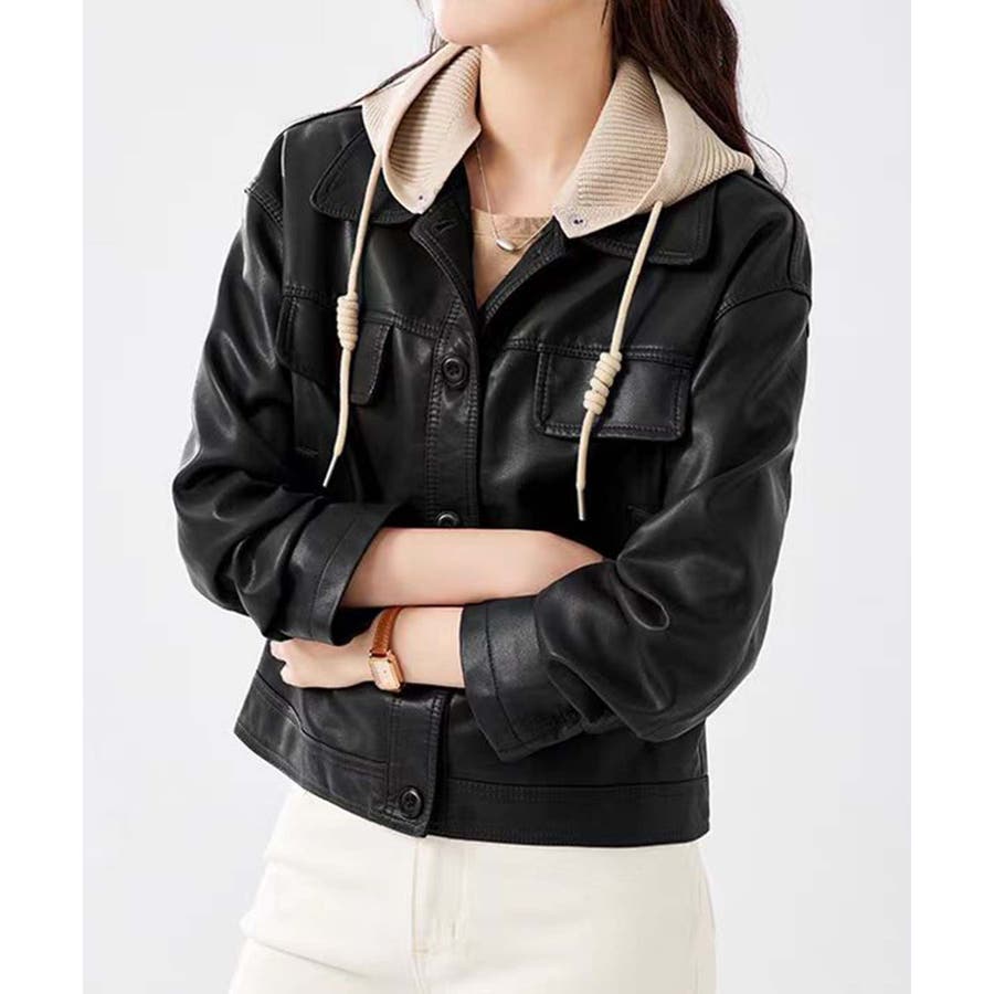 フード付きPUショートジャケット
