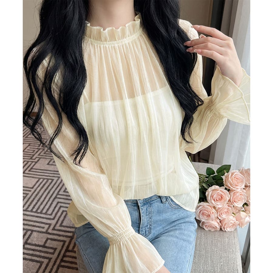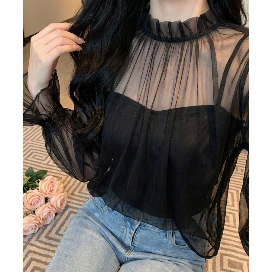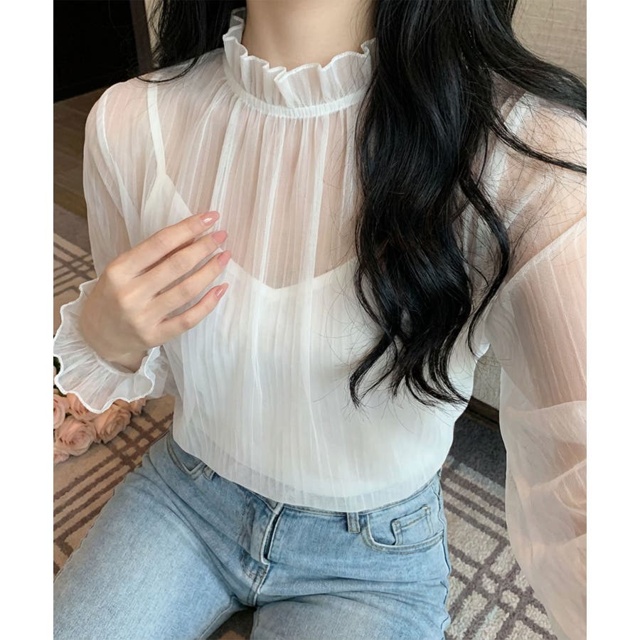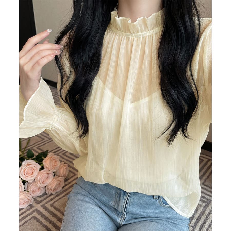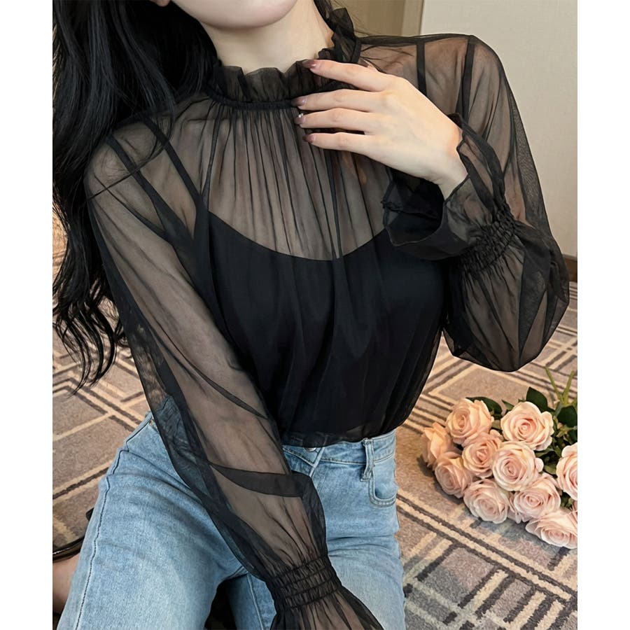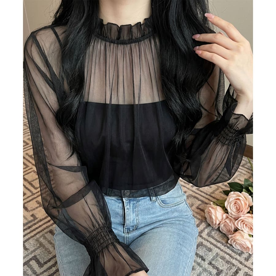 繊細な透け感が魅力の、シアー素材を使用したハイネックブラウス。首元と袖口に施したギャザーデザインが、女性らしく柔らかな印象を演出します。軽やかな素材感で、レイヤードスタイルに取り入れやすく、インナー次第で雰囲気を変えられるのもポイント。キャミソールやビスチェと合わせたフェミニンな着こなしはもちろん、ジャケットやニットのインナーとしても活躍します。甘すぎないデザインで、きれいめから韓国テイスト、モード寄りのスタイリングまで幅広く対応。コーディネートに抜け感をプラスしてくれる一枚です。