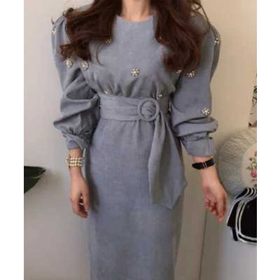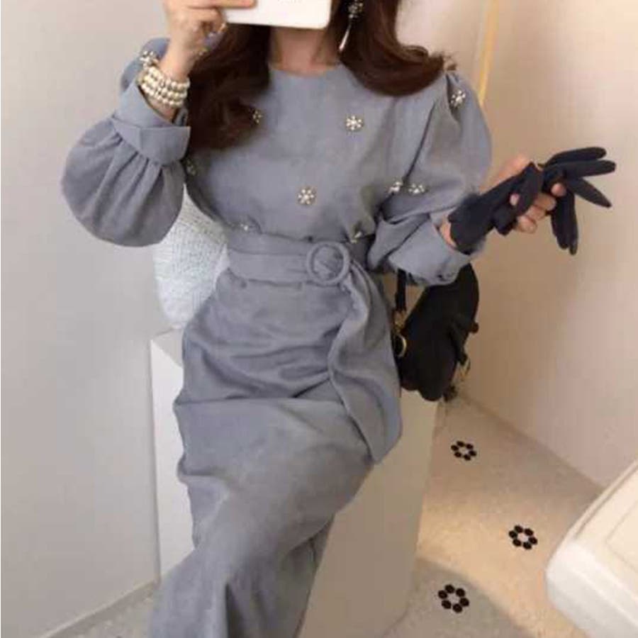 キーワード:長袖 ロング丈 丸首 クルーネック ミモレ丈 ビジュー エレガント 上品 高見え フェミニン 10代 20代 30代 40代 50代 韓国ファッション 冬 冬服 秋服 お呼ばれ 二次会
