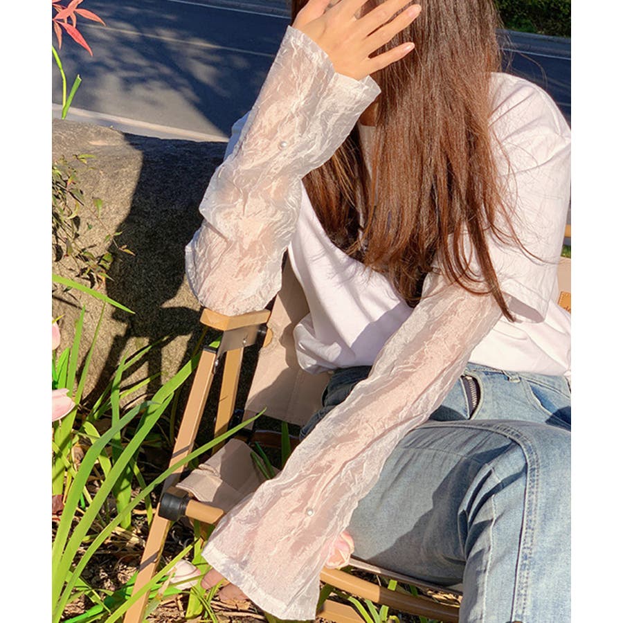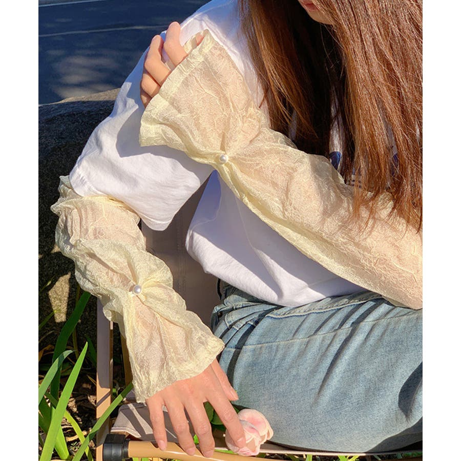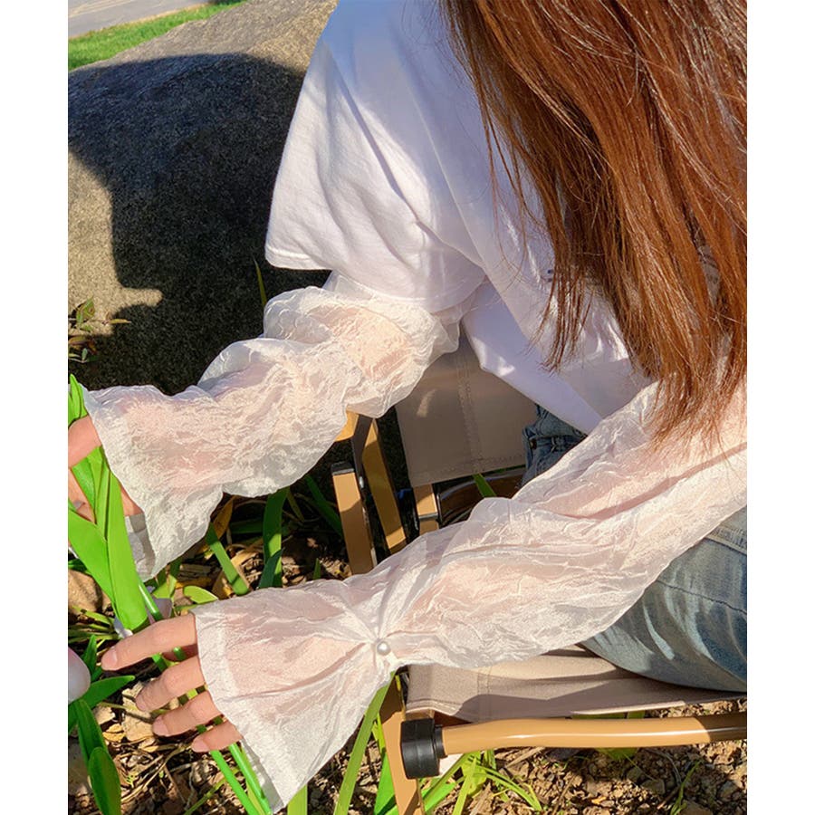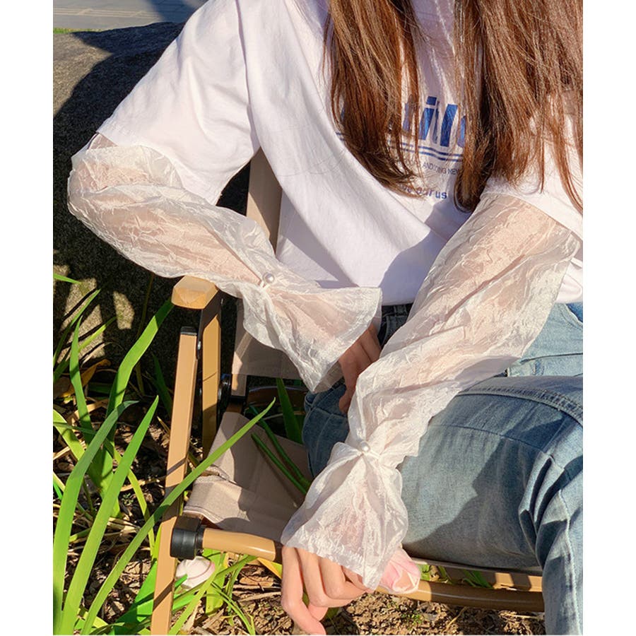 紫外線対策にぴったりのシアーのスリーブです。透け感が可愛く、Tシャツや半袖シャツなどと合わせるとかわいいです!アーム側にはゴムが付いているので二の腕あたりで止まります。おしゃれなスリーブでコーディネートの幅が広がりそう!