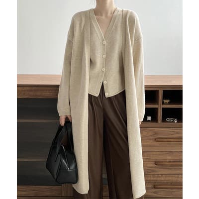 シンプルなニットベストとロングカーディガンのセットで、オンオフ問わず活躍間違いなし