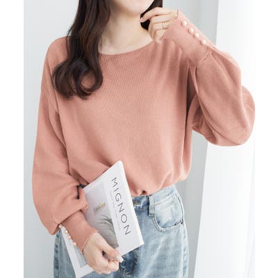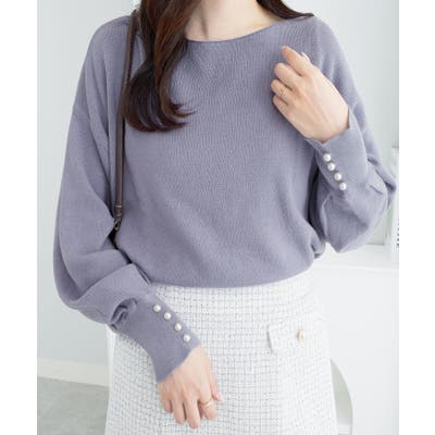 ボートネック×袖パールの上品トップス パール調ボタン付ミラノリブニット