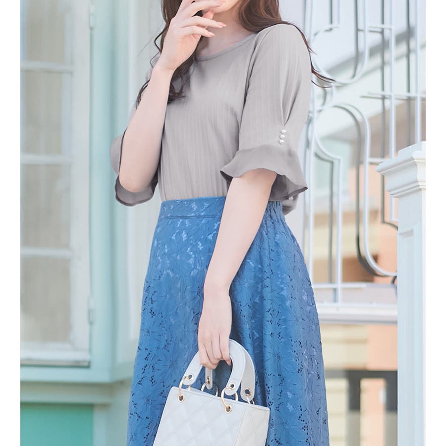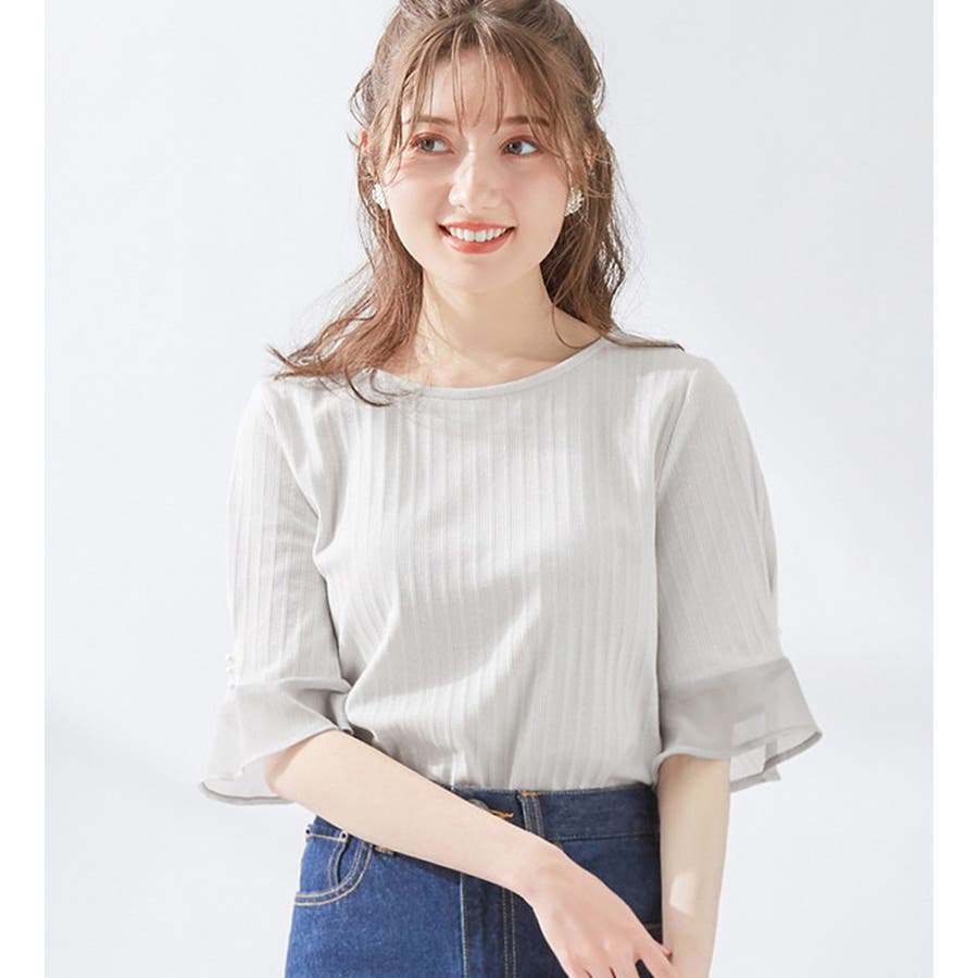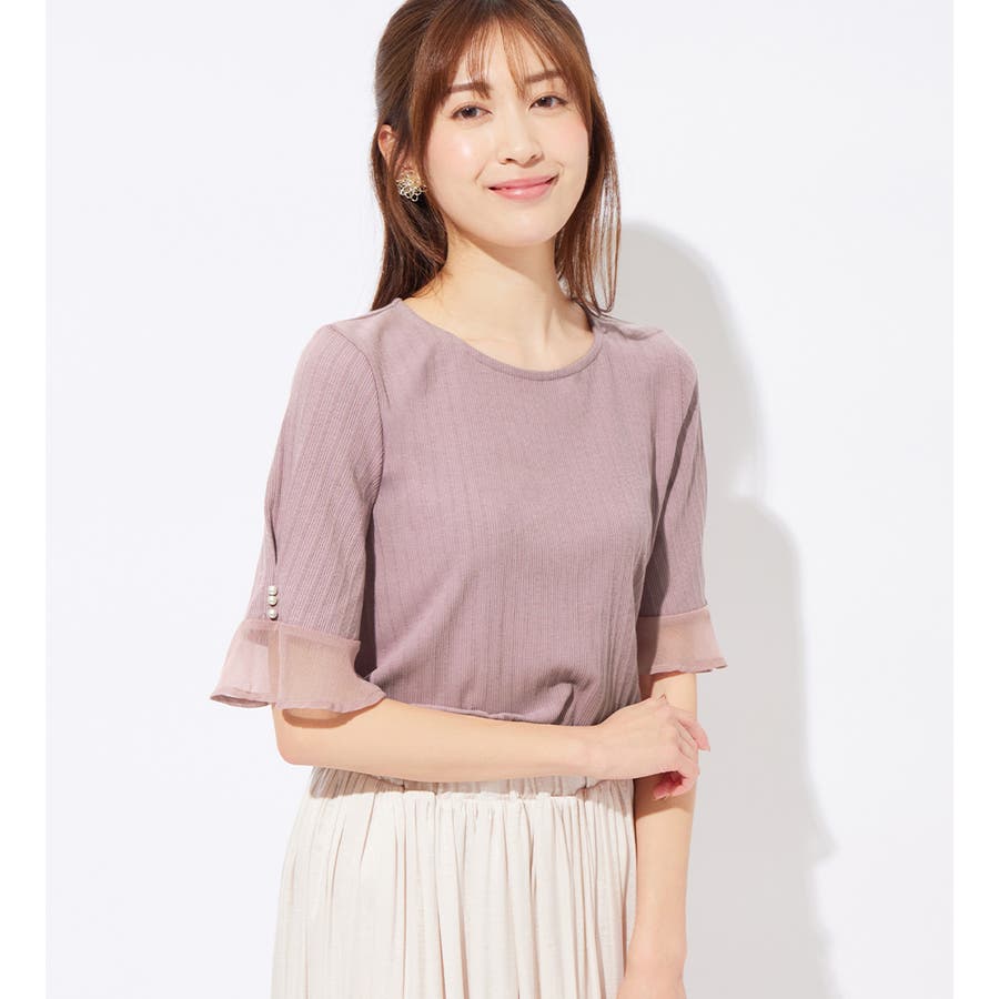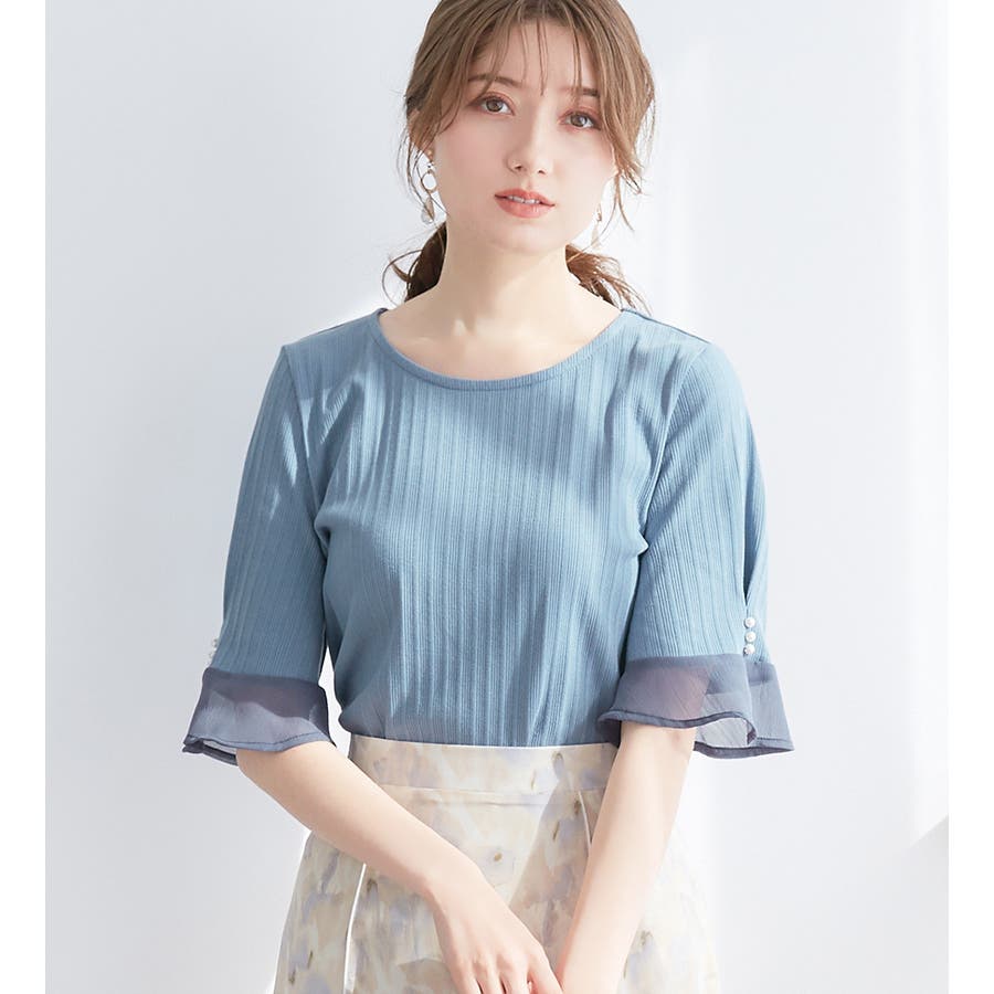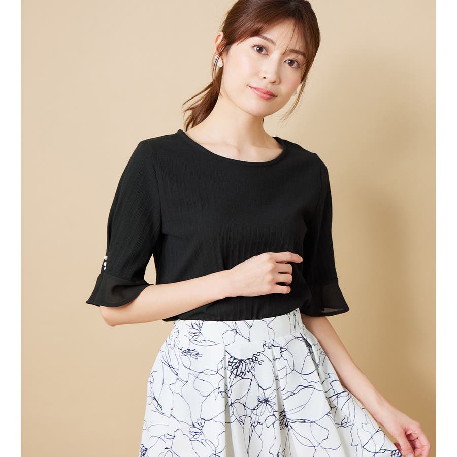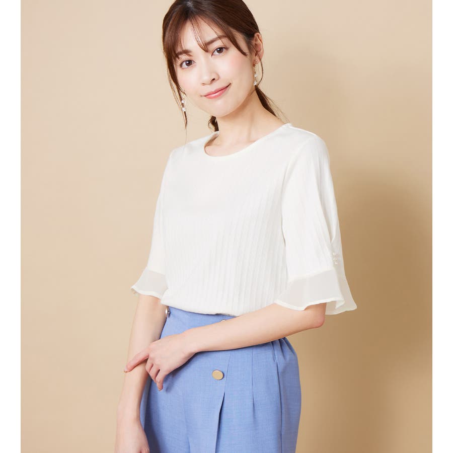 袖口のシフォン×パール調ボタンがほんのり甘い印象に。