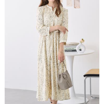 ぱっと目を惹く中花柄がフェミニンなフレアーワンピース。