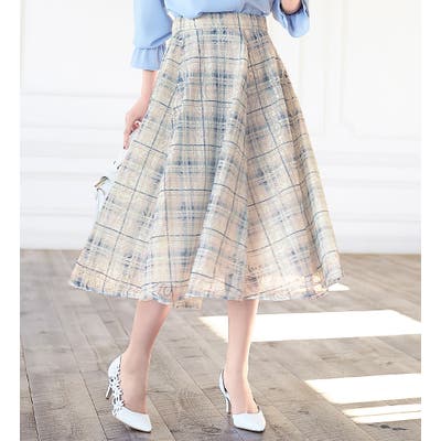 繊細な花柄レース×配色チェック柄で上品レディな印象のフレアースカート。
