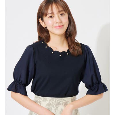 スカラップの衿元にパール調ボタンを施した、フェミニンなトップス。