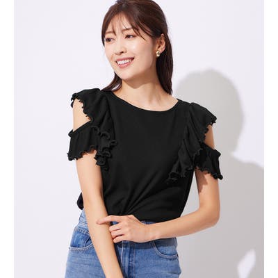 オープンショルダー×フリル袖デザインのフェミニンカットソー。