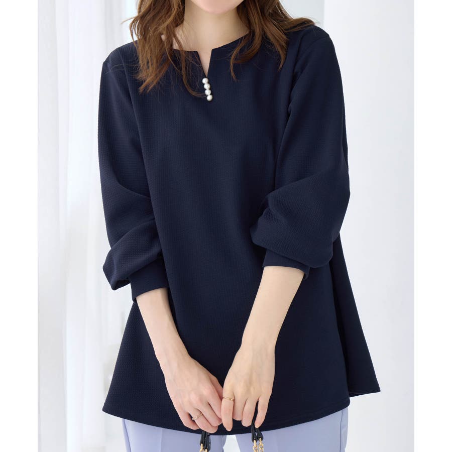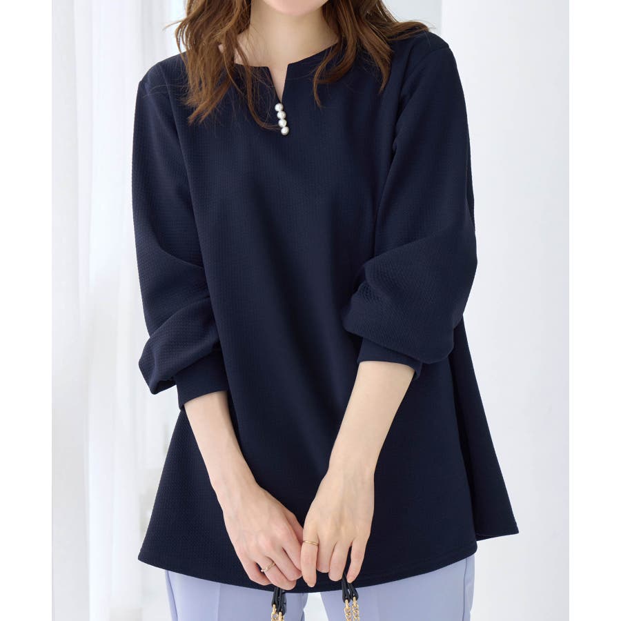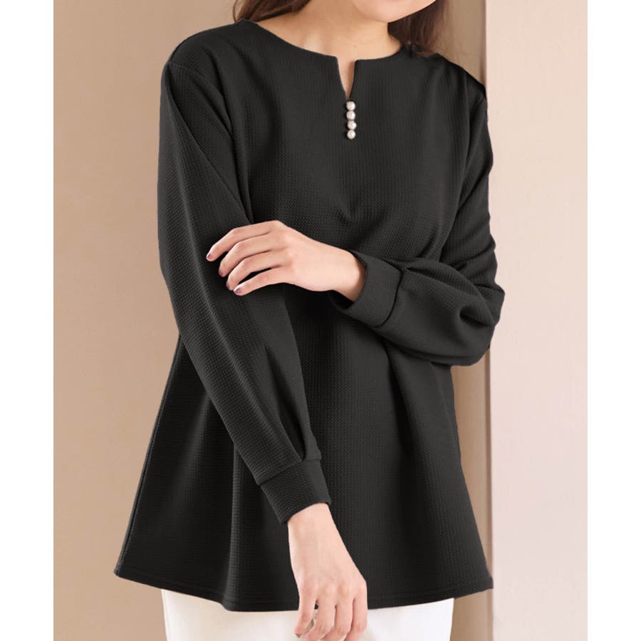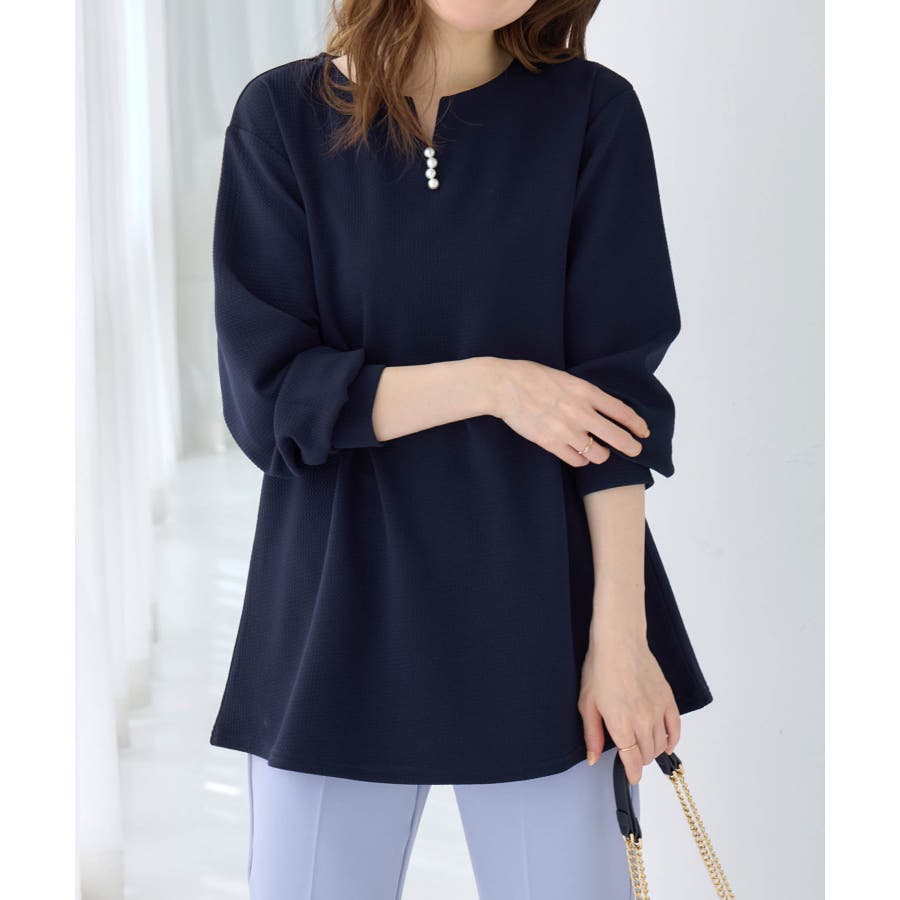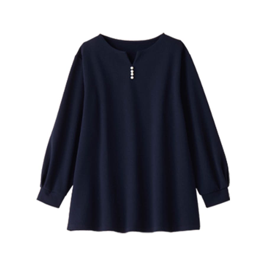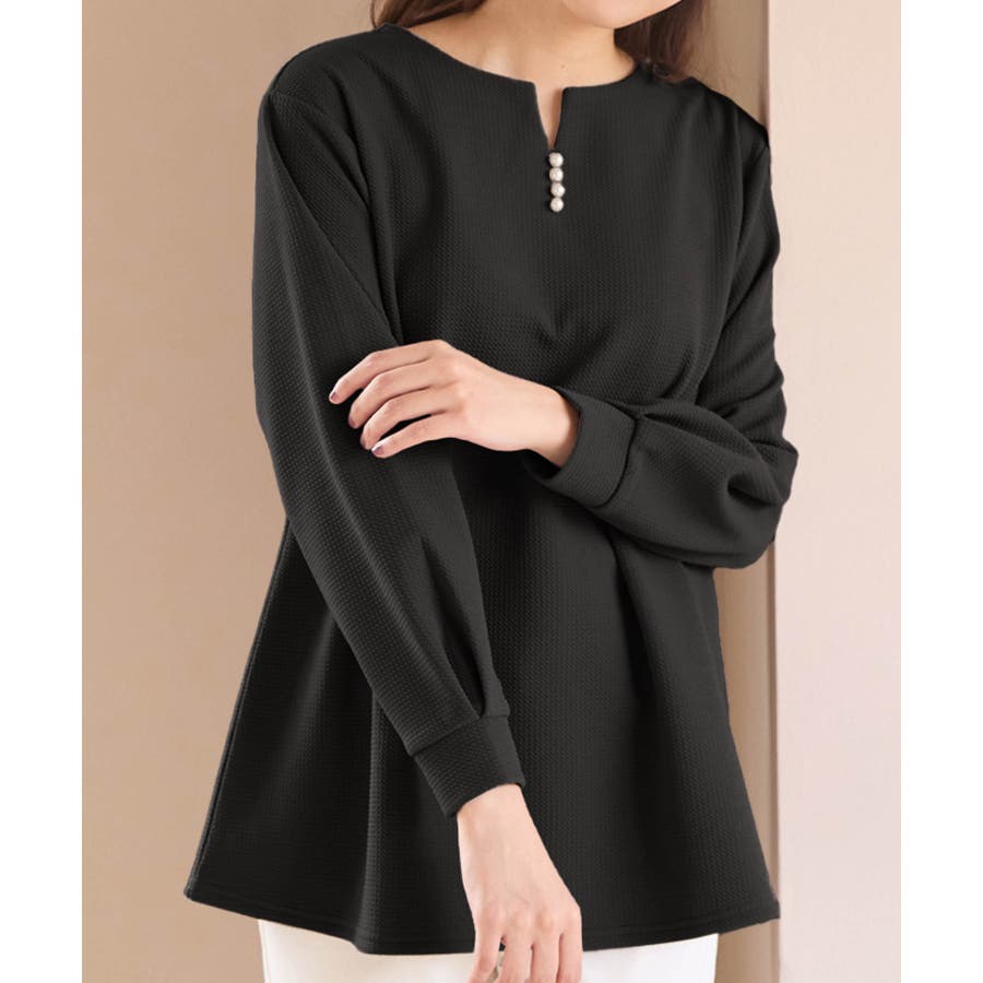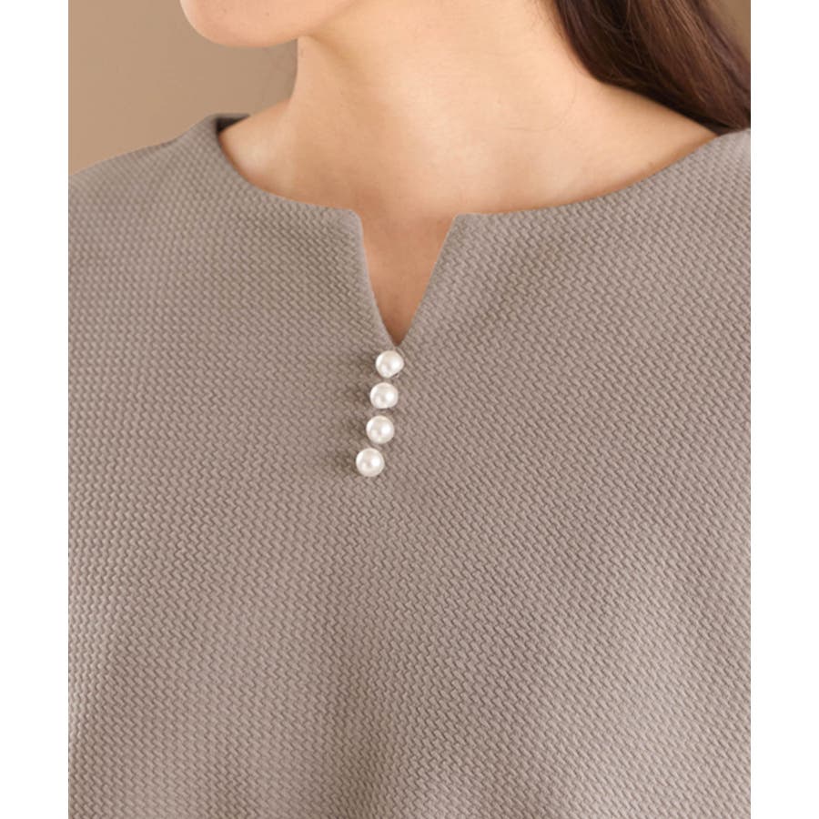 ・すっきりとしたキーネックにパール調ボタンで衿元にアクセント♪