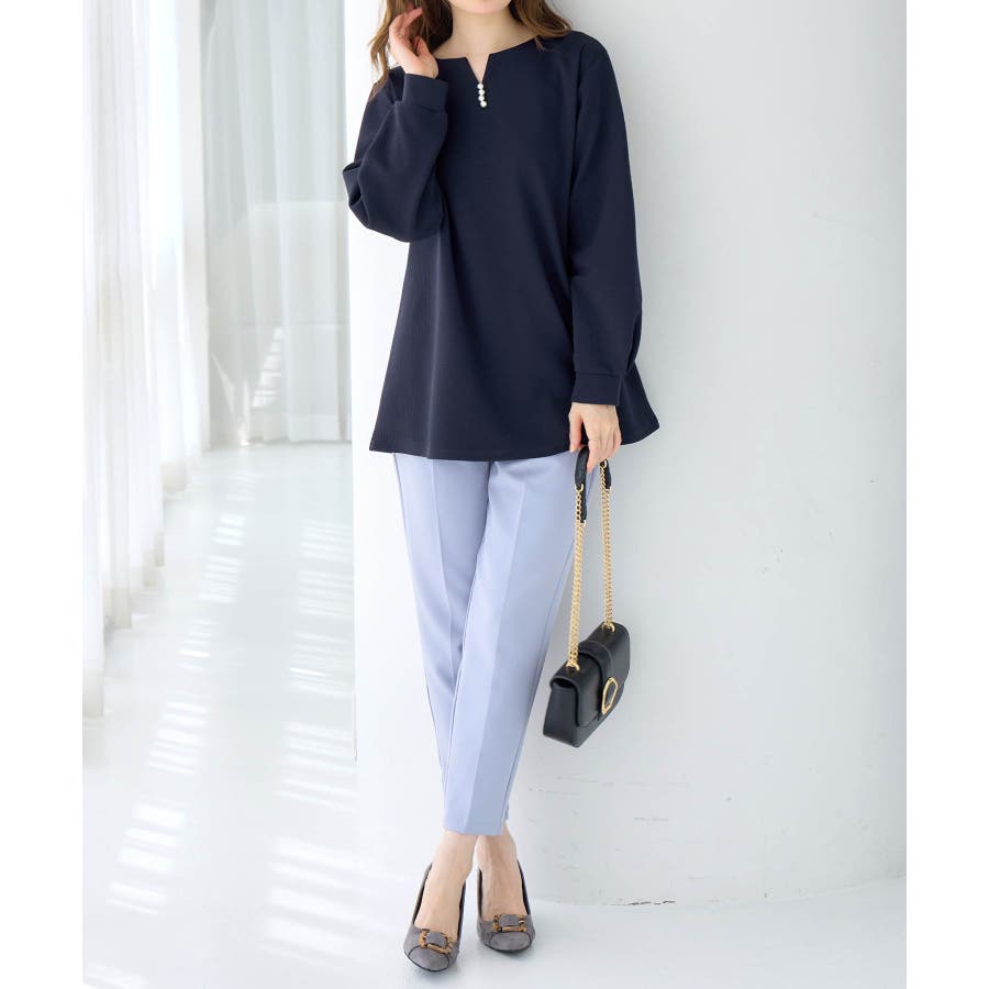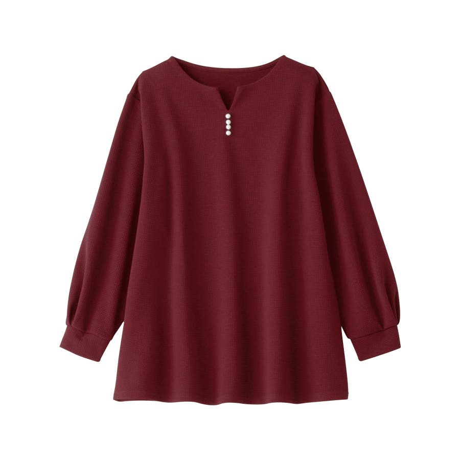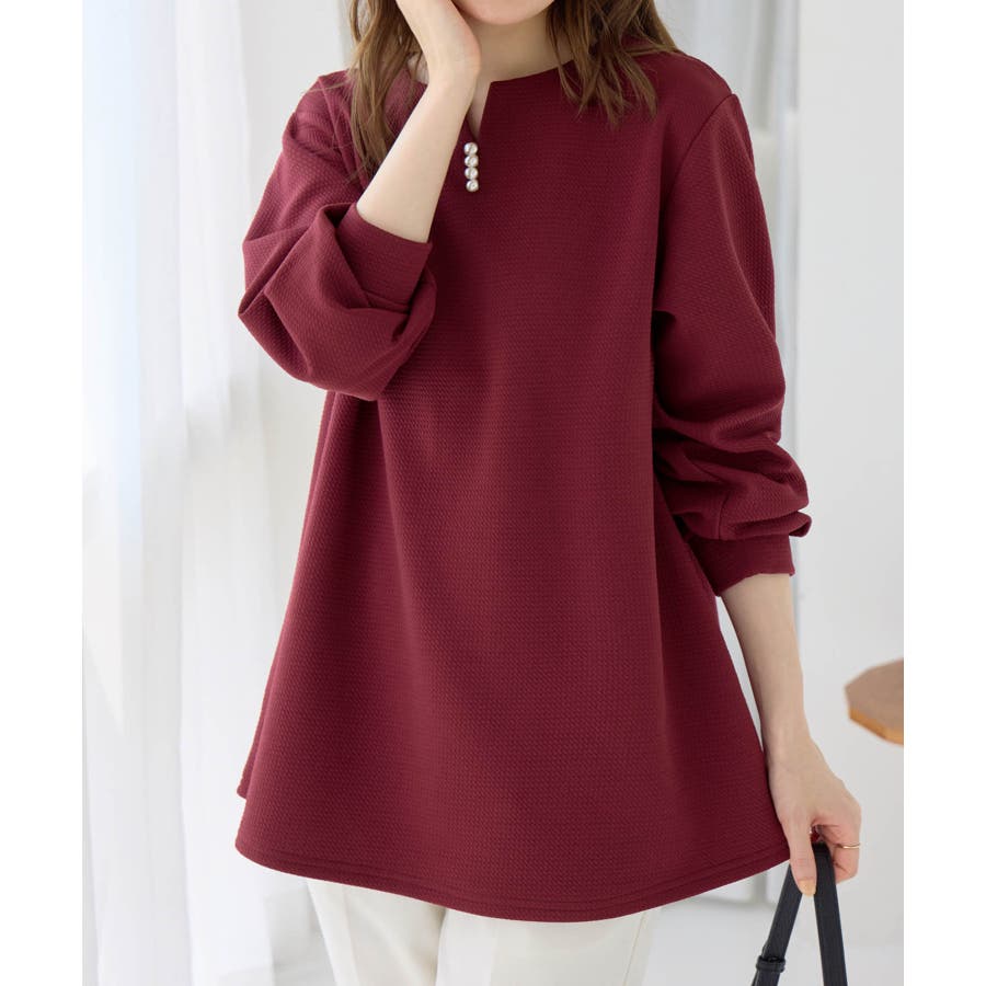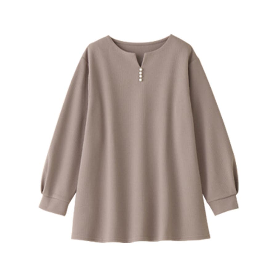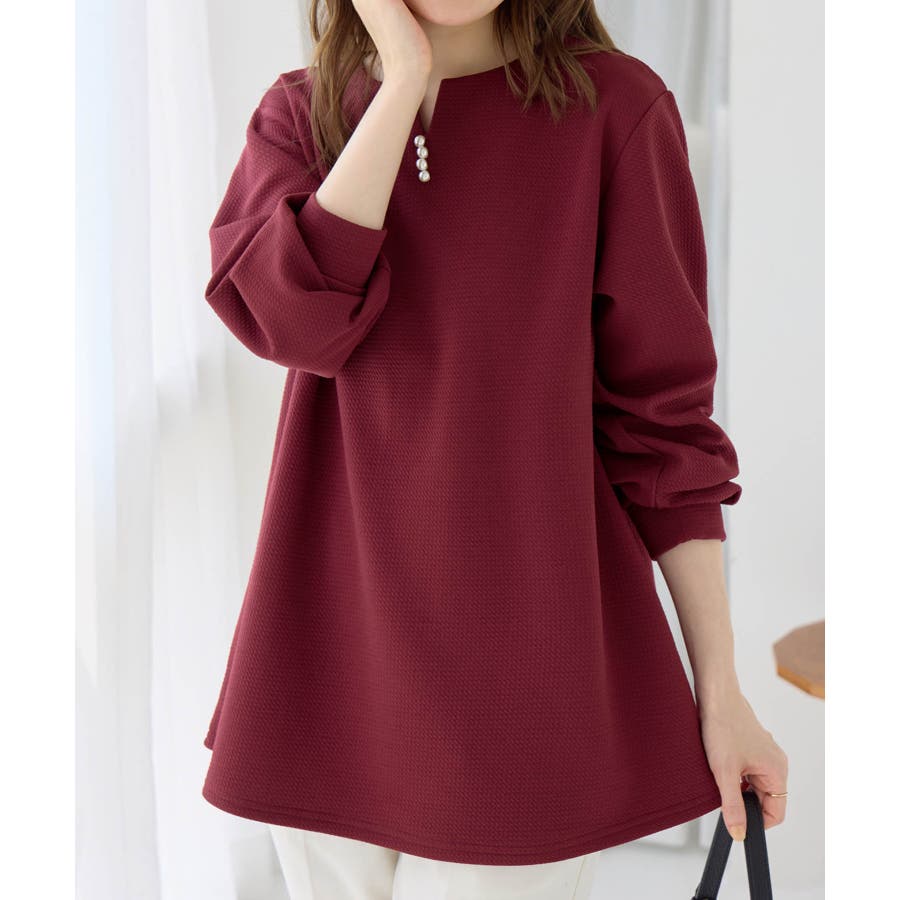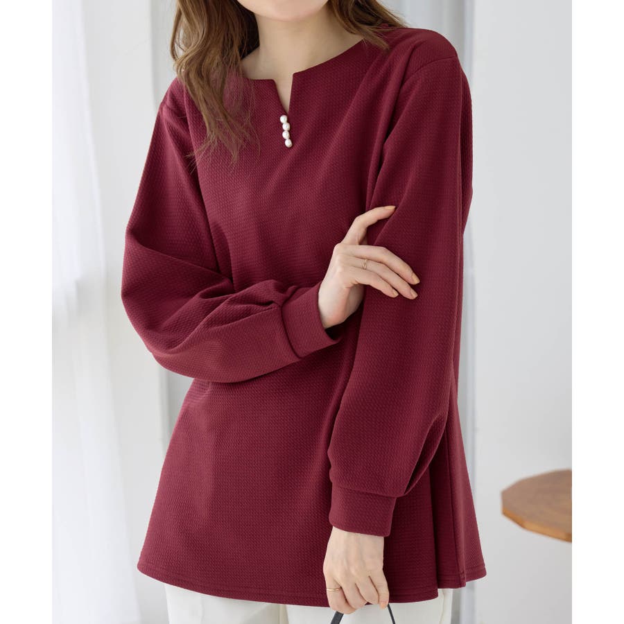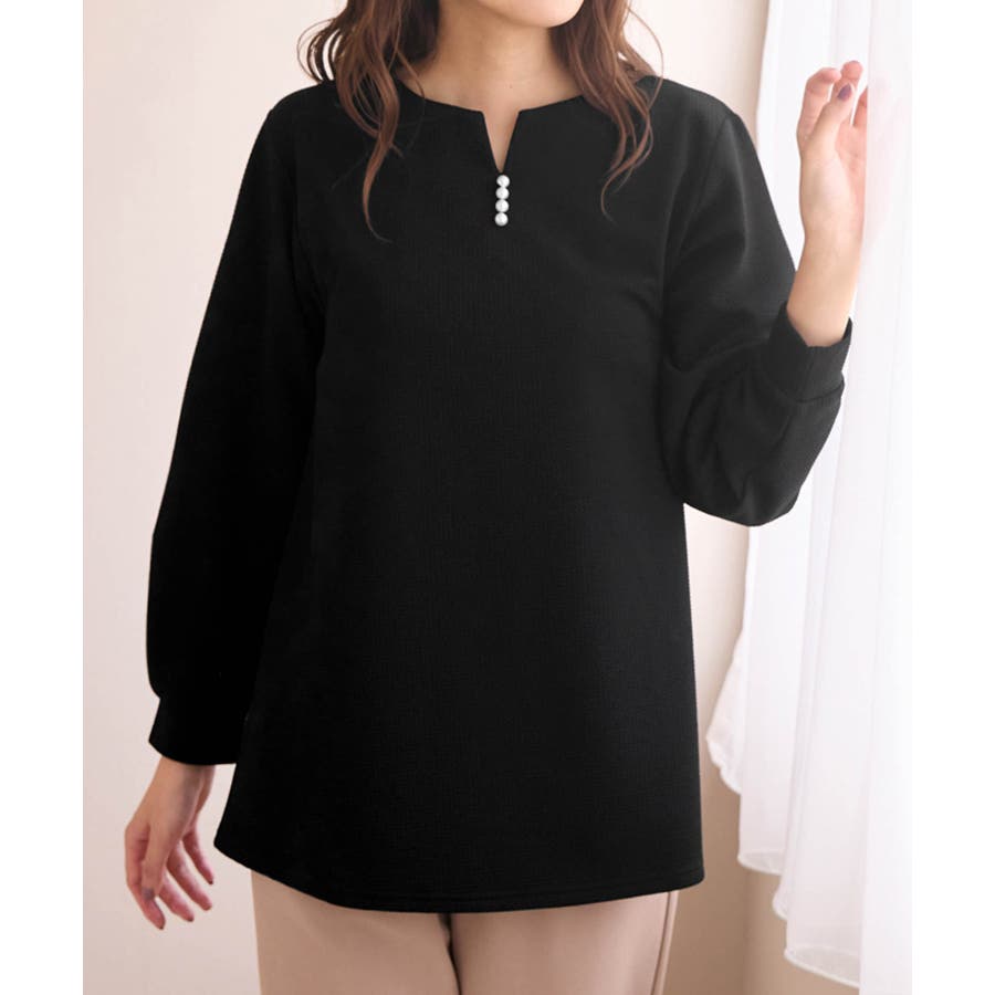 ・すっきりとしたキーネックにパール調ボタンで衿元にアクセント♪