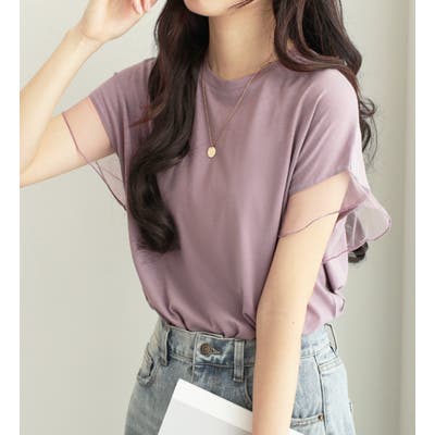 ・袖先に透け感のあるチュール素材をドッキングしたこなれTシャツ。