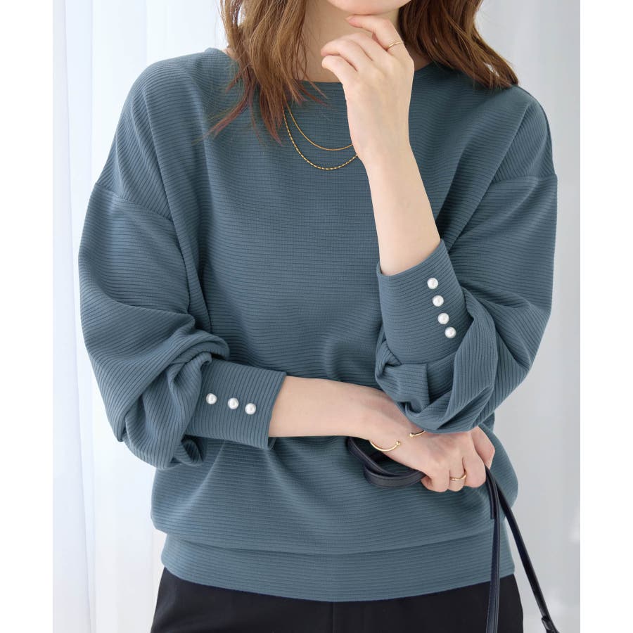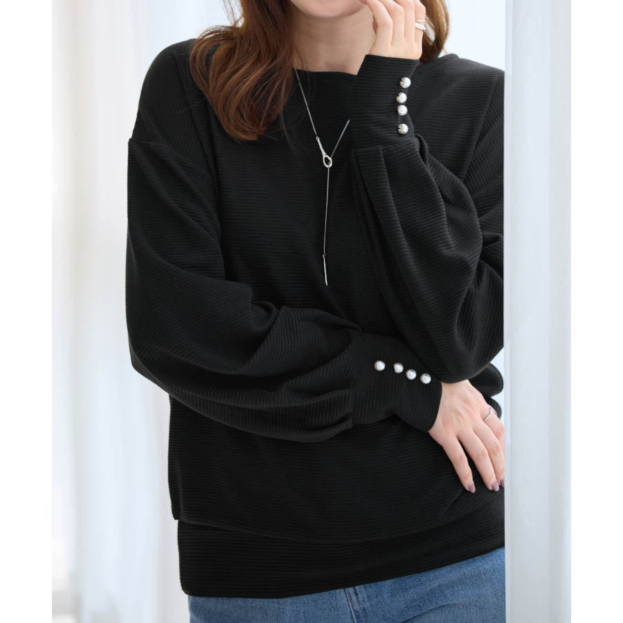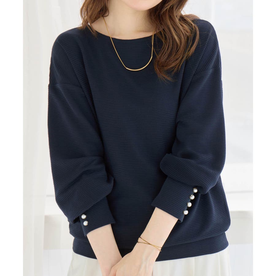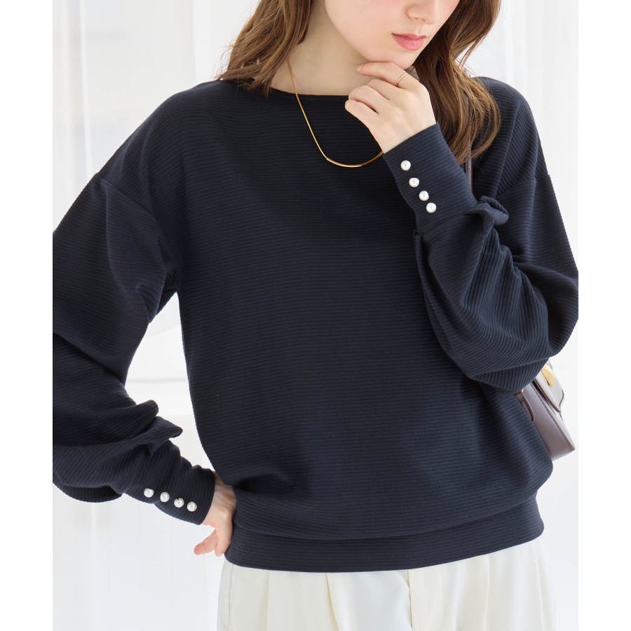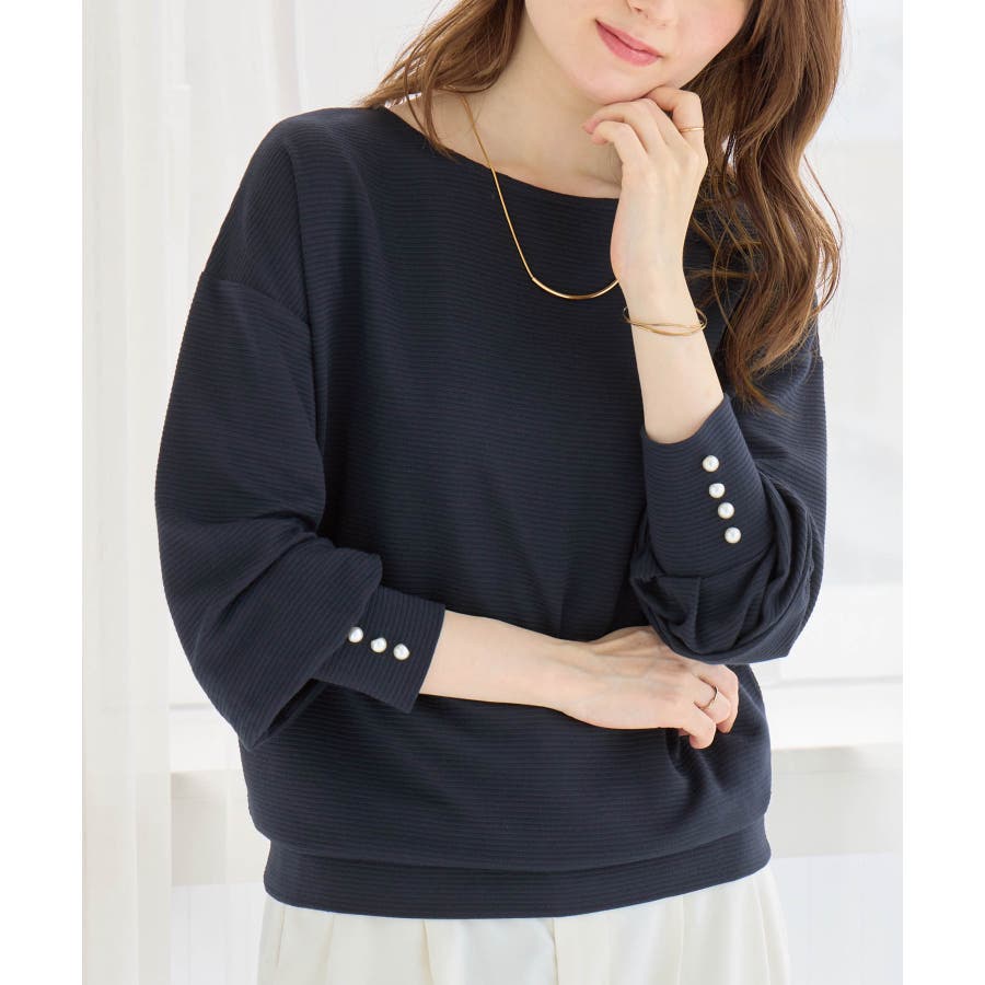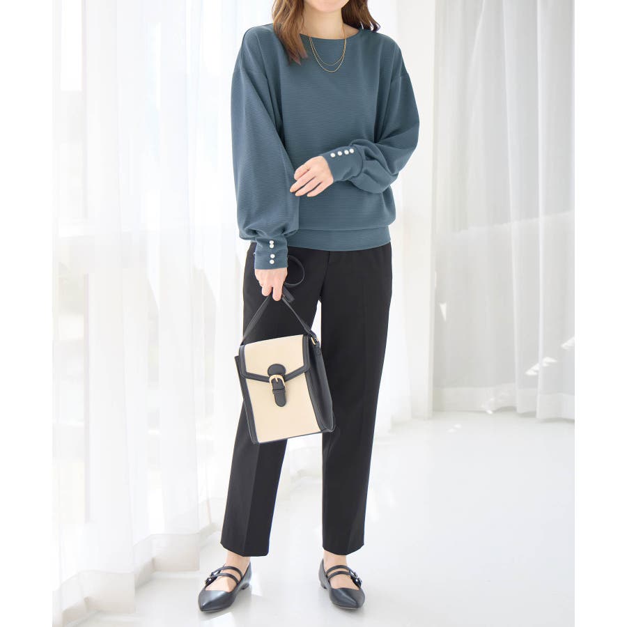・シンプルなトップスデザインに、袖口のパール調ボタンが上品なアクセント。